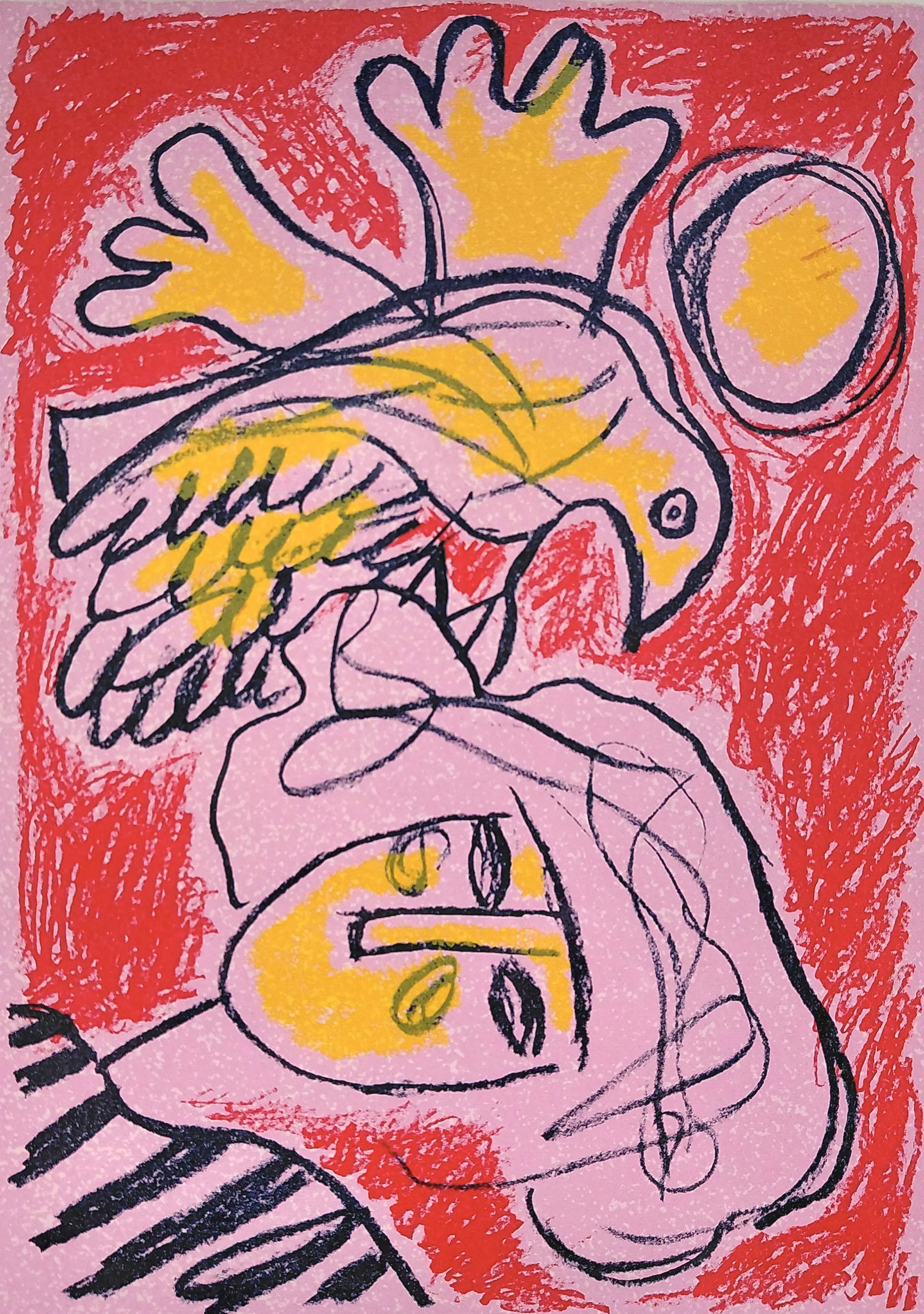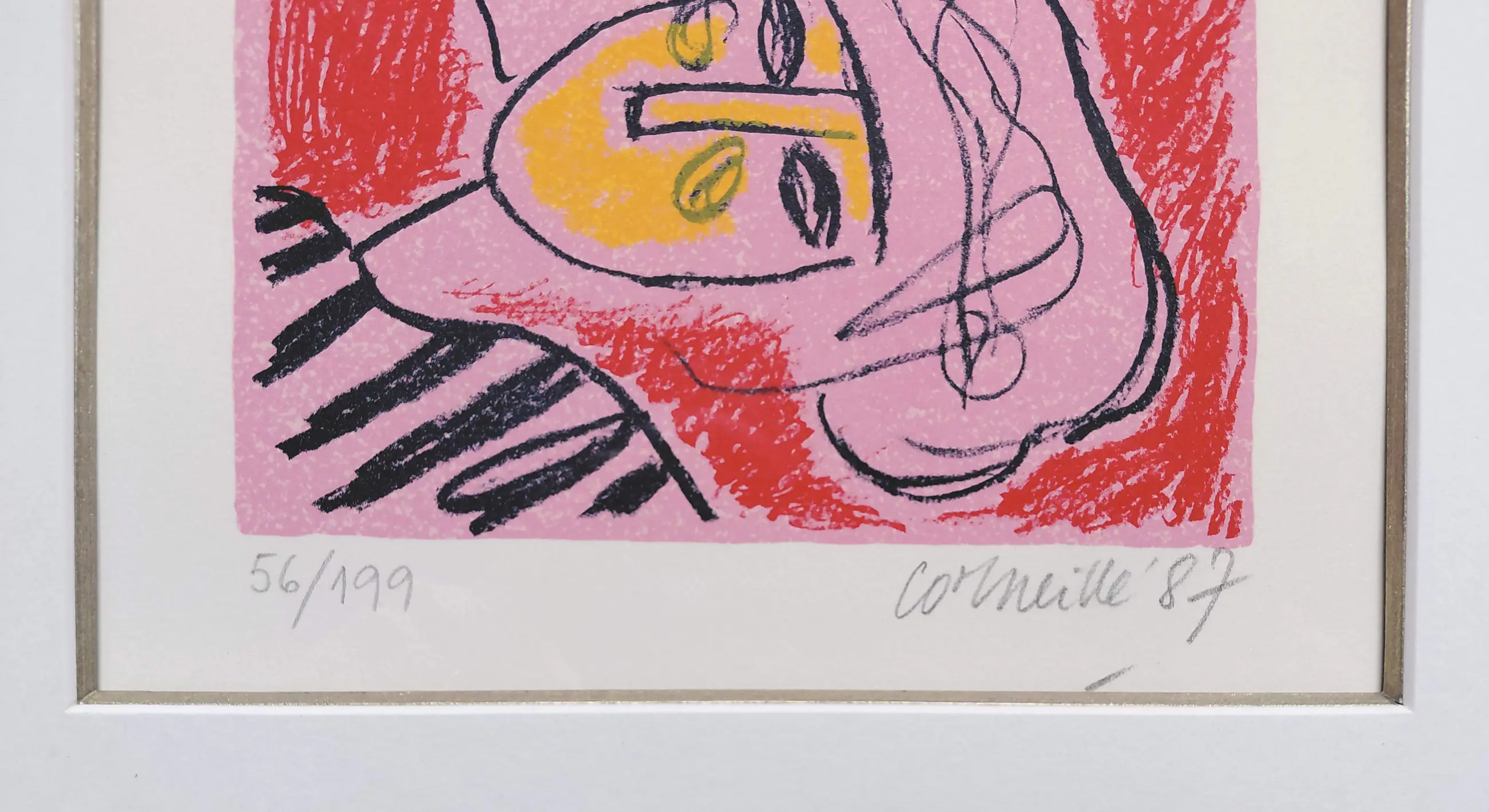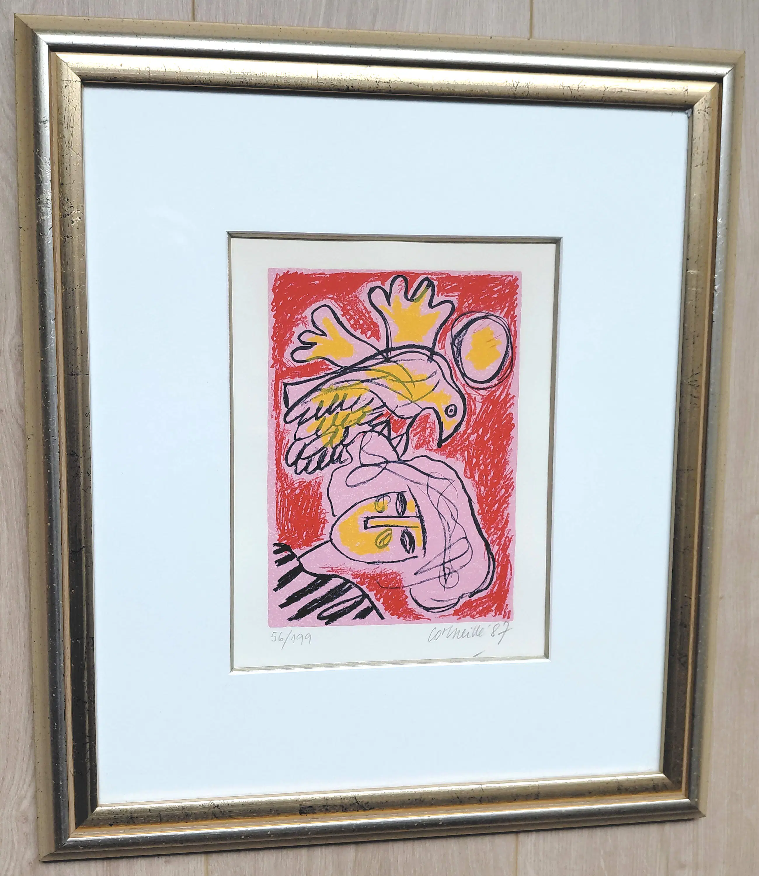 Zeer mooi werk van Corneille uit 1987. Zeefdruk op geschept papier, met potlood gesigneerd, gedateerd en genummerd (56/199). Prachtig ingelijst door Encadreur Eduard van Hulsen (Amsterdam), achter glas en luxueus, zuurvrij passe-partout. Alles in uitstekende conditie.