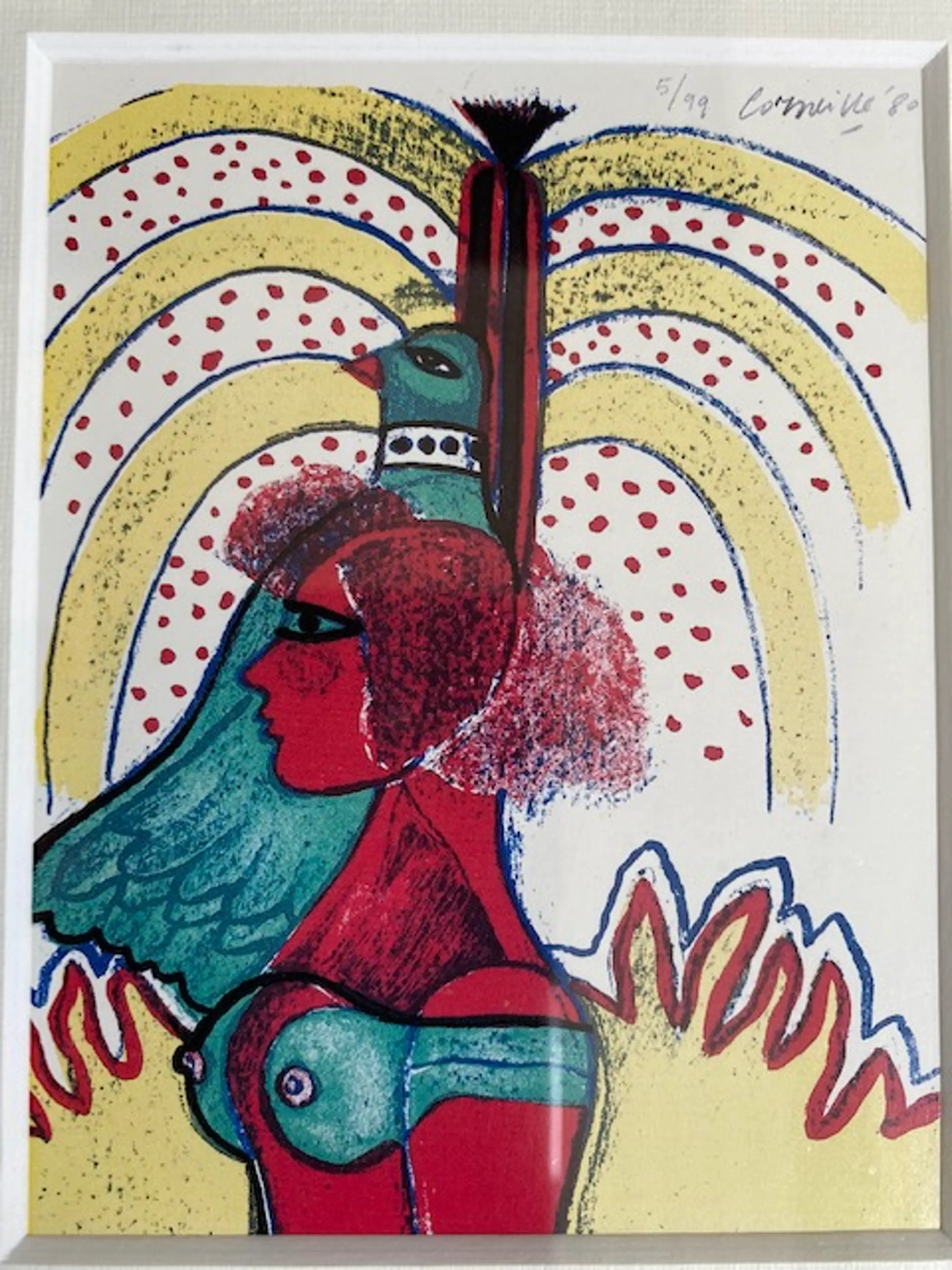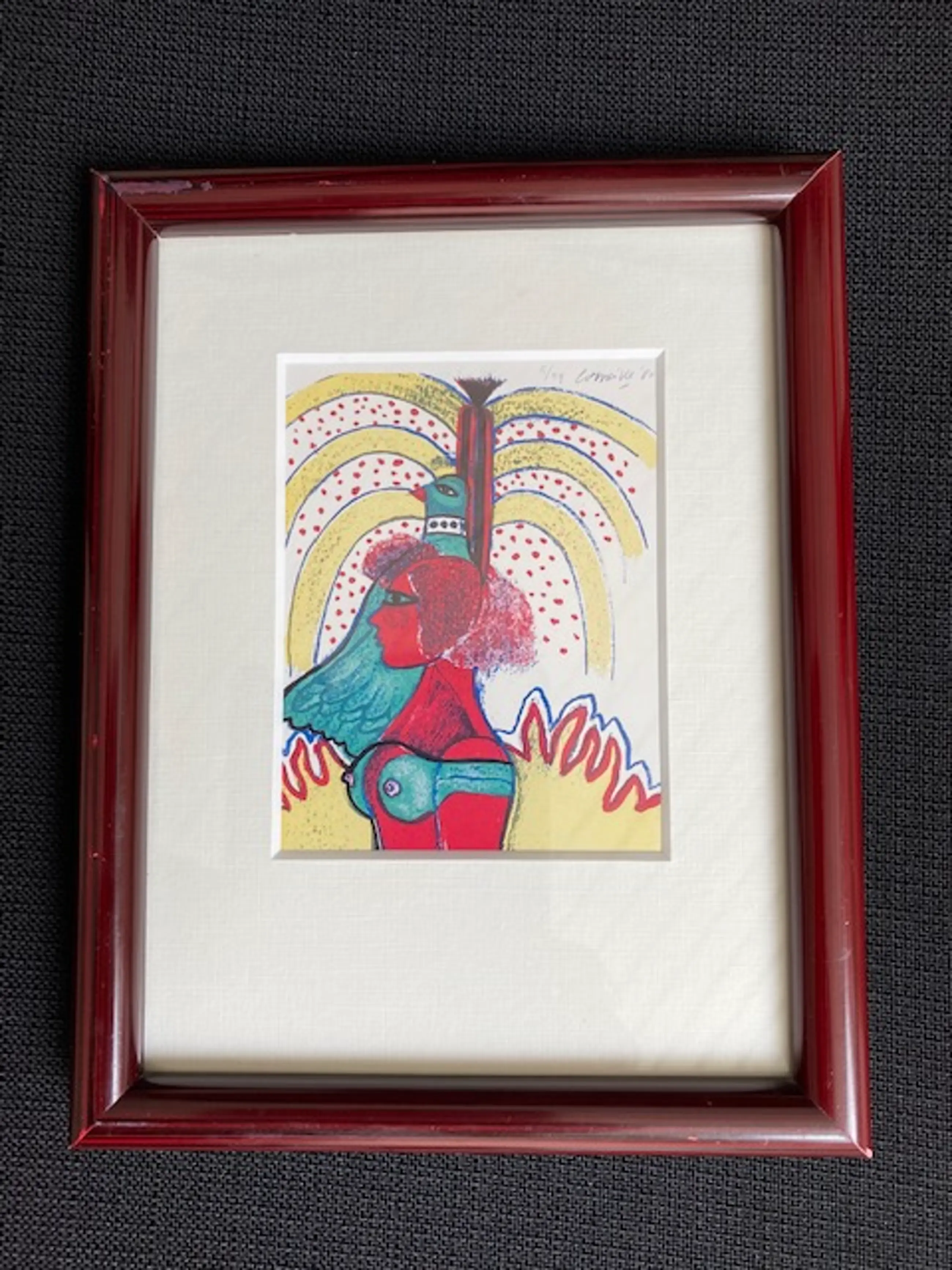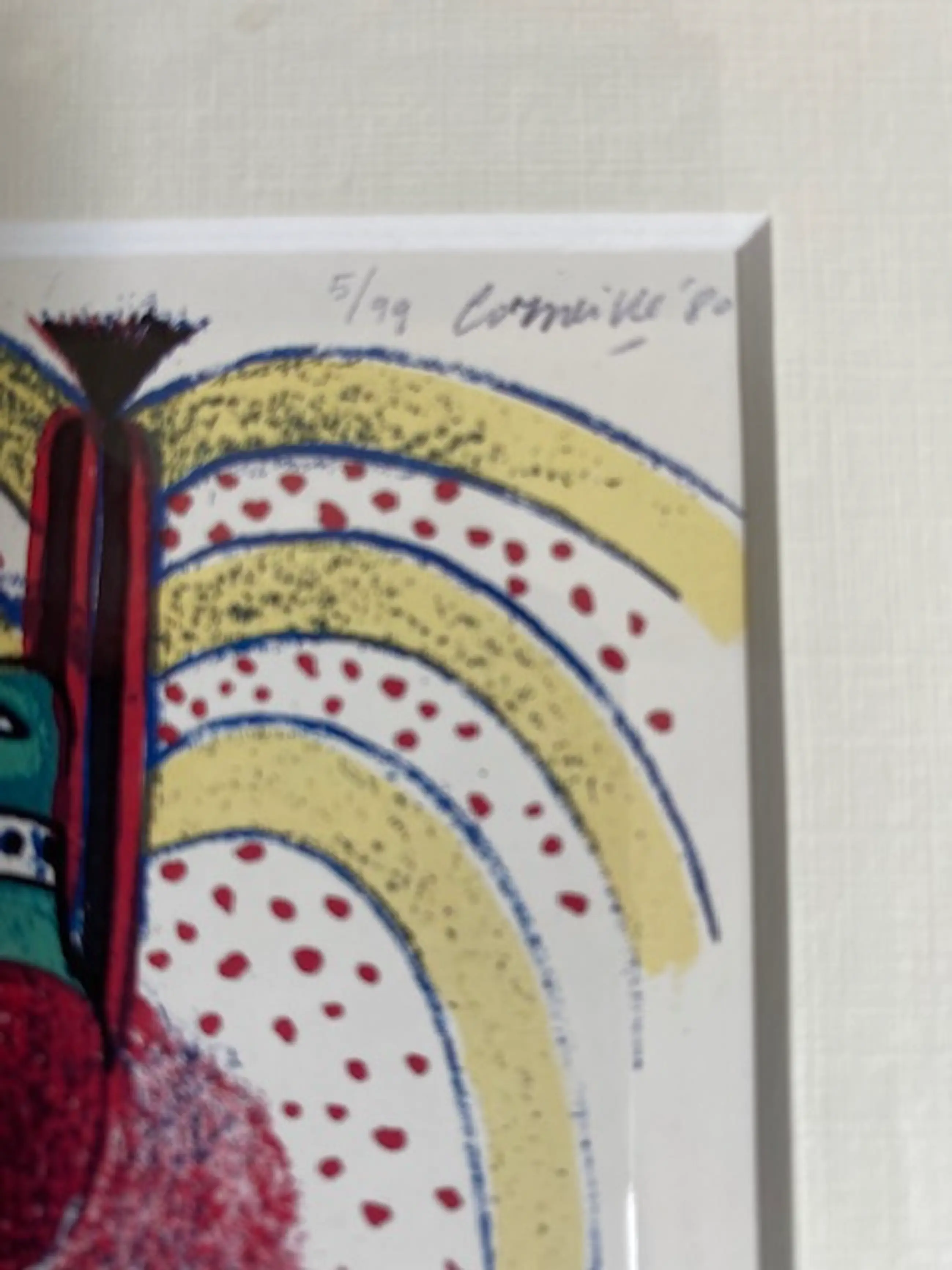 Karakteristiek werk van Corneille uit 1980. Litho op papier, met potlood gesigneerd, gedateerd en genummerd (5/99). Het volledige blad in mooie lijst, achter glas en met mooie passe-partout. Alles in prima conditie.