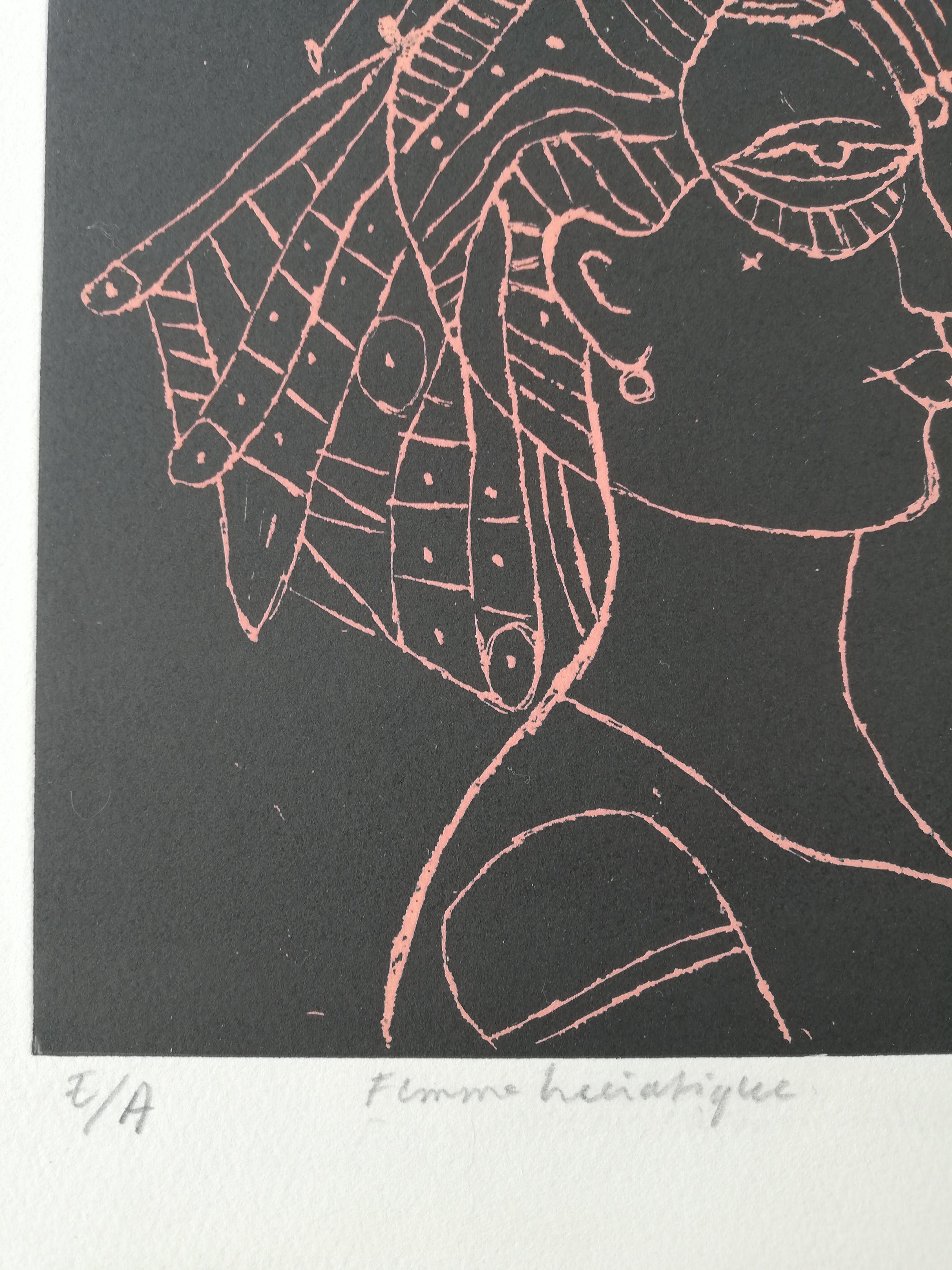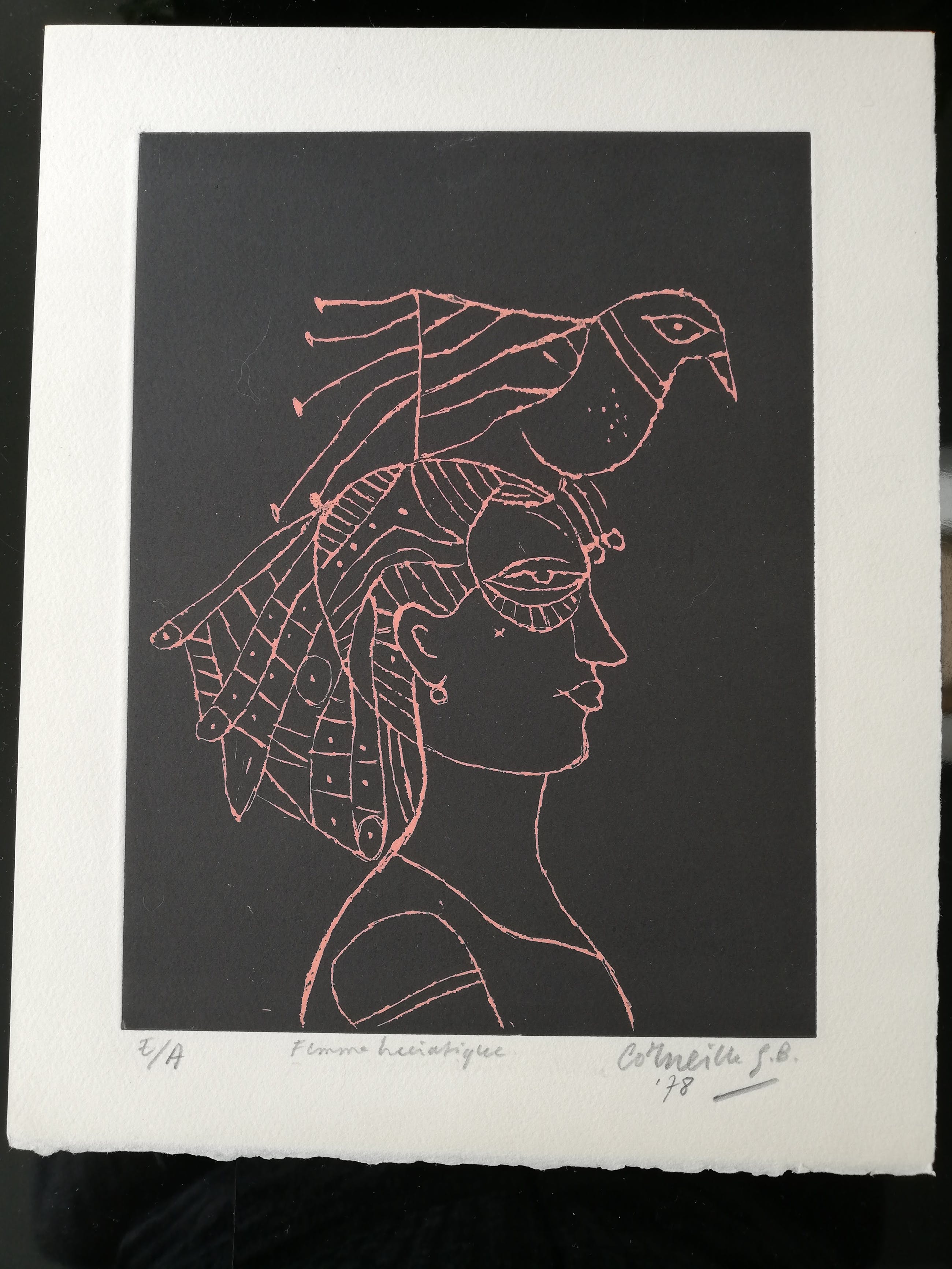 Zeldzame en bijzonder fraaie kleurenets uit 1978 van de bekende Cobra kunstenaar Corneille. Het betreft een schaars kunstenaarsexemplaar (epreuve d'artiste) dat naast de genummerde oplage verscheen in een zeer beperkt aantal. Opvallend is dat Corneille het in potlood signeerde met zijn artiestennaam, maar tevens met zijn echte initialen G. B., Guillaume van Beverloo.