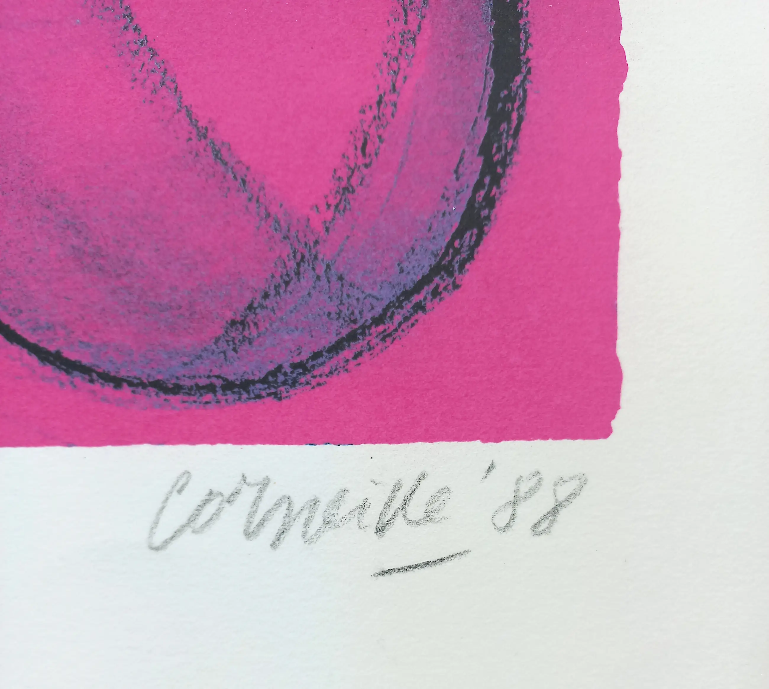 Kleurrijk, karakteristiek werk van Corneille uit 1988. Zeefdruk op papier, met potlood gesigneerd, gedateerd en genummerd (100/200). In goede conditie.