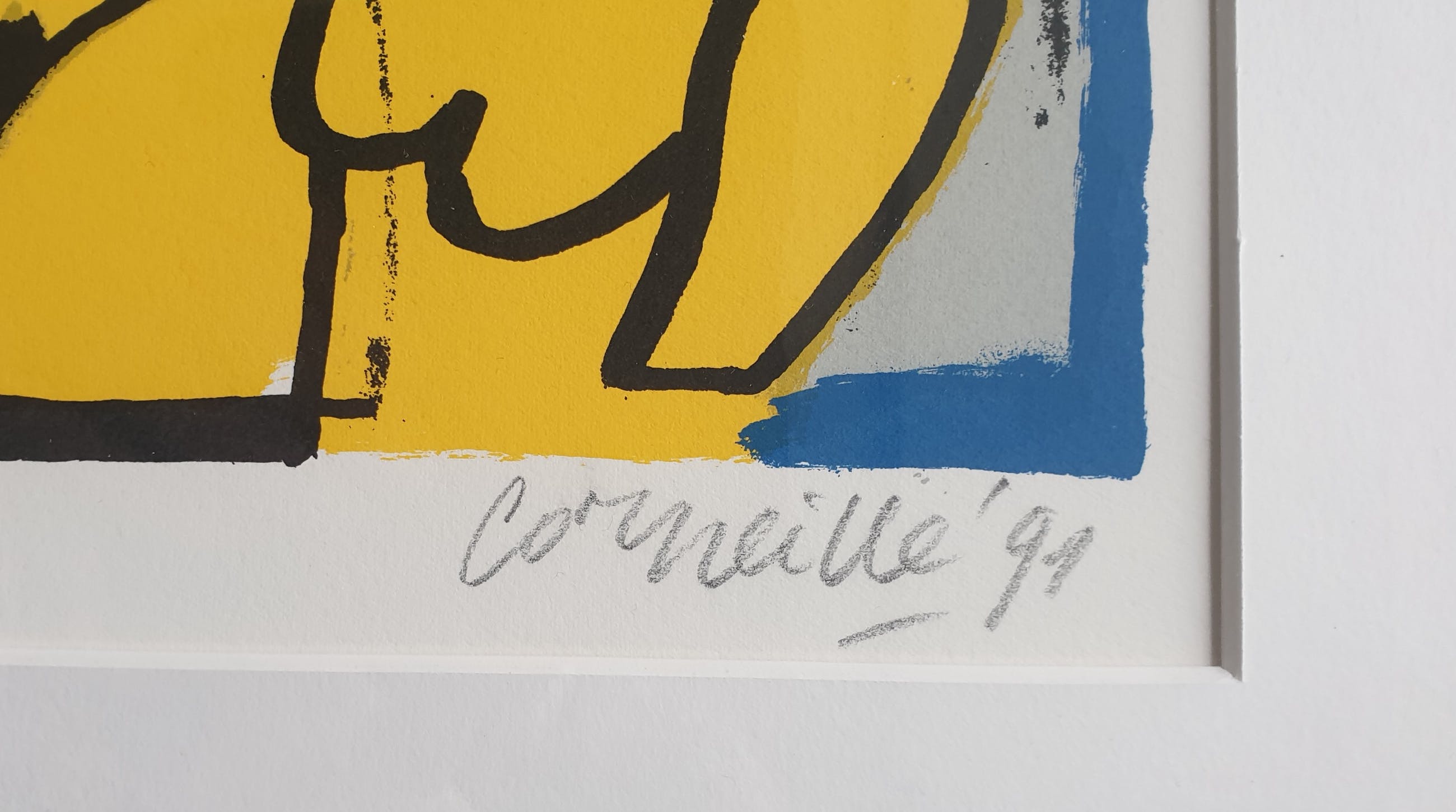 Kleurige litho uit 1991 van Corneille. Nummer 195/200. Het werk (47 x 71 cm) is ingelijst in een blankhouten lijst (met gebruikssporen) . Afhalen of brengen heeft de voorkeur i.v.m. kwetsbaarheid.
