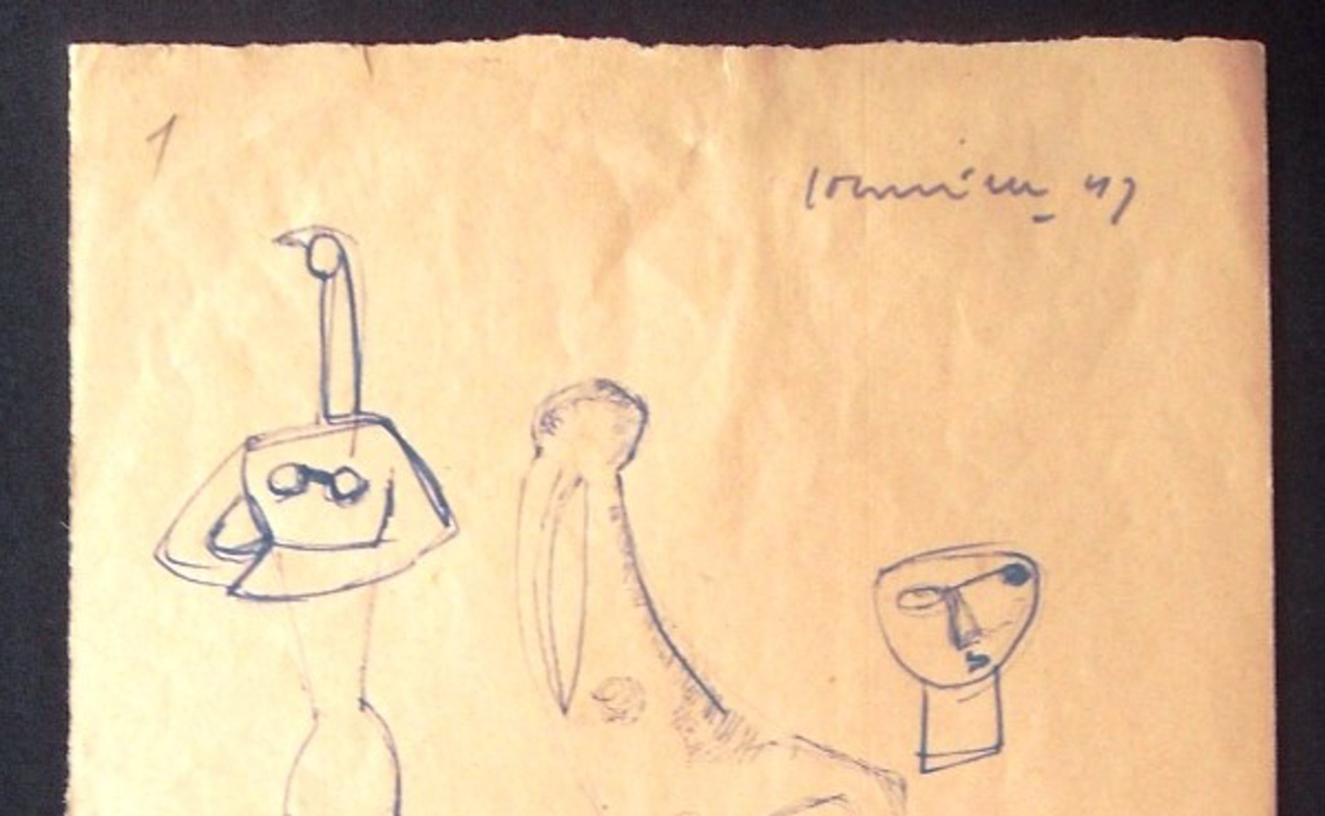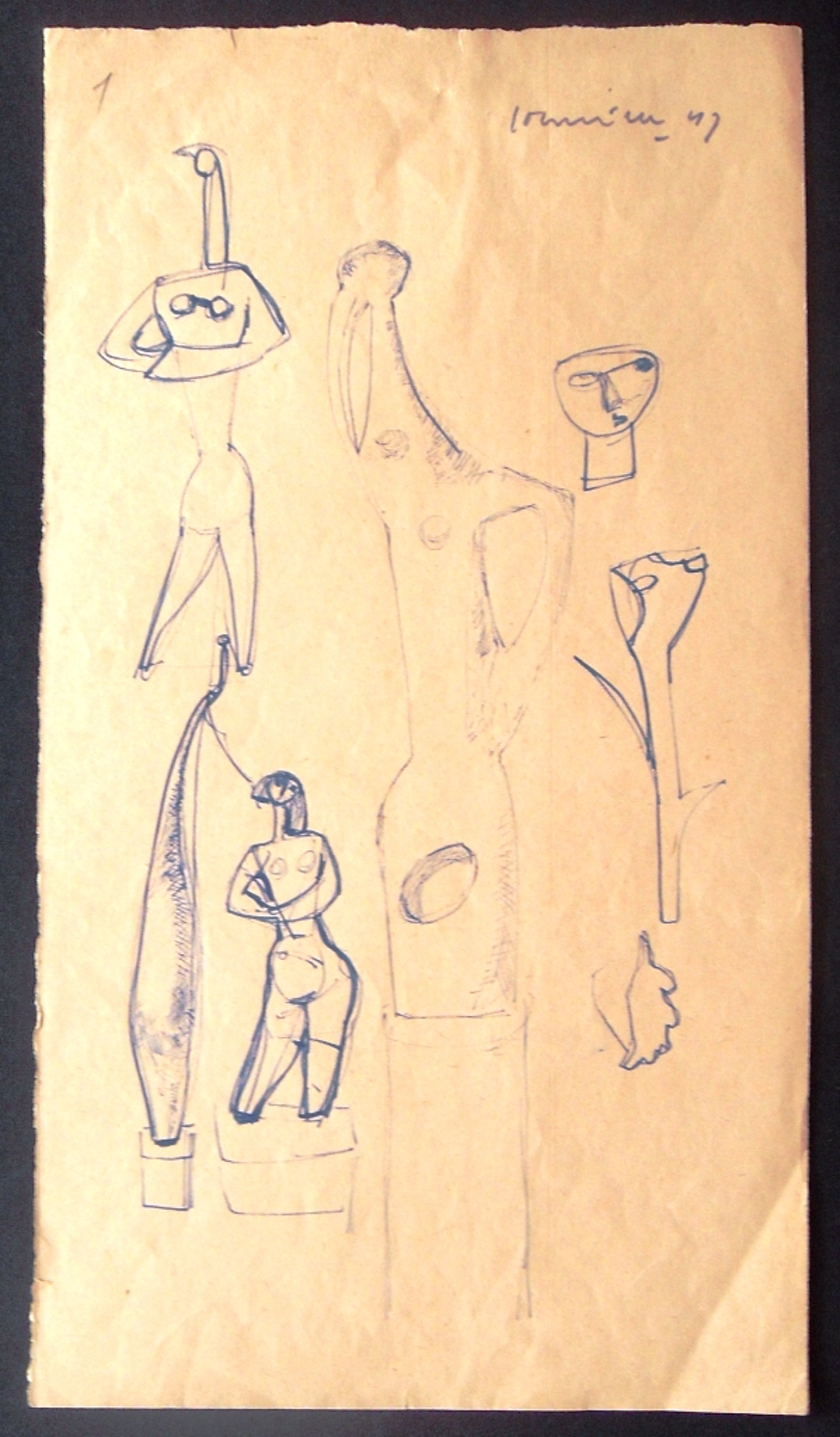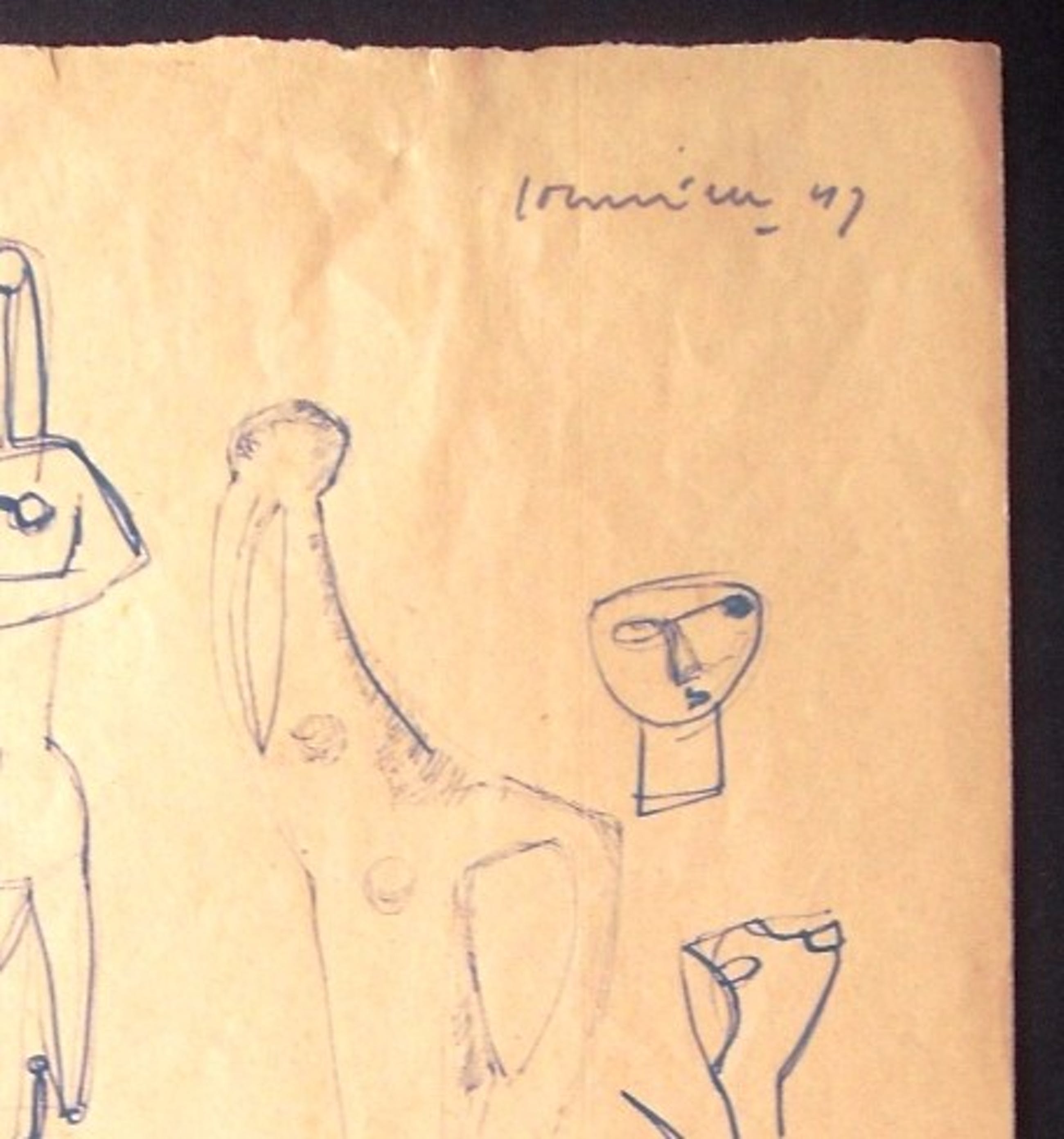 werk uit 1947 met sporen van de tijd, enkele inscheuringen van het papier op de 4 randen volledig buiten het beeld. Voorts kleine en lichte onregelmatigheden in papier met uiterst rechts beneden grote vouw, alles buiten het beeld