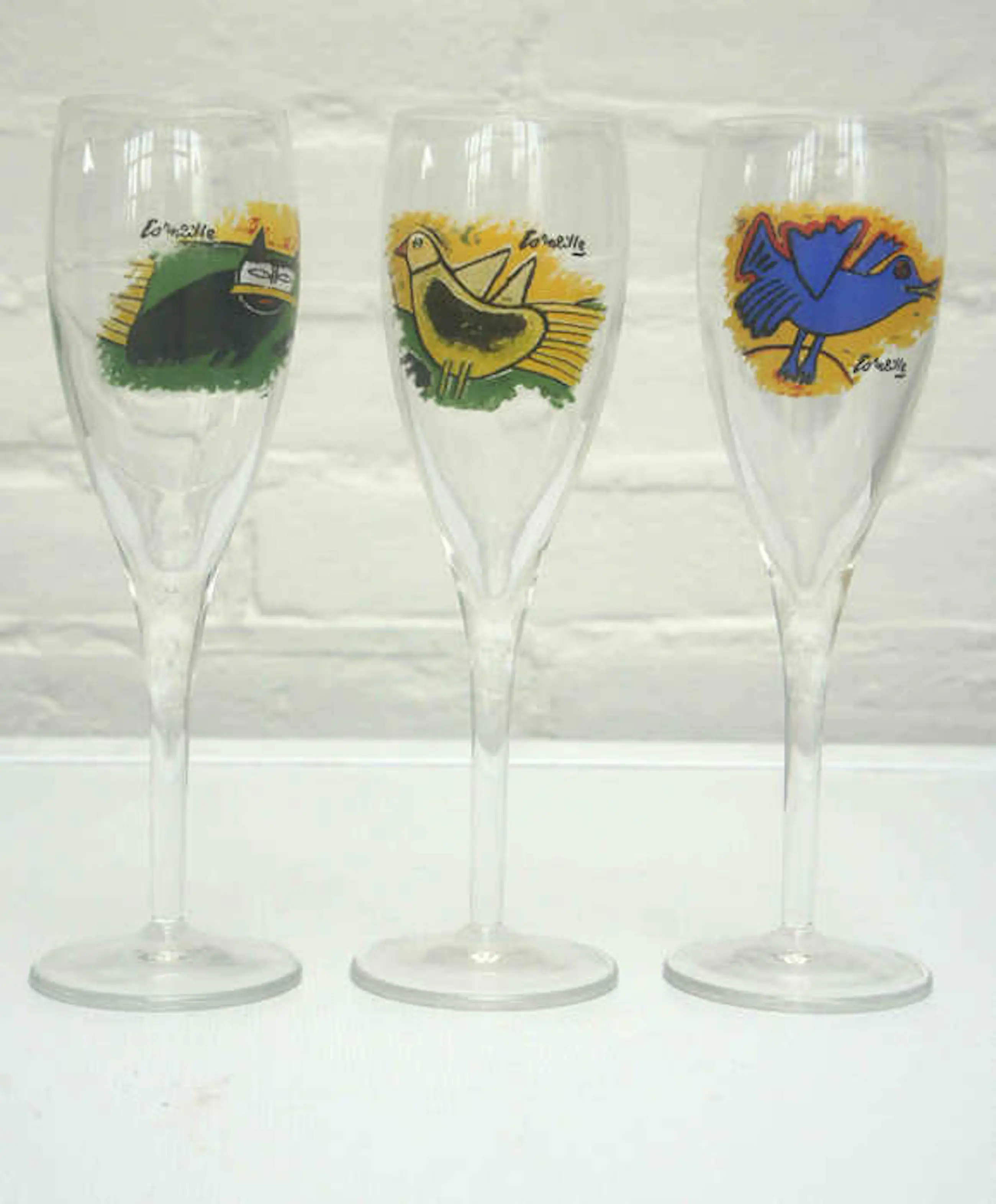 Tesamen met 3 flutes bedrukt met de bekende Corneille vogels en een kat.