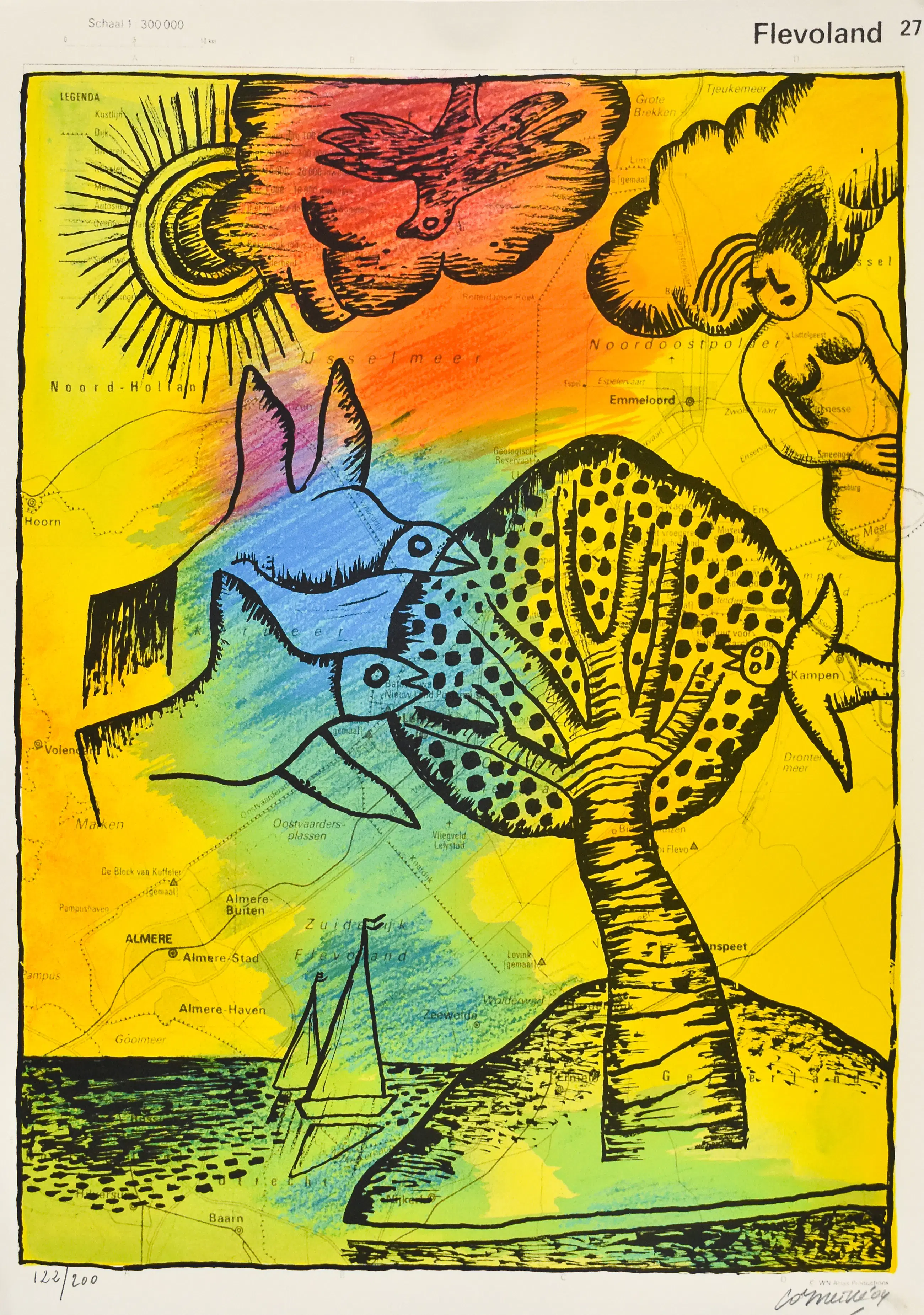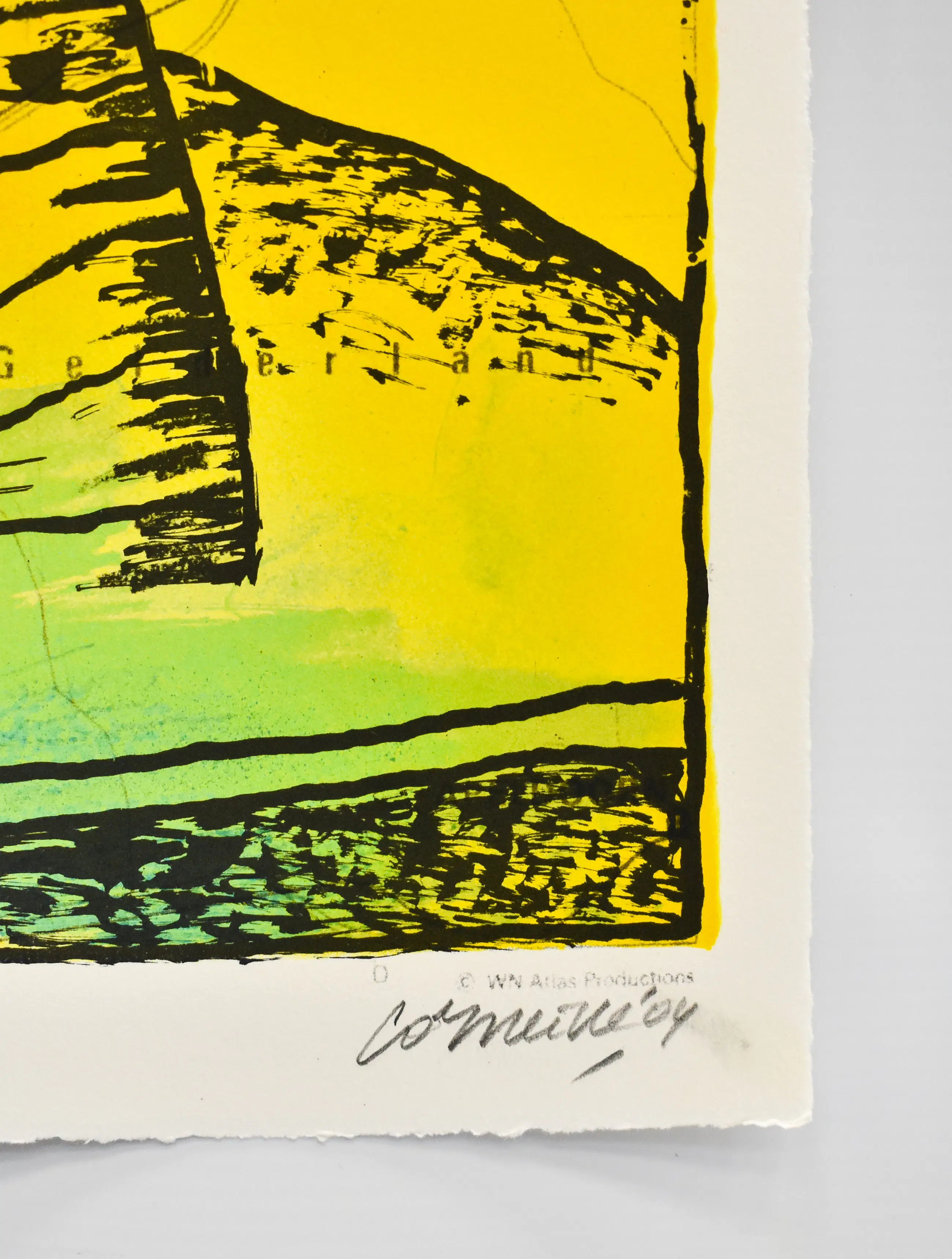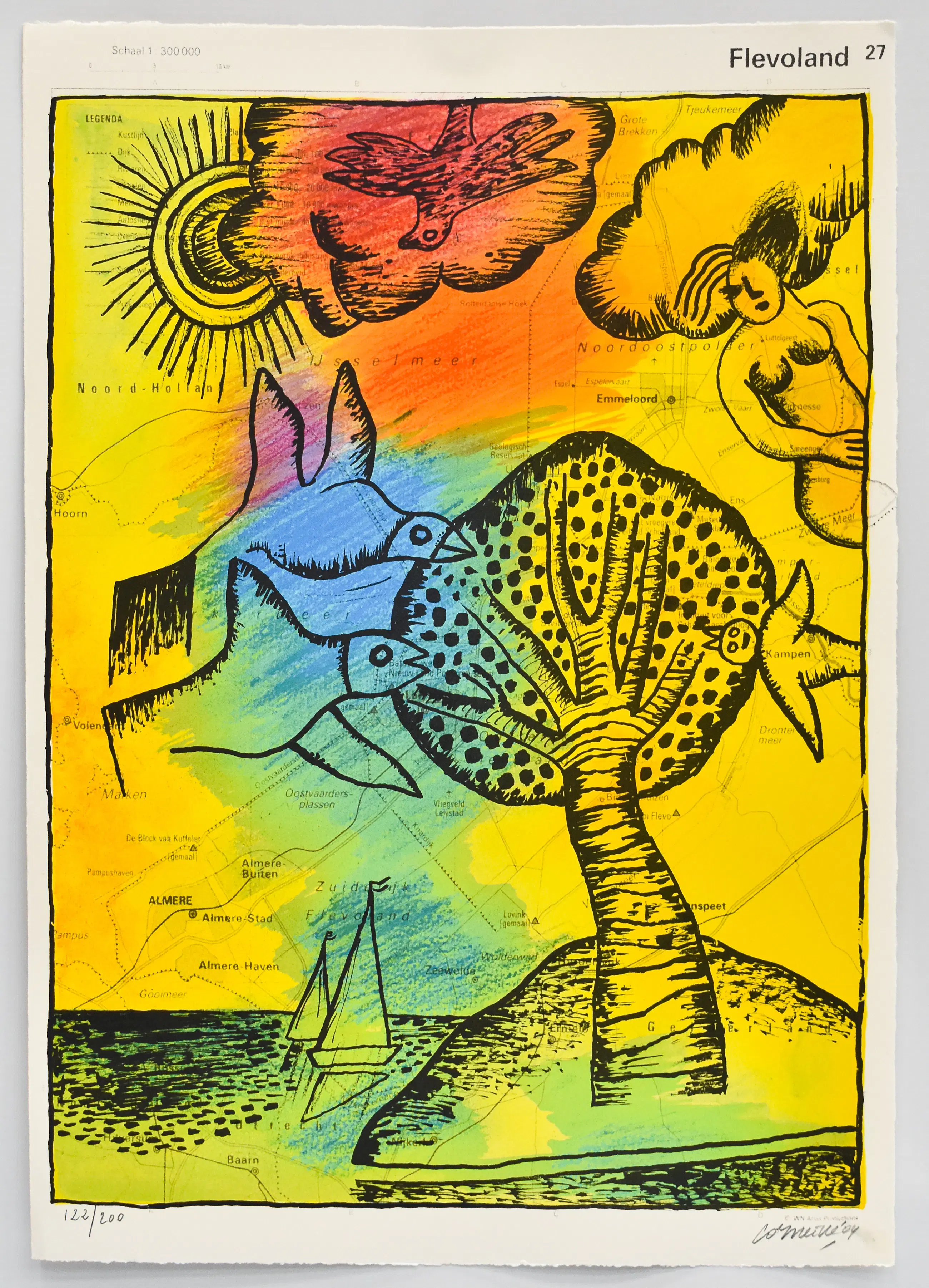 Deze kleurrijke litho getiteld “Gelderland” is een werk van Corneille (1922–2010), een van de medeoprichters van de CoBrA-beweging (samen met o.a. Karel Appel en Constant). Zijn werk kenmerkt zich door levendige kleuren, speelse vormen en terugkerende thema’s als vogels, vrouwen en exotische landschappen.