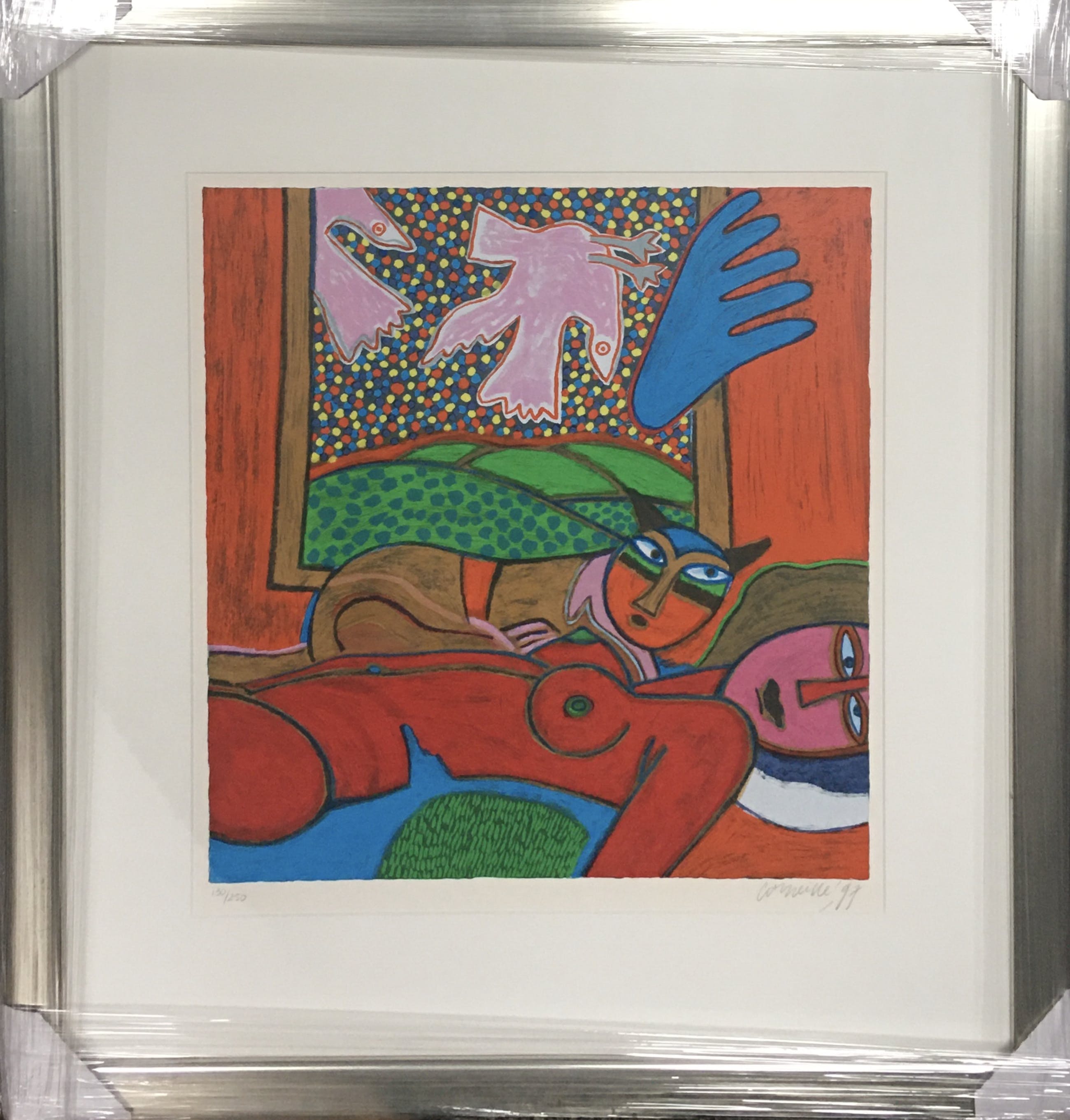 Een zeer fraaie, zeefdruk van Corneille uit 1997z Gesigneerd en genummerd (oplage 250 ex). Het werk is ingelijst in een fraaie verzilverde houten lijst.