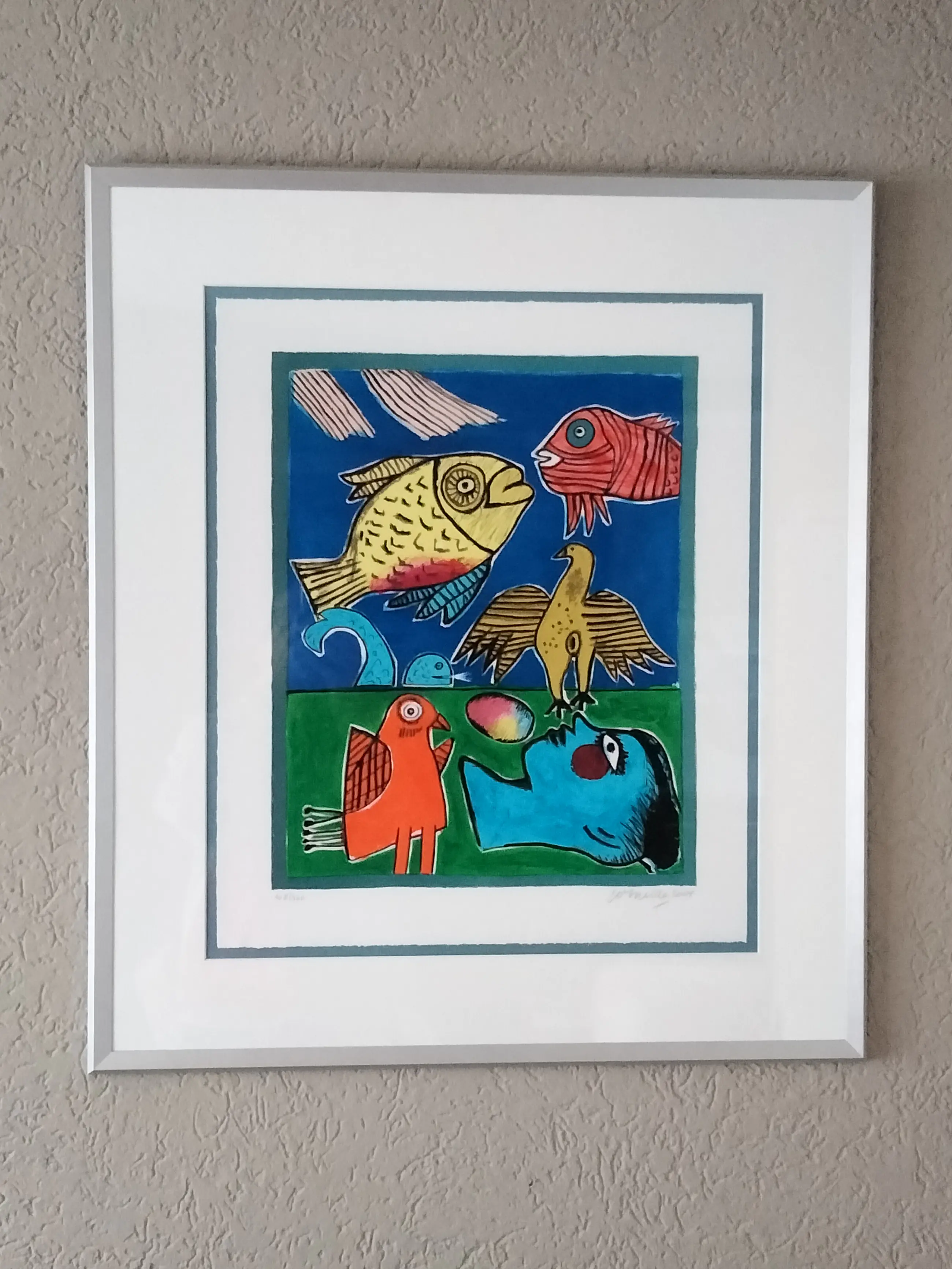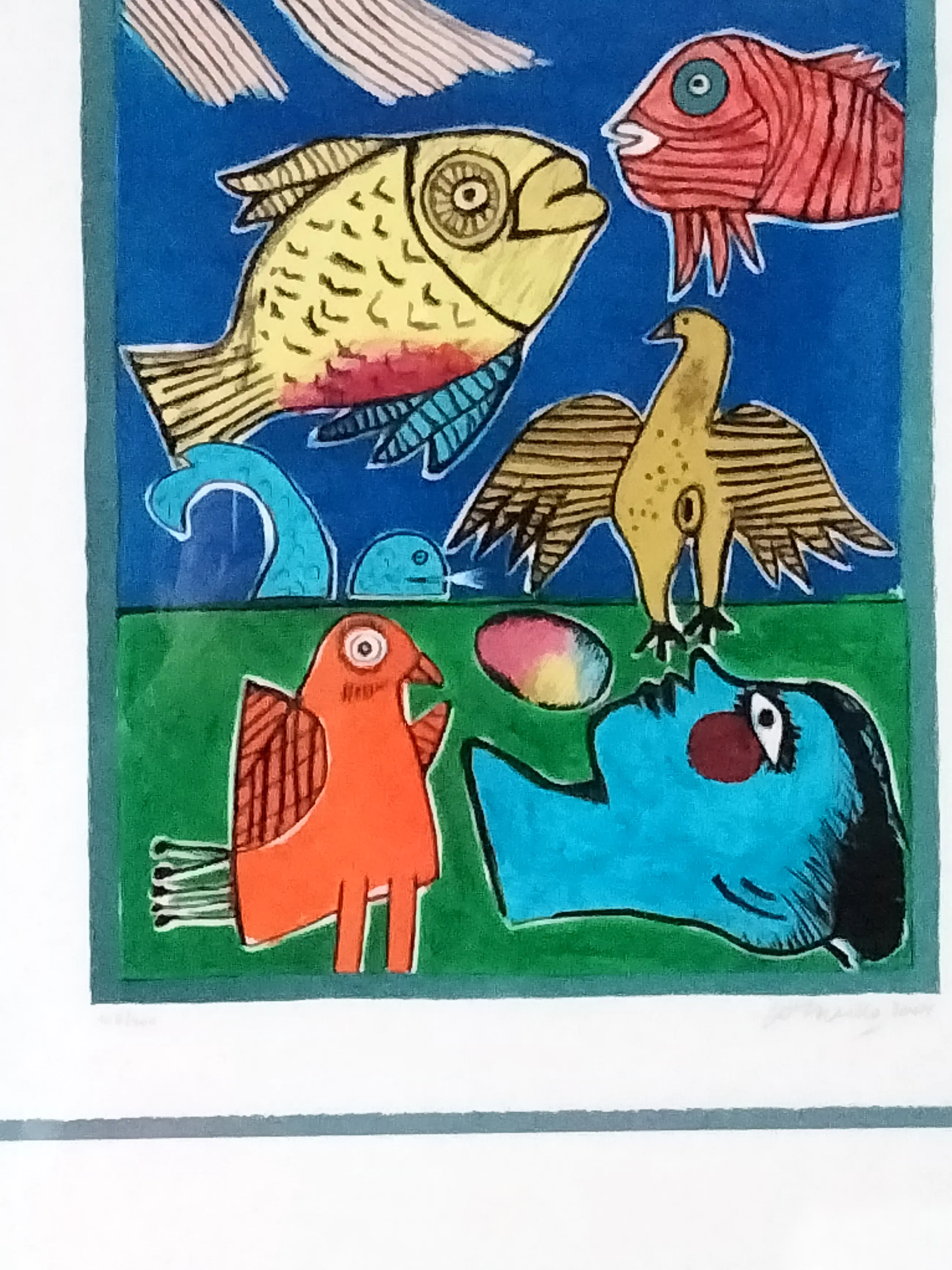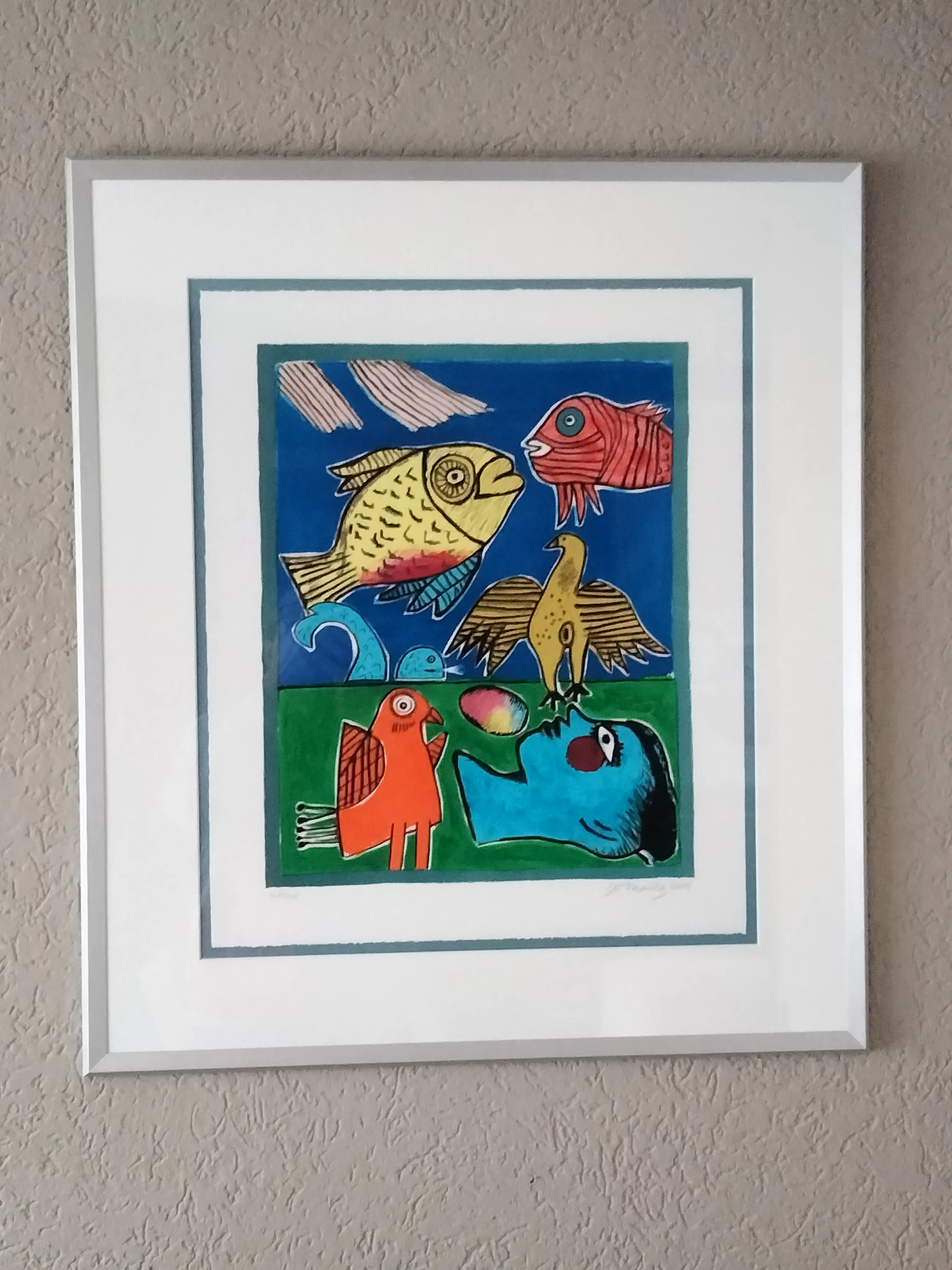 Zeer kleurrijke fraaie zeefdruk van corneille. Gemaakt in het jaar 2001 oplagenummer:108/300 zeer mooi en strak ingelijst ophangklaar. Uiteraard potlood gesigneerd gedateerd en genummerd door corneille.