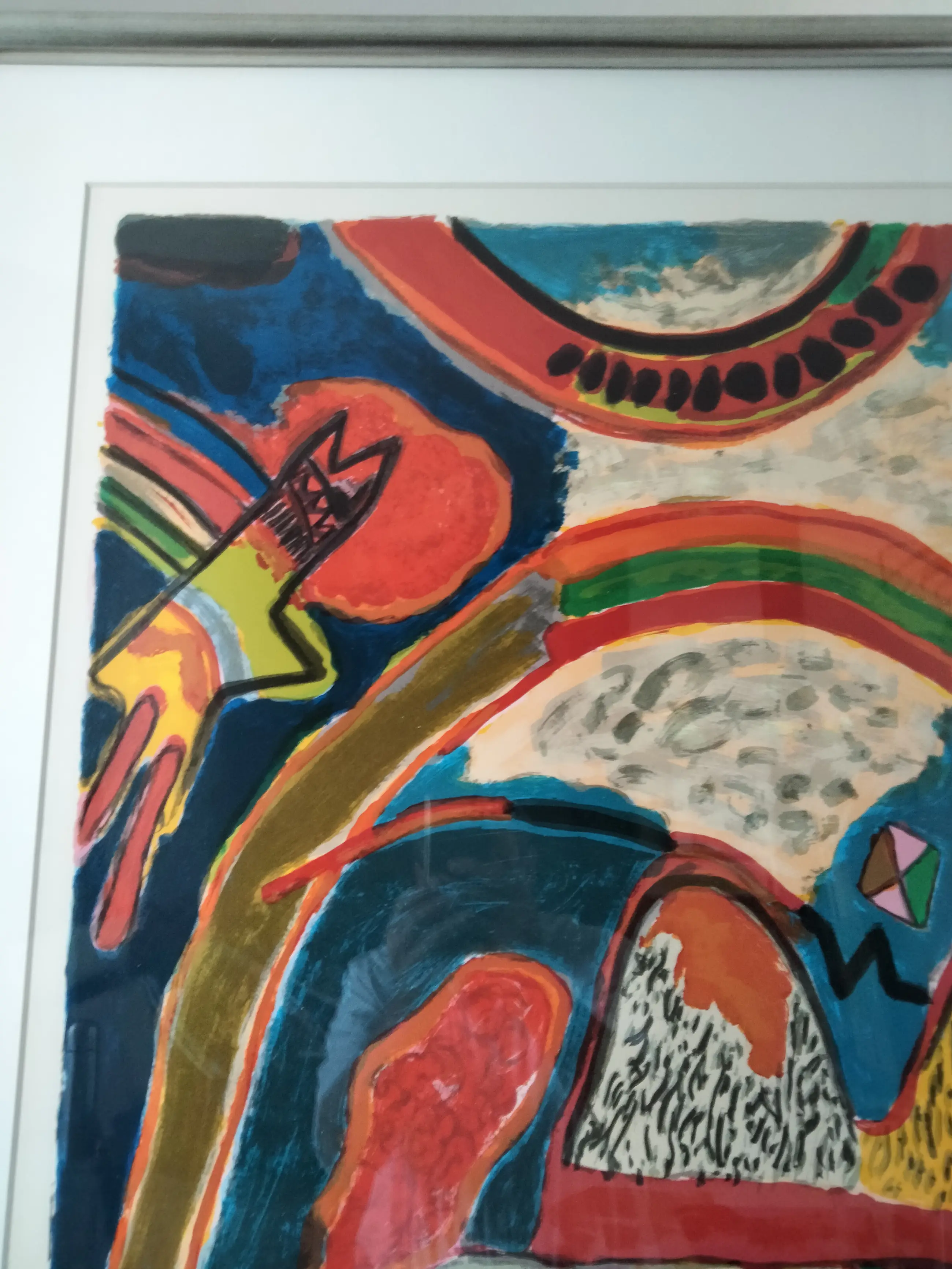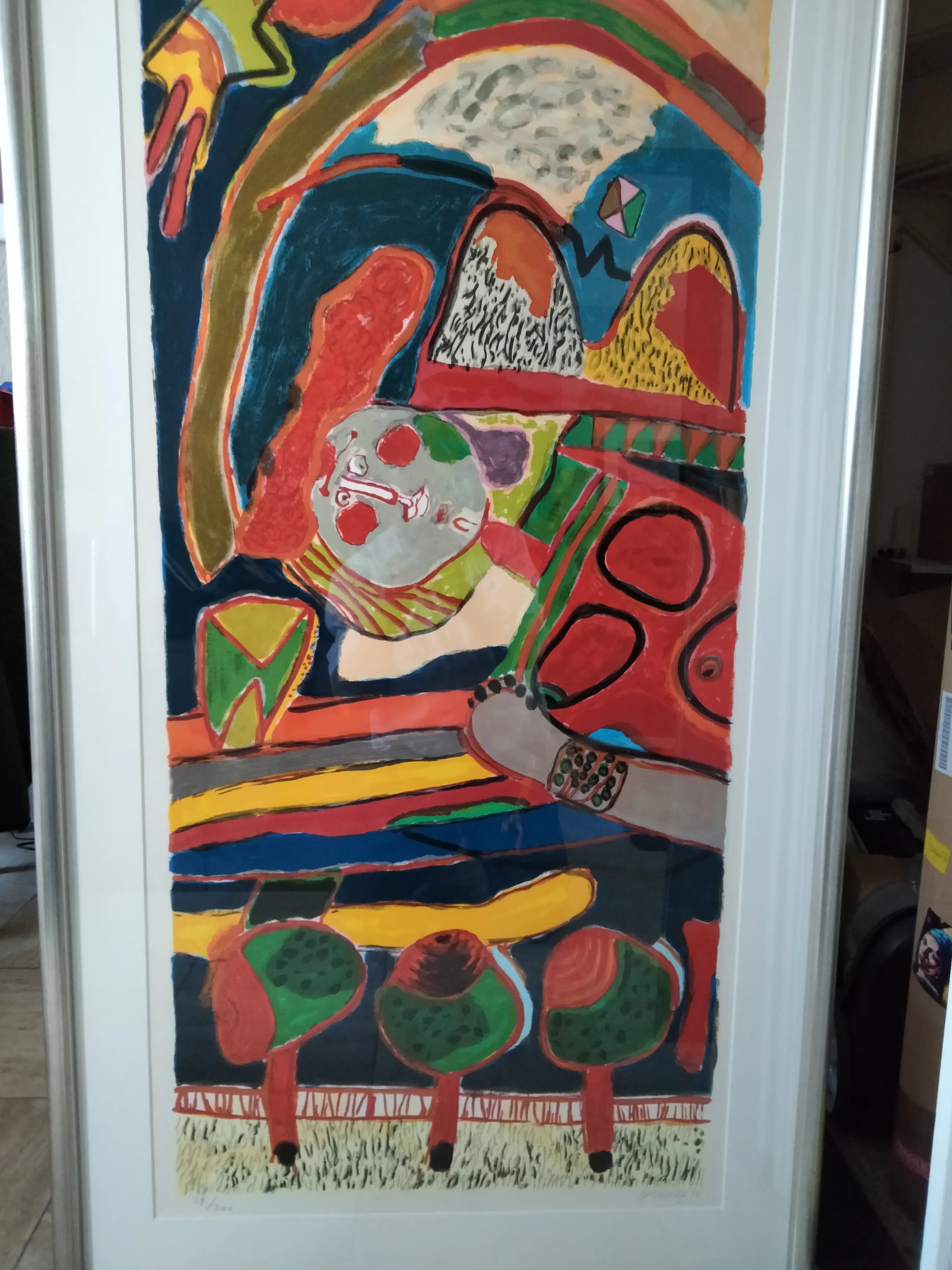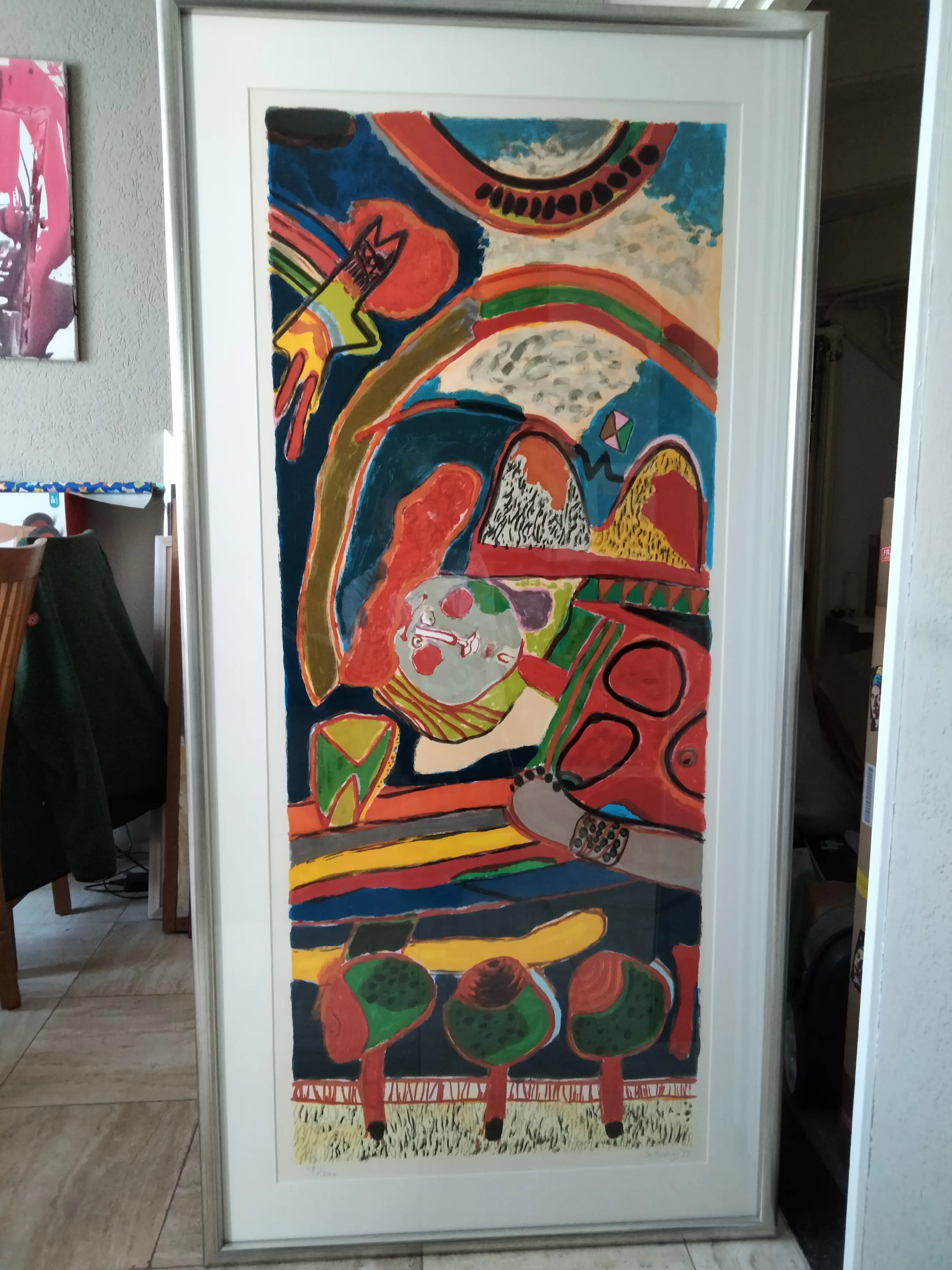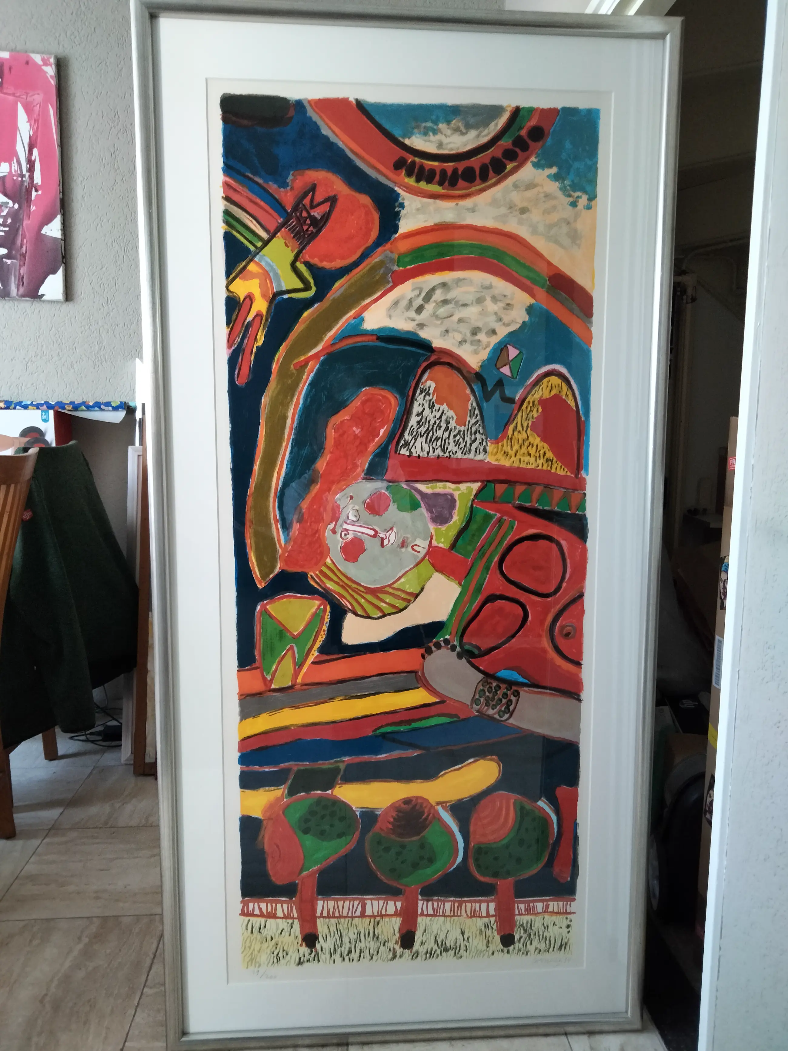 Zeer grote kleurrijke zeefdruk van Corneille uit 1994. Oplage nummer 29/200. Uiteraard potlood gesigneerd gedateerd en genummerd door Corneille. Zeer fraai ingelijst in prachtige zilver kleurige lijst. Ophangklaar. Dit item is uiteraard niet op te sturen afhalen kan in Eindhoven of Drachten. Een bezorging is mogelijk vanaf Eindhoven in een straal van 250 km a 0, 30/km