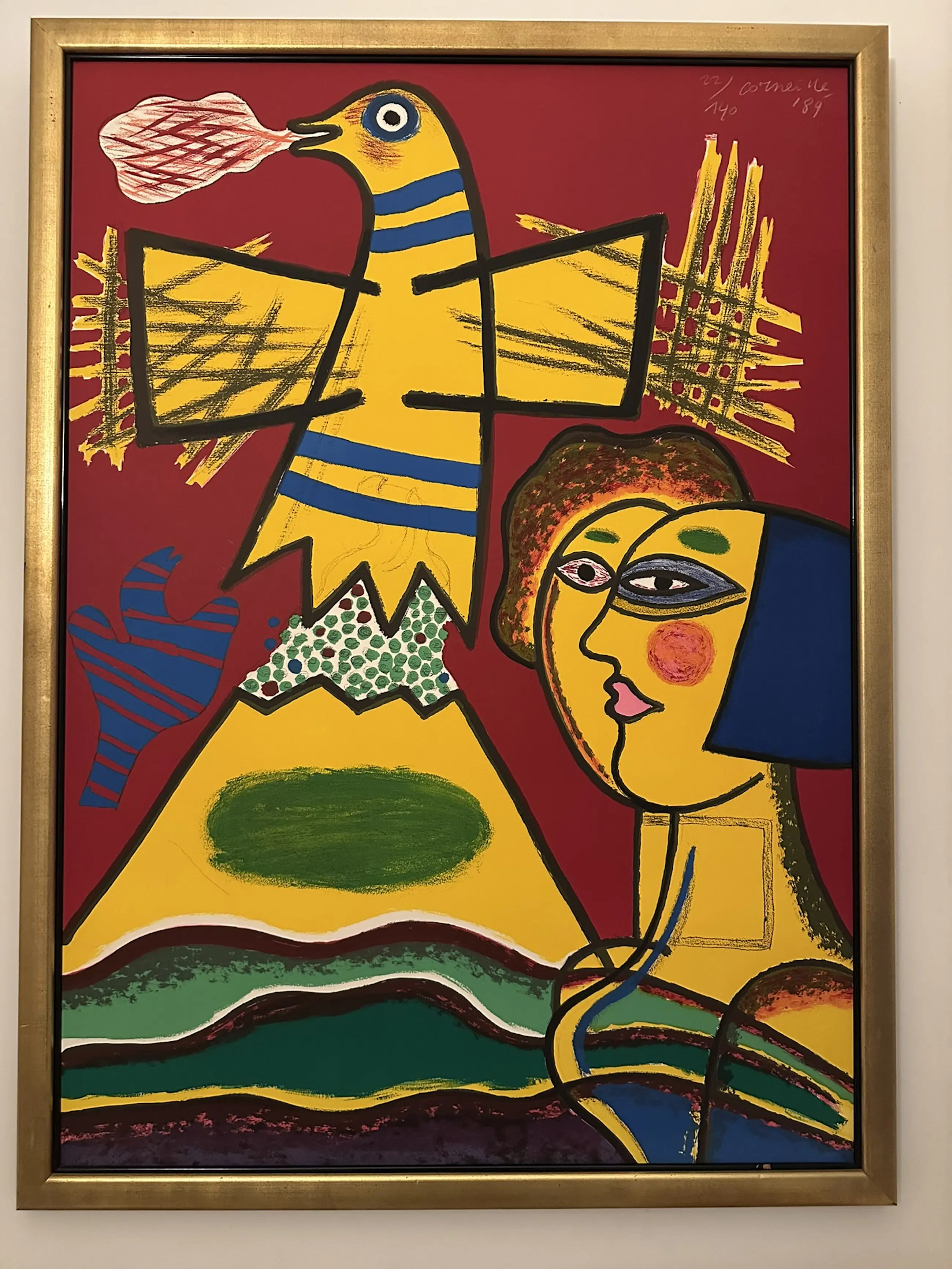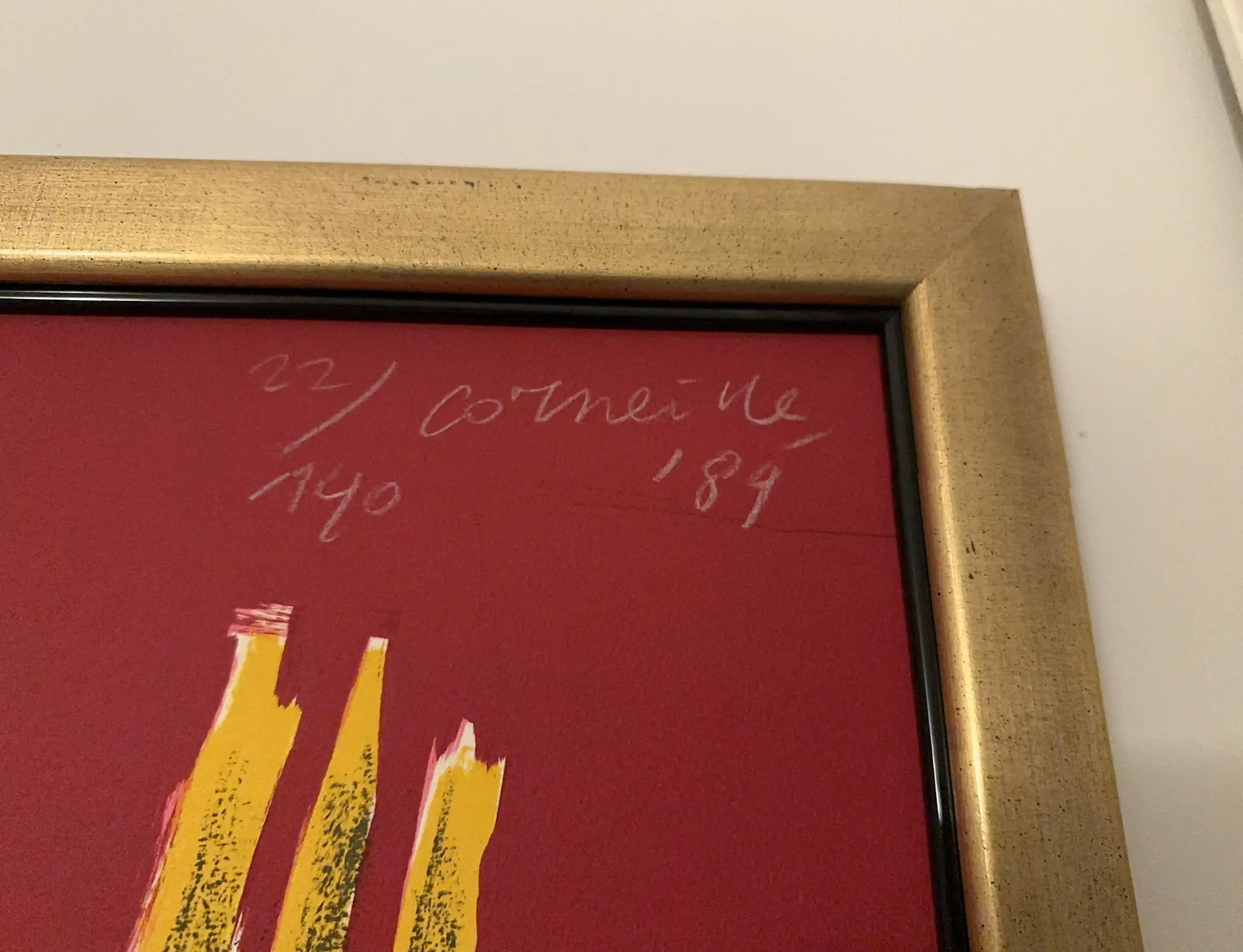 Grote litho van Corneille, ingelijst zonder glas, gele vogel boven berg met gele vrouwengezichten, tegen donkerrode achtergrond