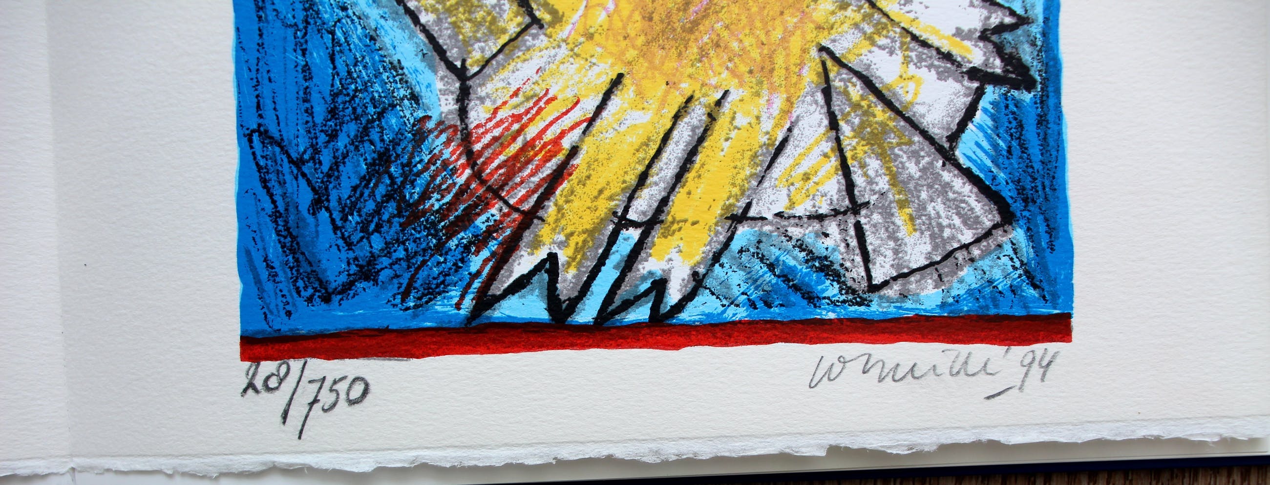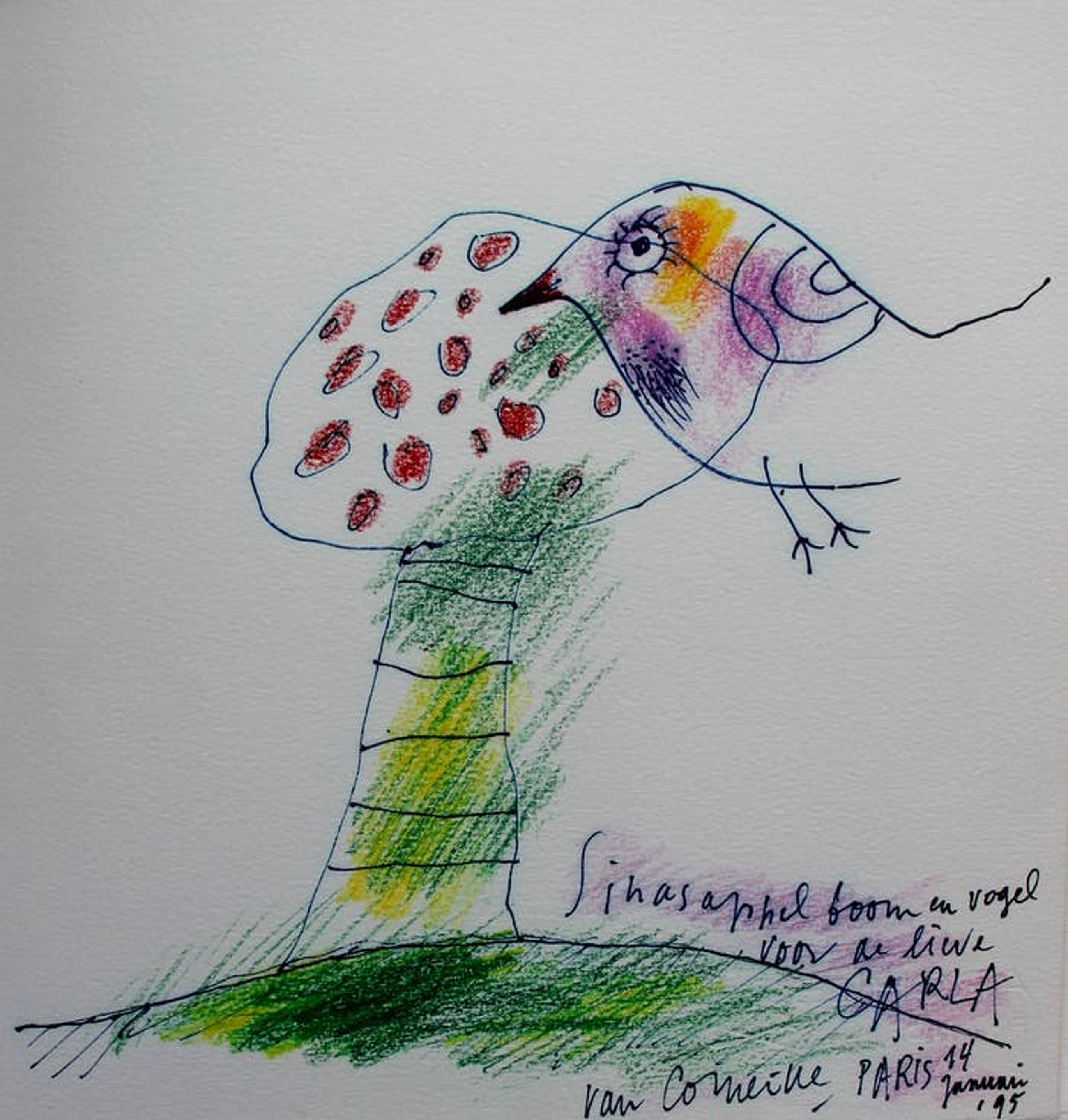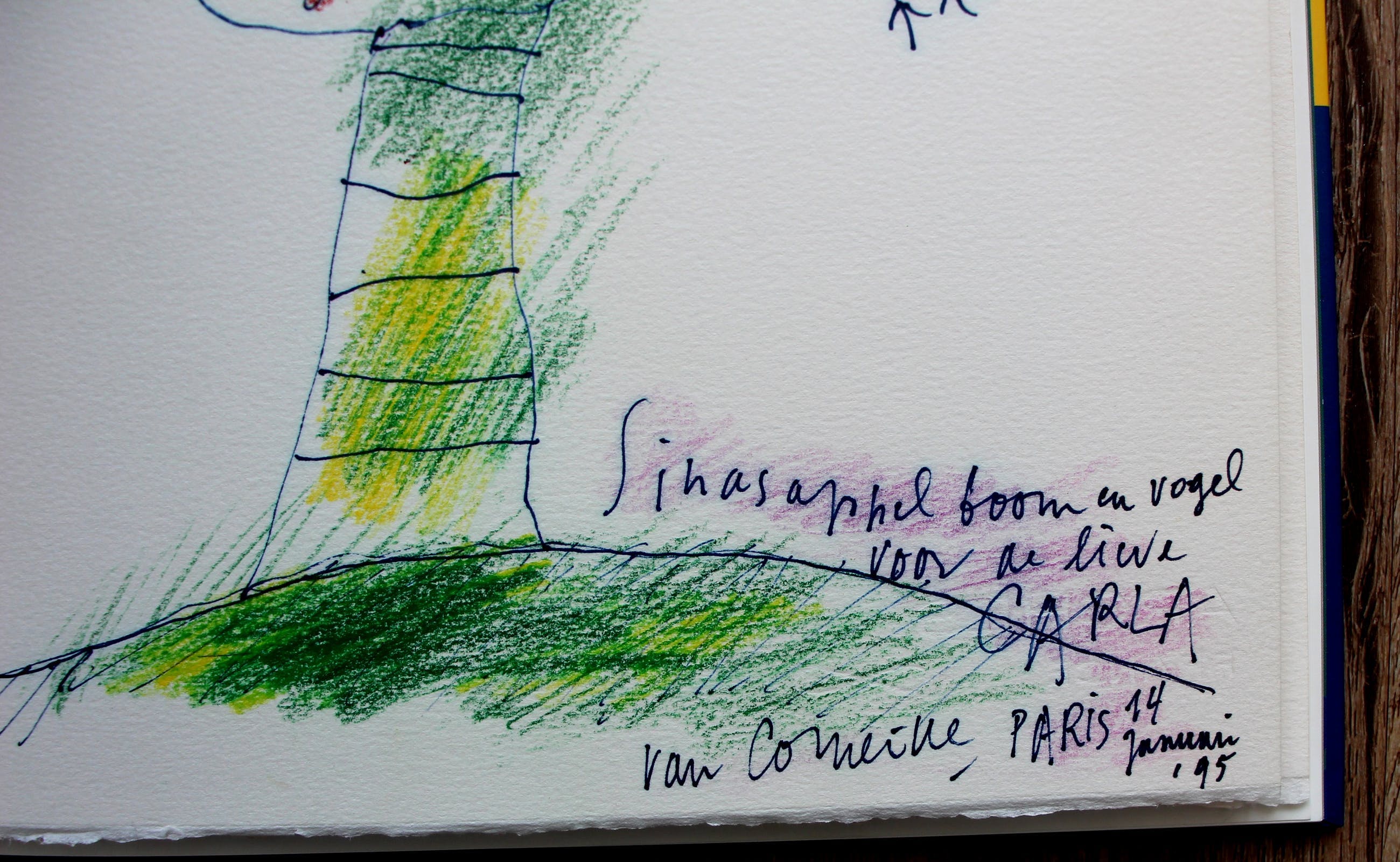 Gemengde techniek (krijt/pen) van Corneille uit 1995. Gesigneerd op 14 januari + gesigneerde zeefdruk in boek. Het boek is uitgegeven door Jaski Art Gallery, Amsterdam. Nummer: 28/750. Afmetingen voorstelling gemengde techniek: H22,5 x b 24,5 cm. Afmetingen voorstelling zeefdruk: H24 x b18 cm.