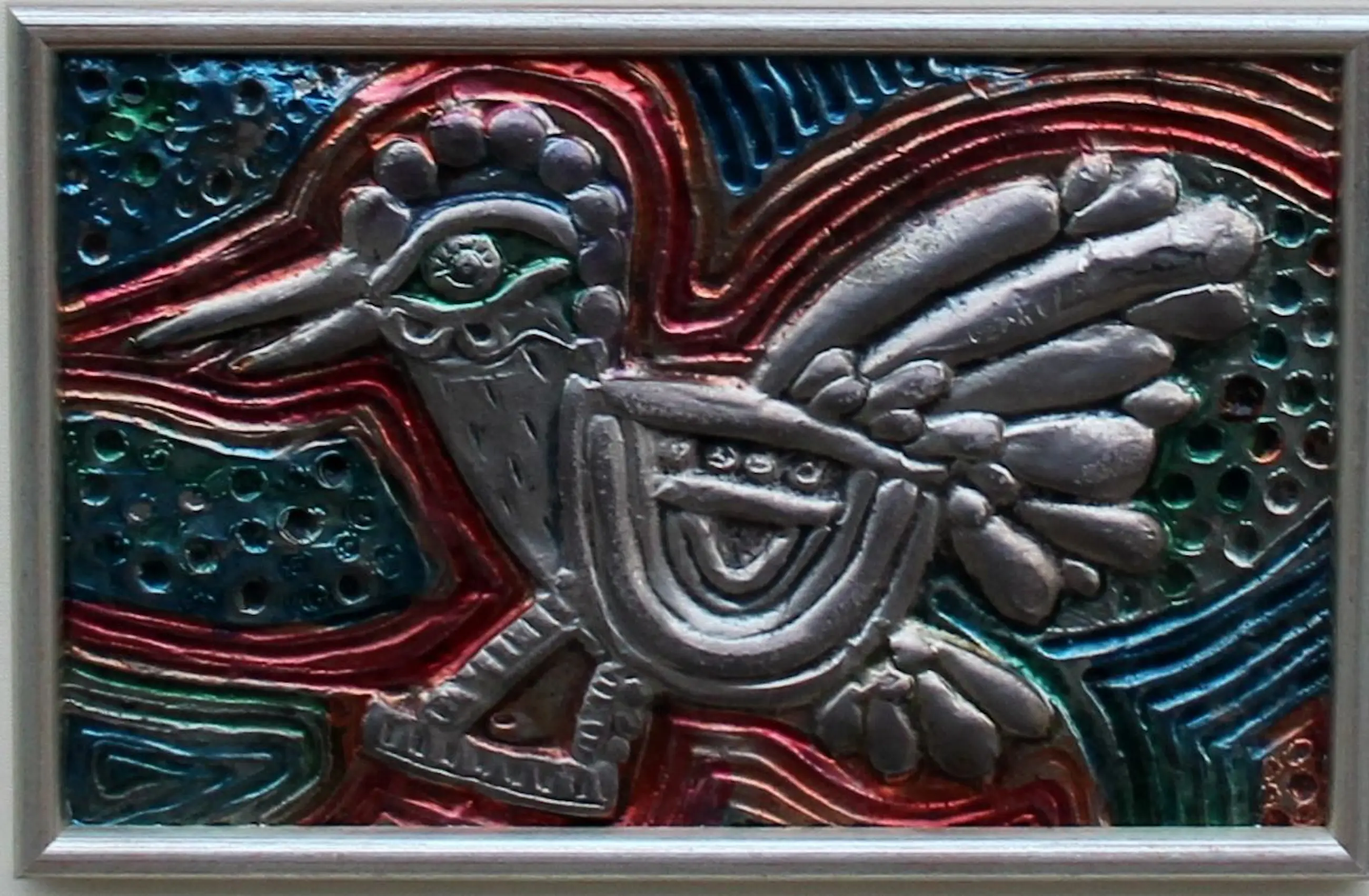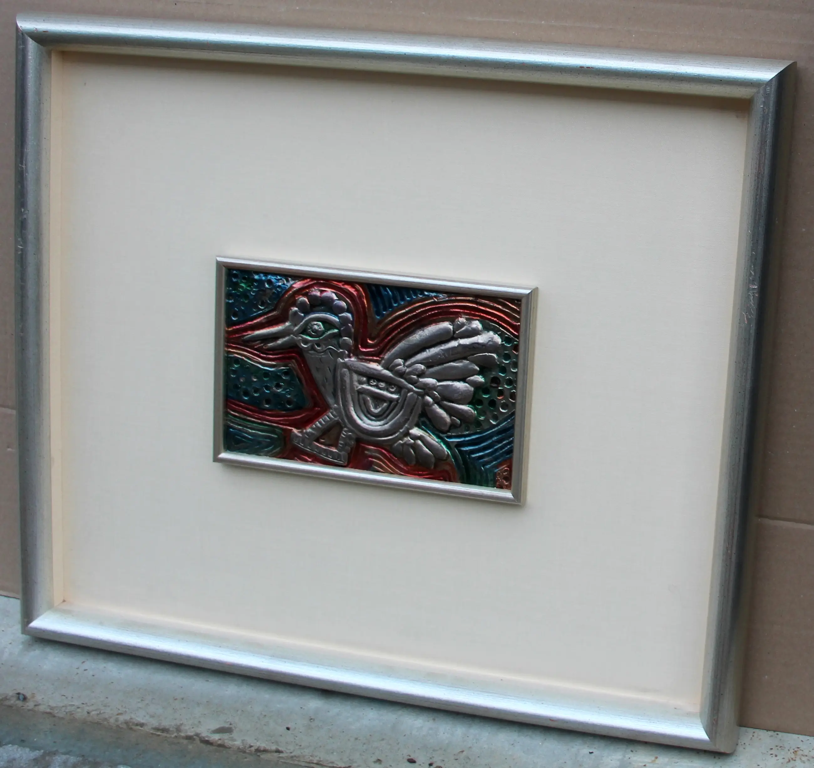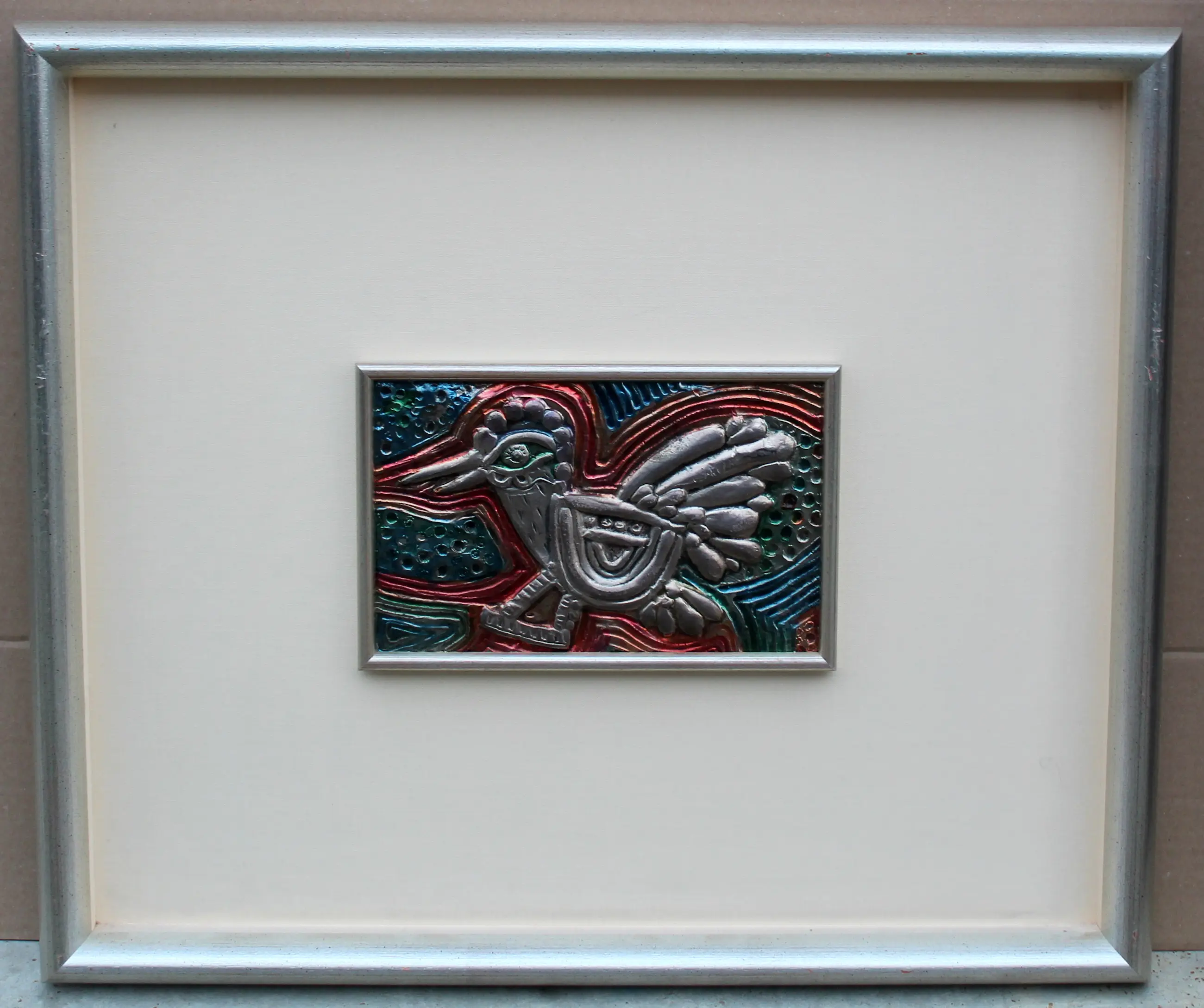Gepolychromeerde reliëf, in zilver, van Corneille. Voorstelling van een vliegende vogel. Afmetingen incl lijst: H49 x b57cm. Afmetingen voorstelling: H15 x b23cm. Het werk is gesigneerd door de kunstenaar. De authenticiteit van het aangeboden werk wordt volledig gegarandeerd. Een certificaat van echtheid kan, op aanvraag, worden gemaild.