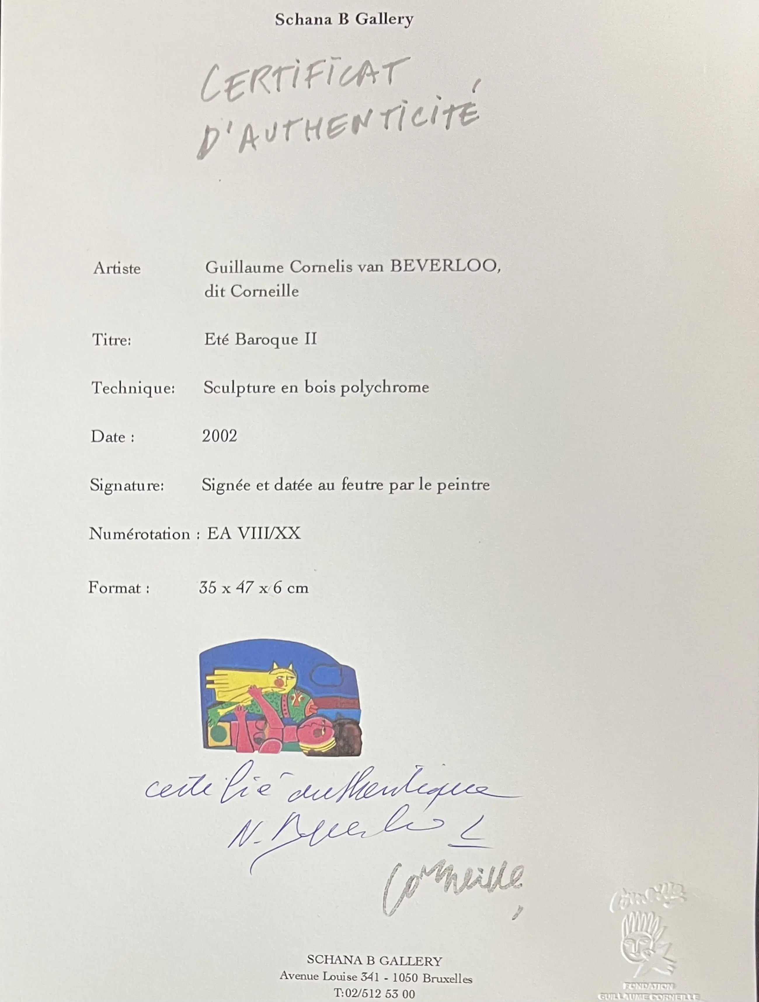 Polychrome houten sculptuur uit 2002, geleverd met een certificaat van echtheid.