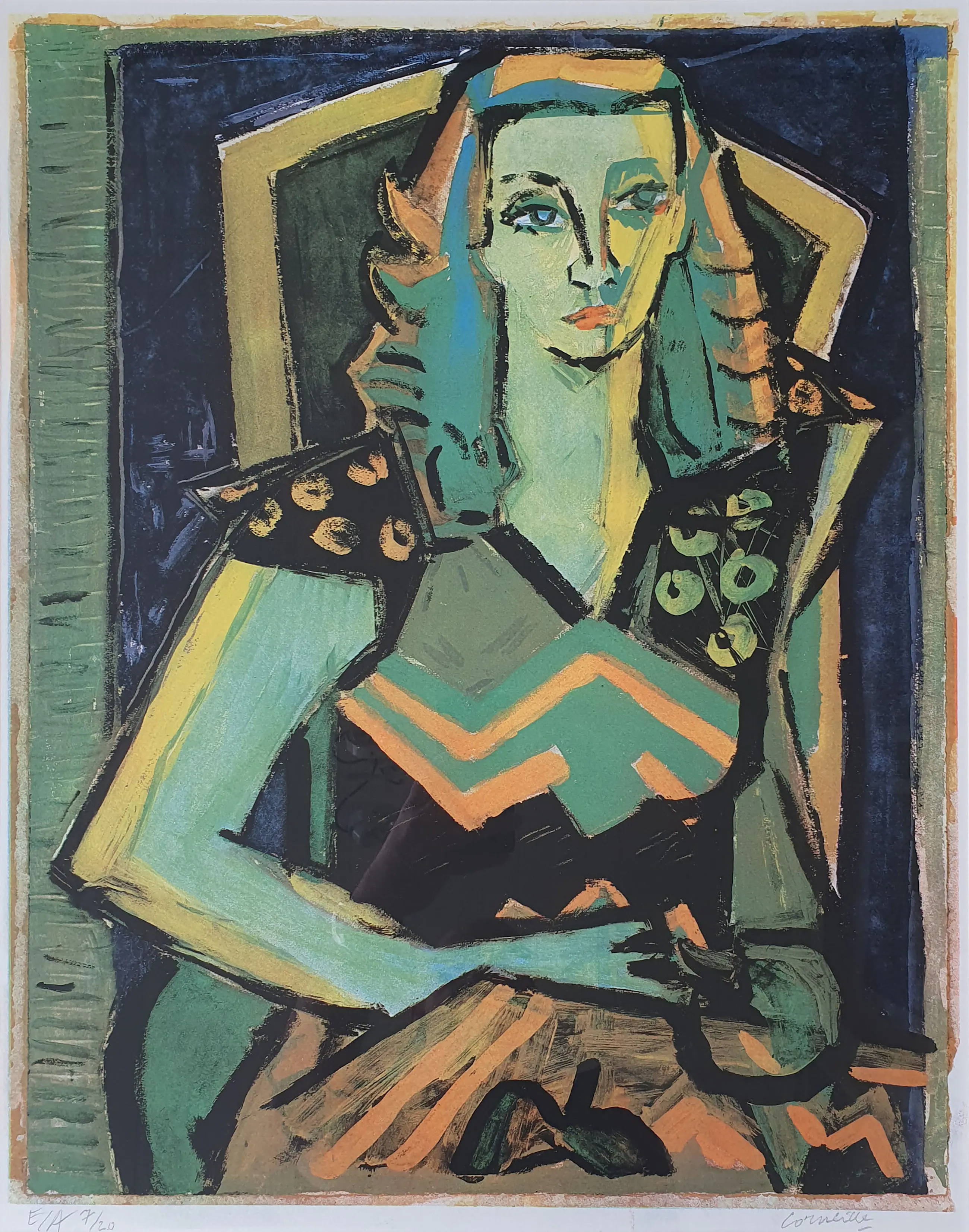 Fraai werk van Corneille met de titel: 'Groene vrouw' uit 1988. Het werk is rechtsonder met de hand gesigneerd door de kunstenaar. Het werk is recentelijk voorzien van een oude barokke lijst en bijpassend passe-partout.