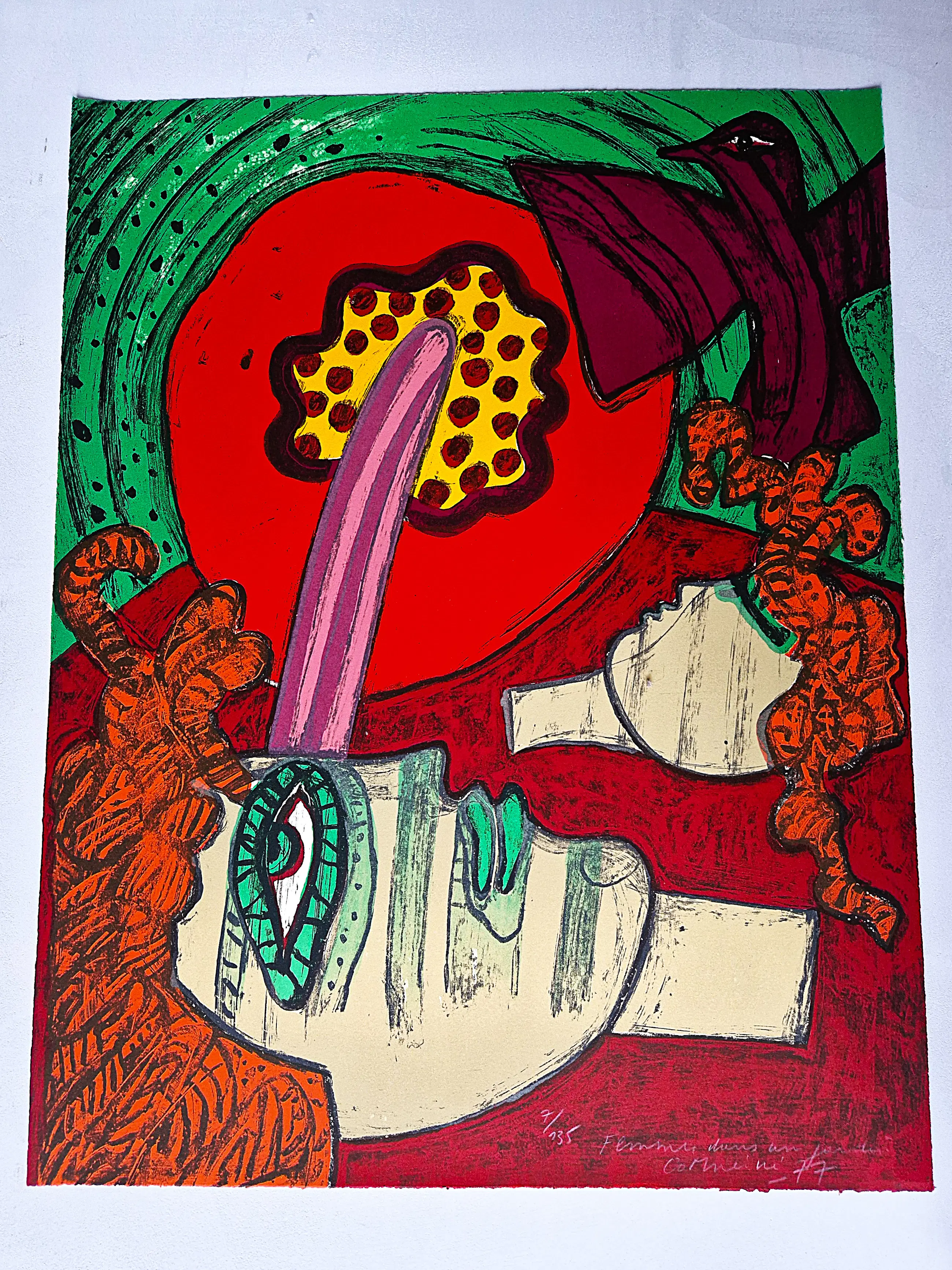 - Prachtige originele kleuren lithografie van Corneille met de titel 'Femmes dans un Jardin' uit 1977. Een echt verzamelobject met zeer beperkte oplage, dit is nr 7 van in totaal slechts 135 exemplaren uitgegeven, reeds 45 jaar oud maar in puntgave conditie!
