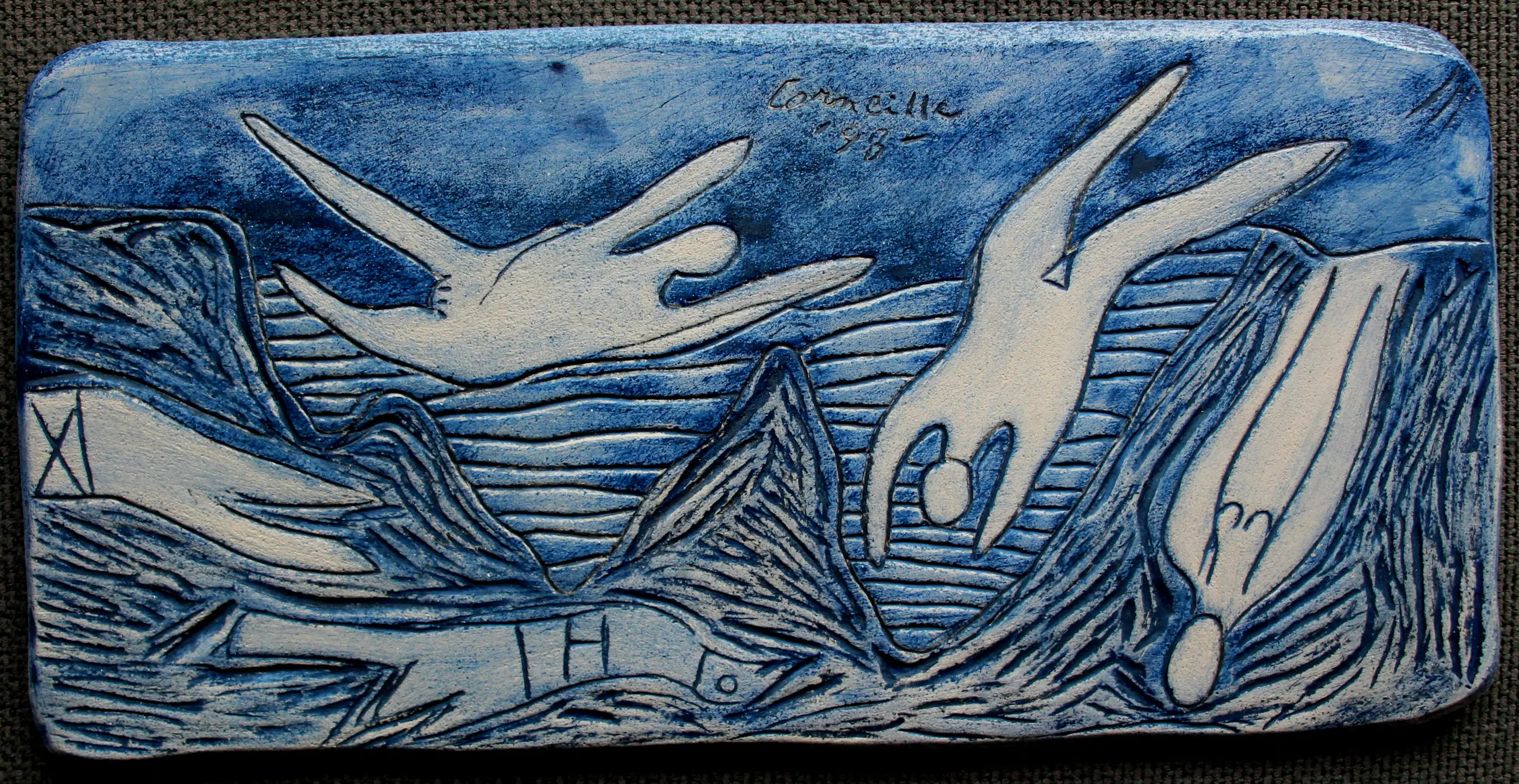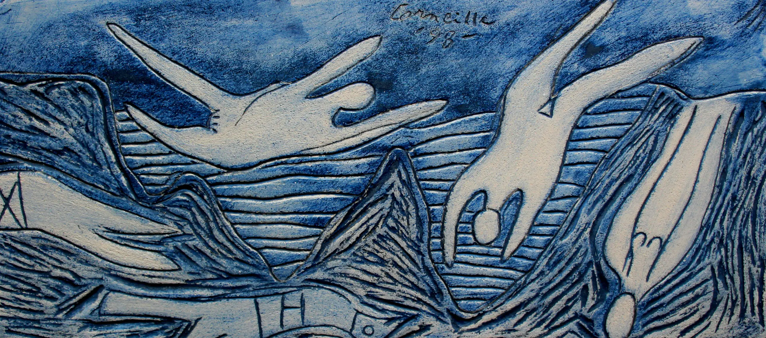 Grote aardewerk plaquette van Corneille. Met een voorstelling van figuren. Uitvoering Atelier/studio J.M.Foubert, F.Delille / Frankrijk 1998. Afmetingen plaquette: H23 x b49 x d2cm. Het beeld is, aan de achterzijde, gesigneerd door de kunstenaar. De authenticiteit van het aangeboden werk wordt volledig gegarandeerd. Een certificaat van echtheid kan, op aanvraag, worden gemaild. Herkomst: Museum Jan van der Togt, Amstelveen.