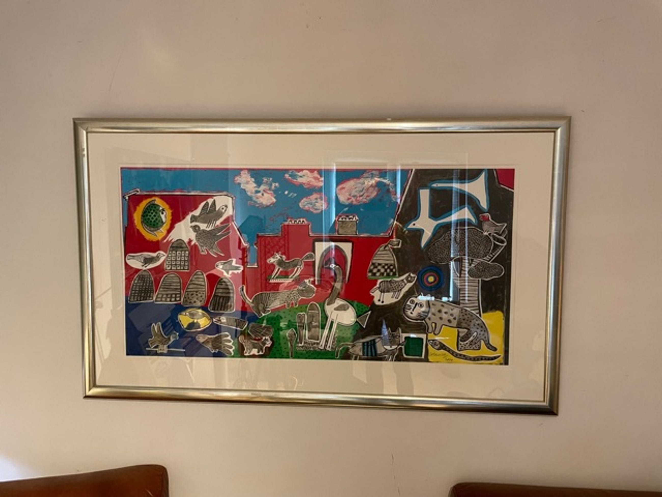 Prachtige aparte grote zeefdruk met mooie heldere kleuren in mooie lijst.