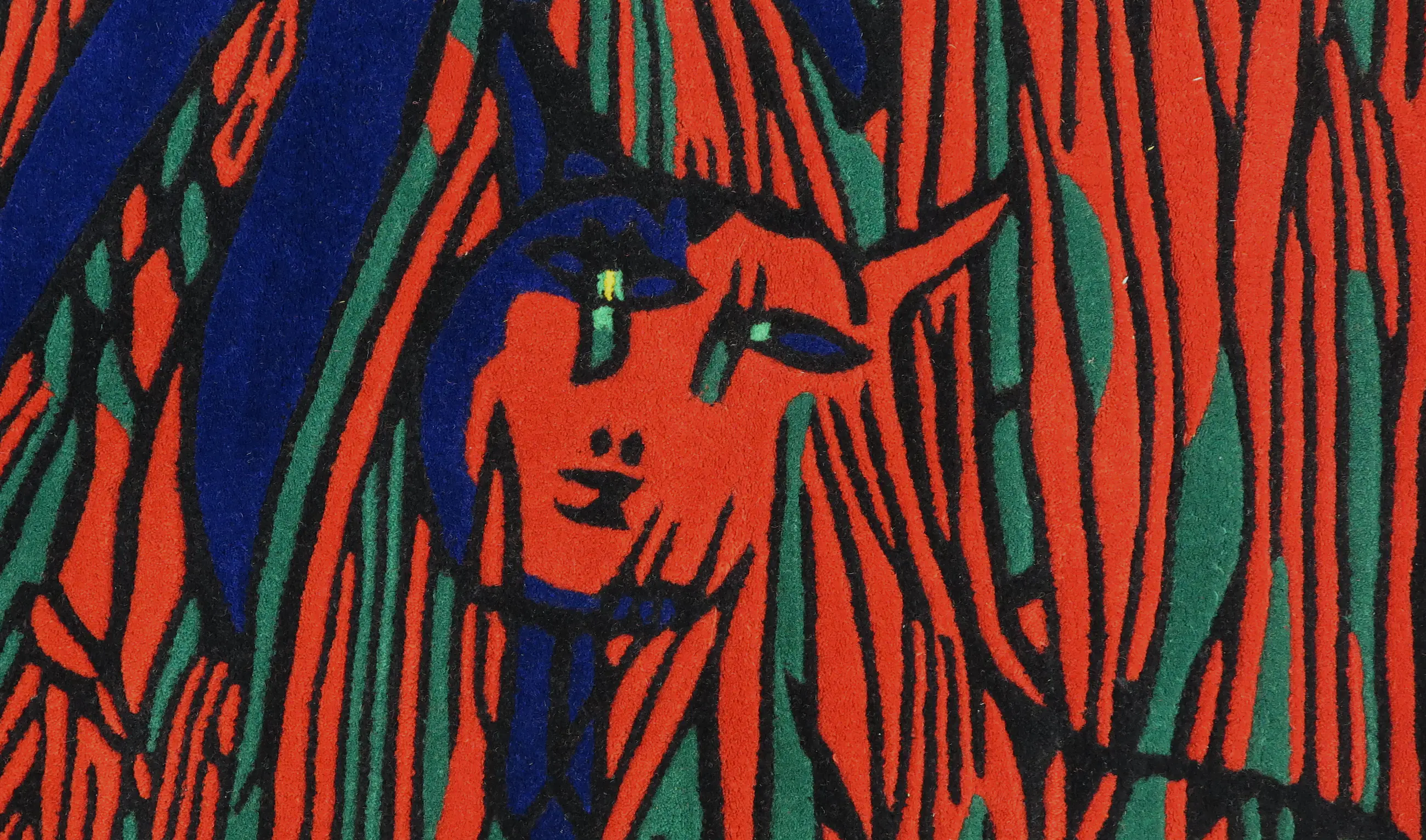 Groot, handgeknoopt en 100% scheerwollen, vloerkleed. Het vloerkleed, met de afbeelding Le chien bleu, is uitgegeven in een oplage van 125 exemplaren. Dit is nummer 38.