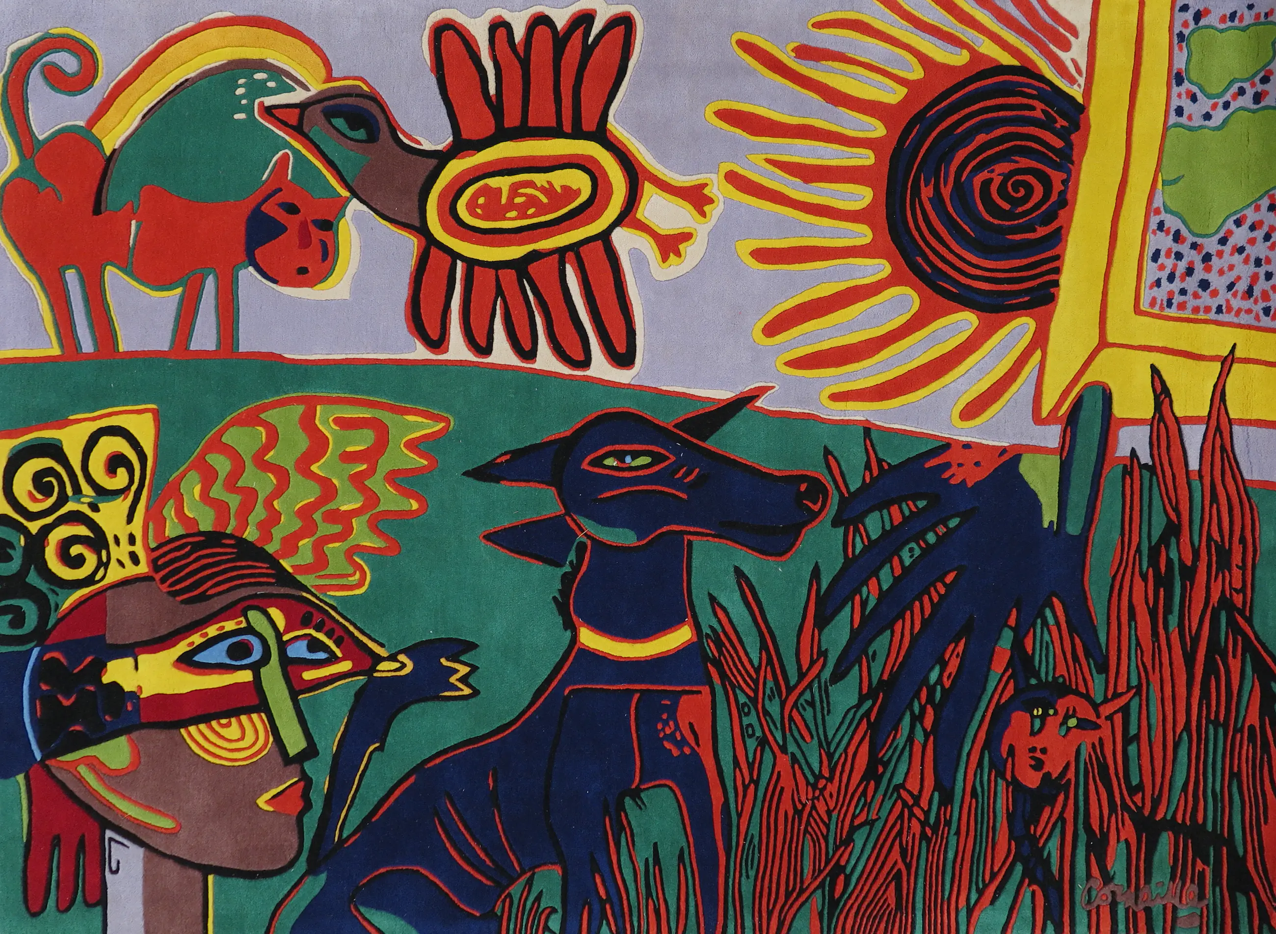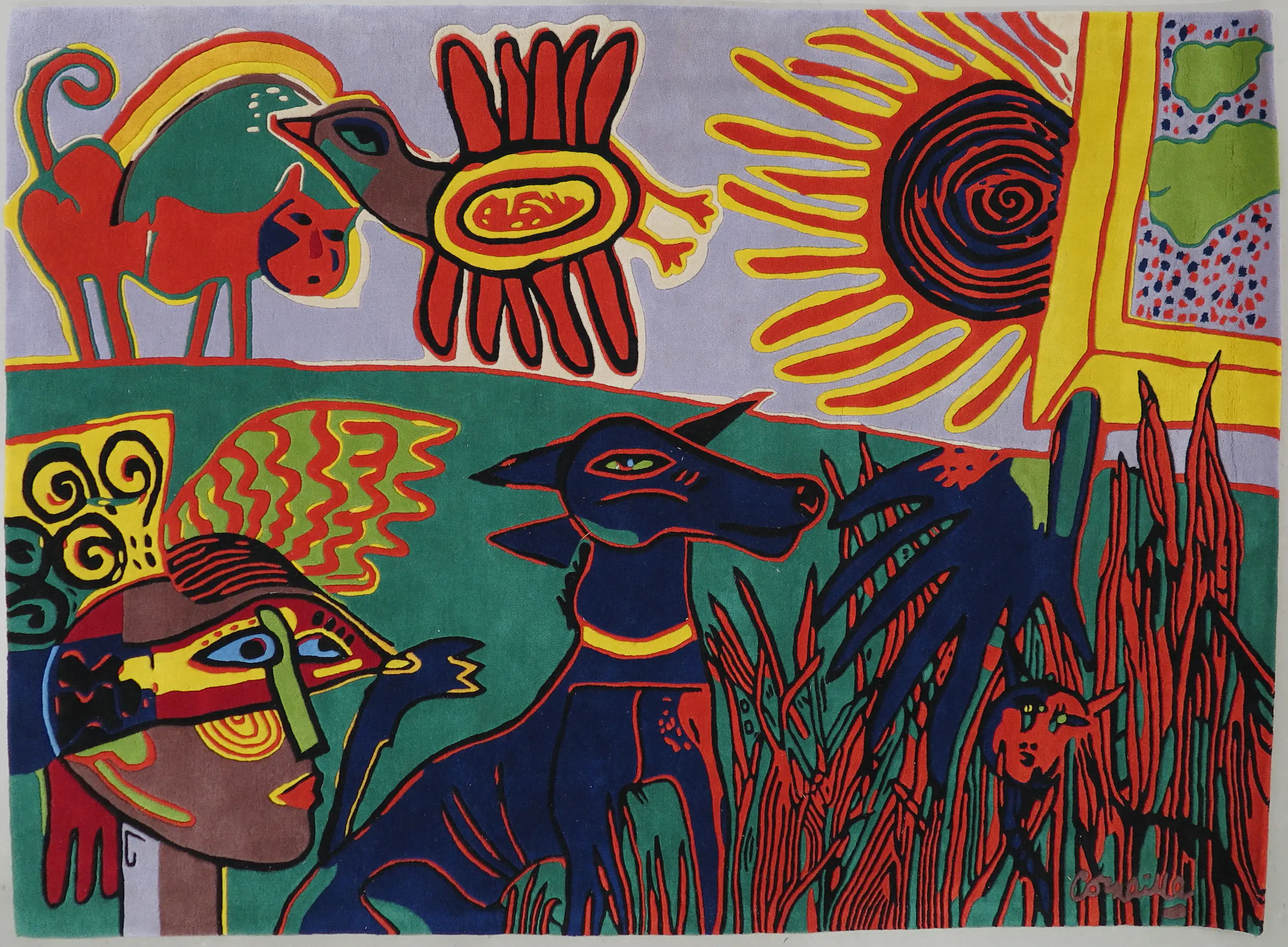 Groot, handgeknoopt en 100% scheerwollen, vloerkleed. Getiteld Le chien bleu.
