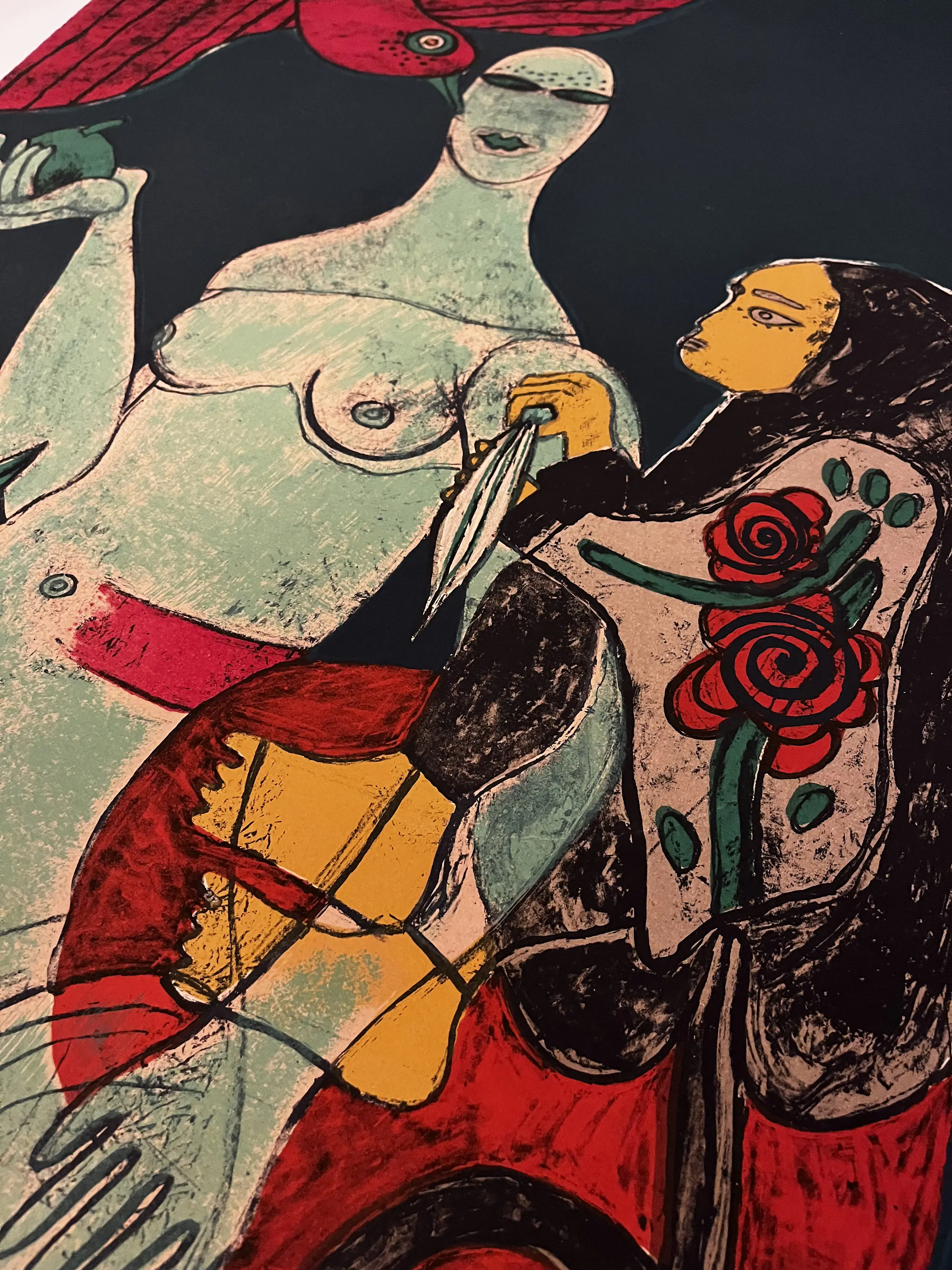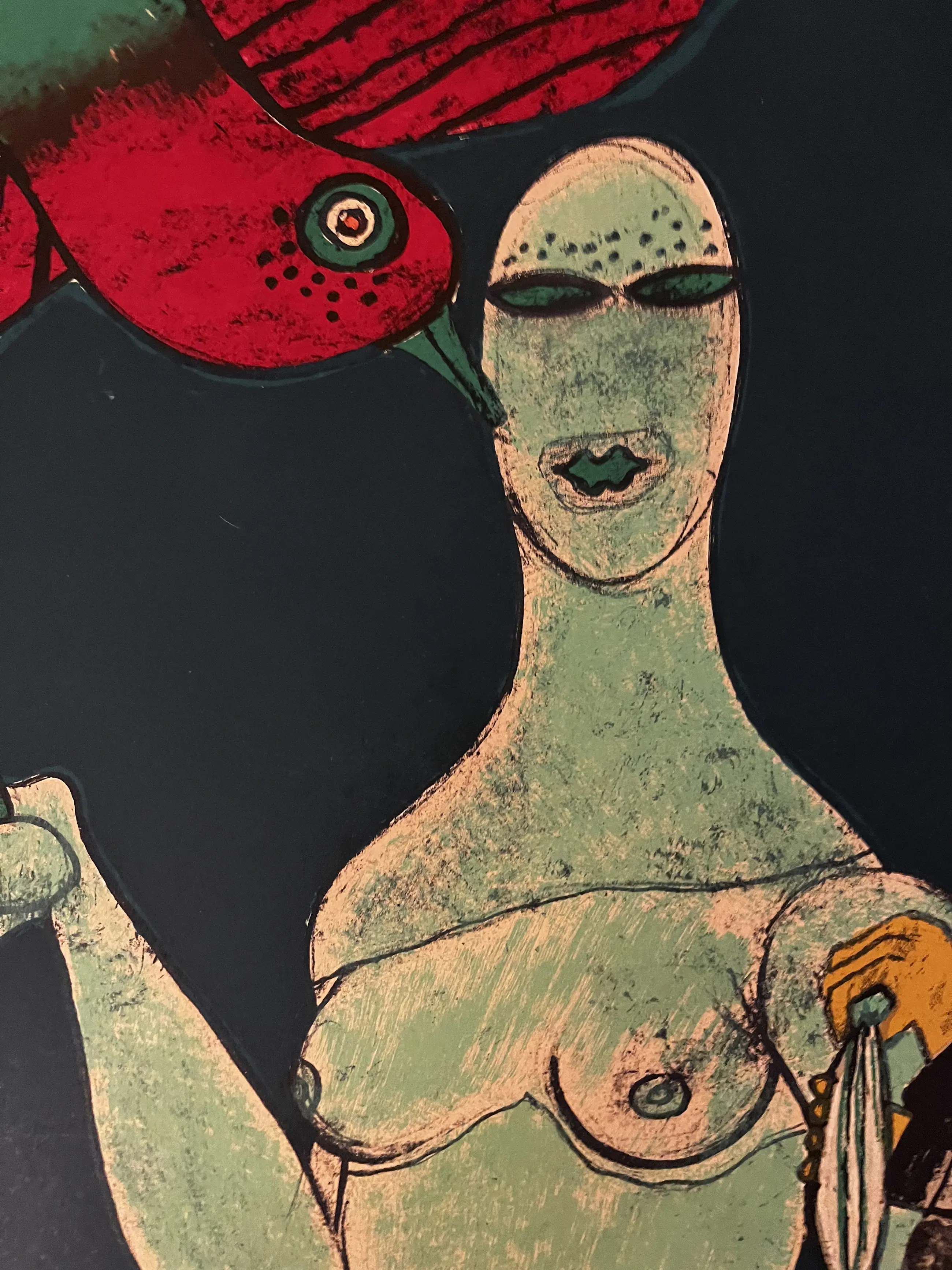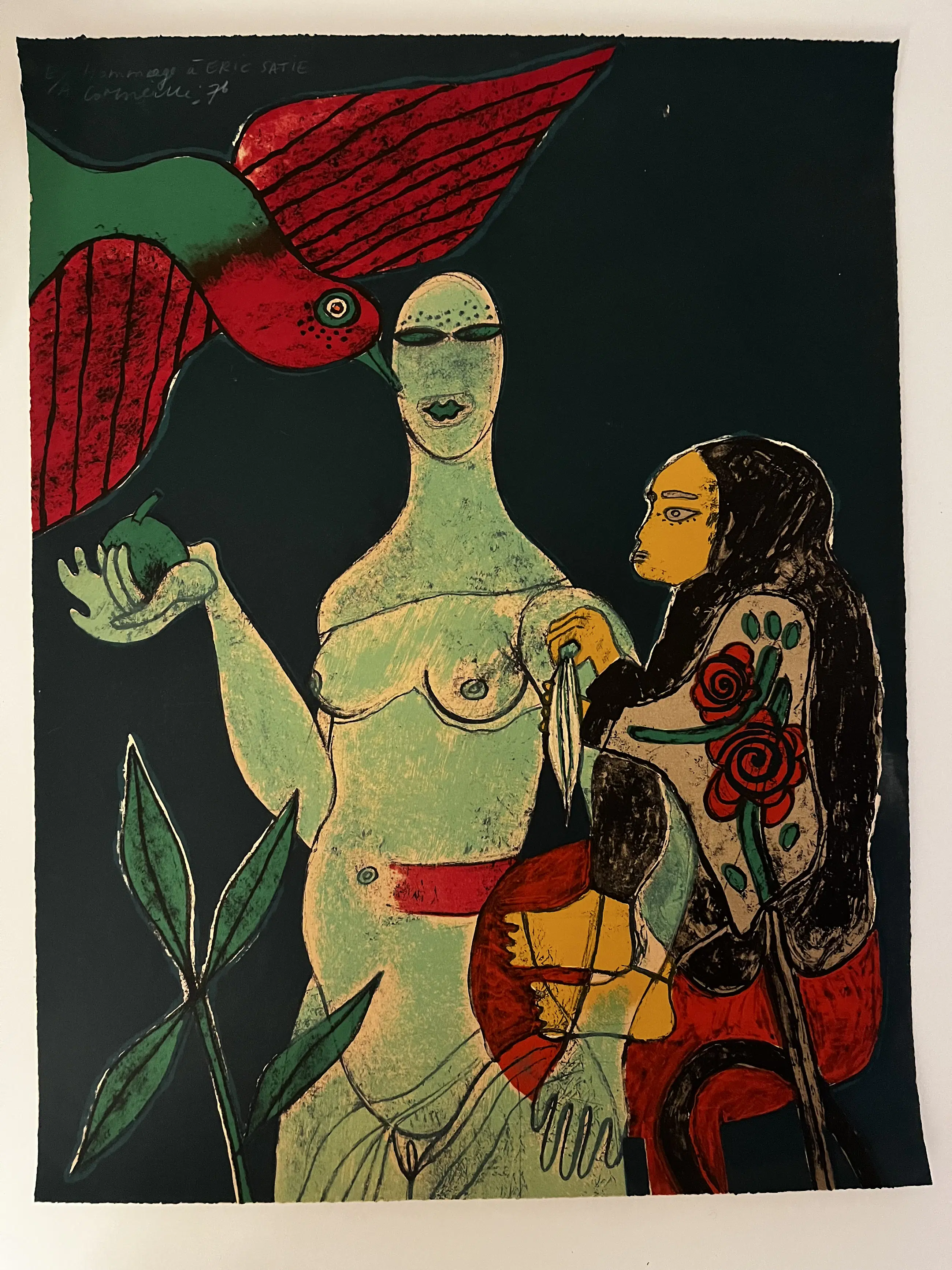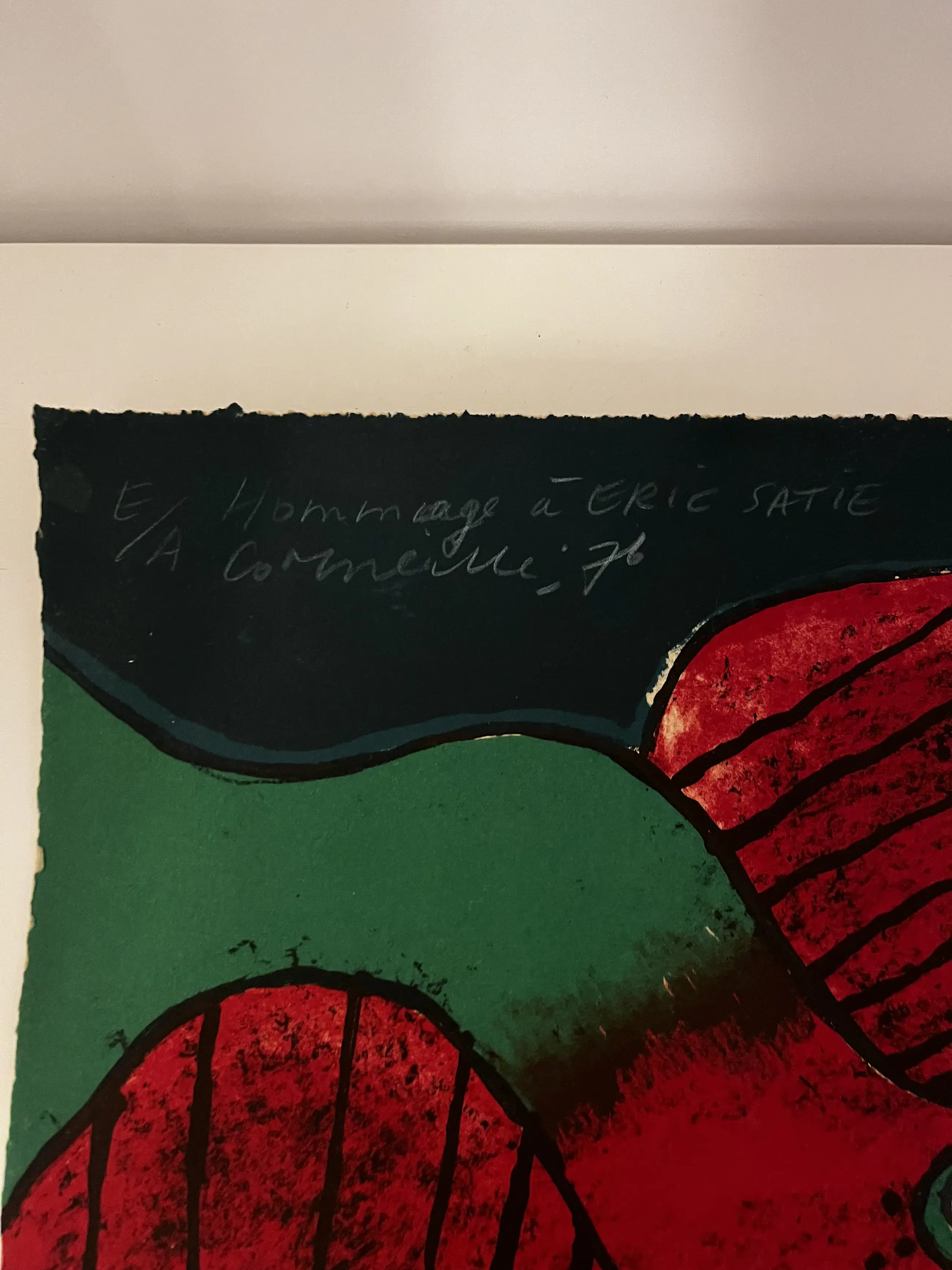Origineel grafisch werk van Corneille, getiteld Homage to Eric Satie, uit 1976. Dit kleurrijke en speelse werk is een eerbetoon aan de Franse componist Eric Satie en toont duidelijk Corneille’s kenmerkende Cobra-stijl met expressieve vormen en levendige kleuren.