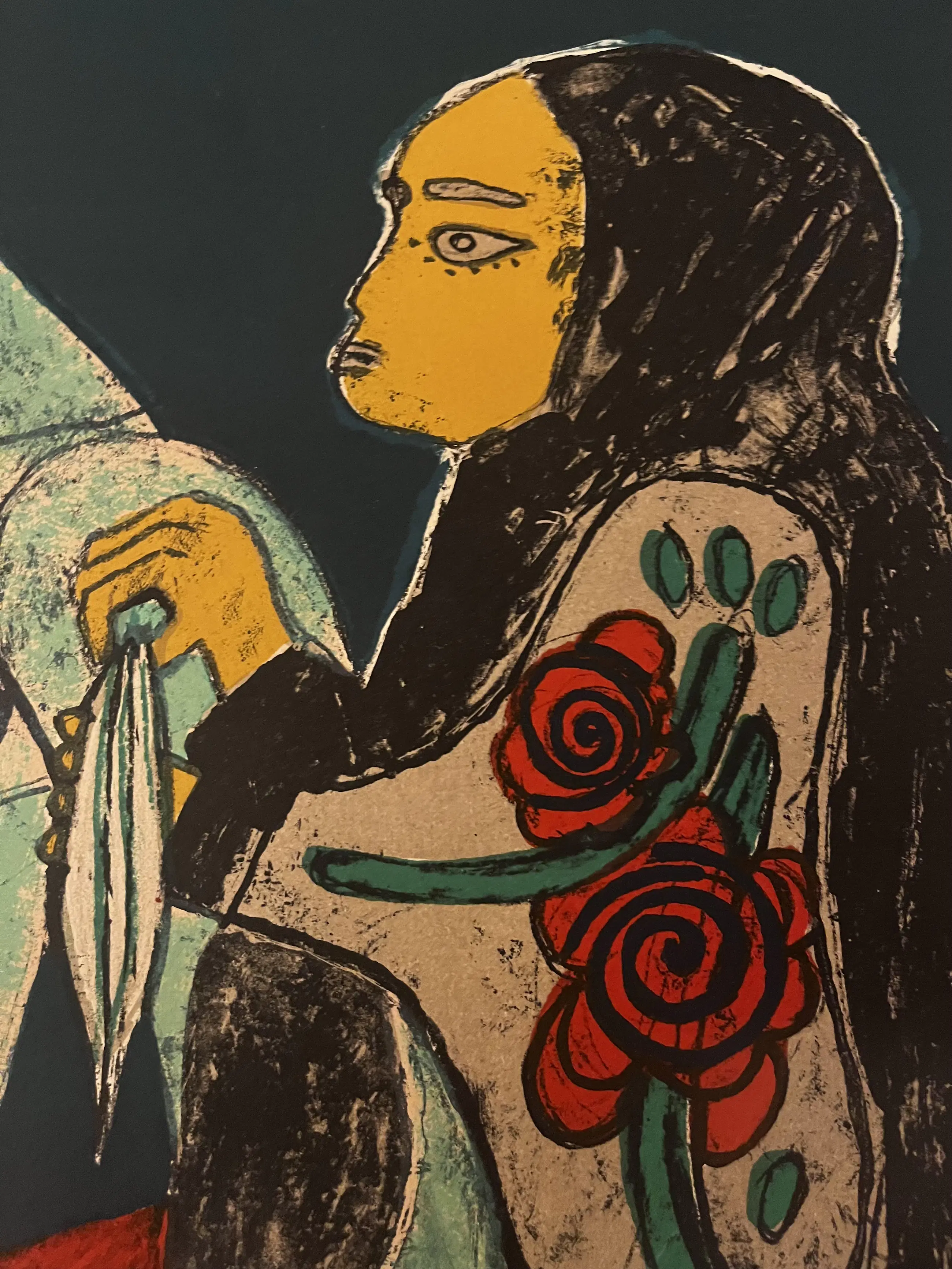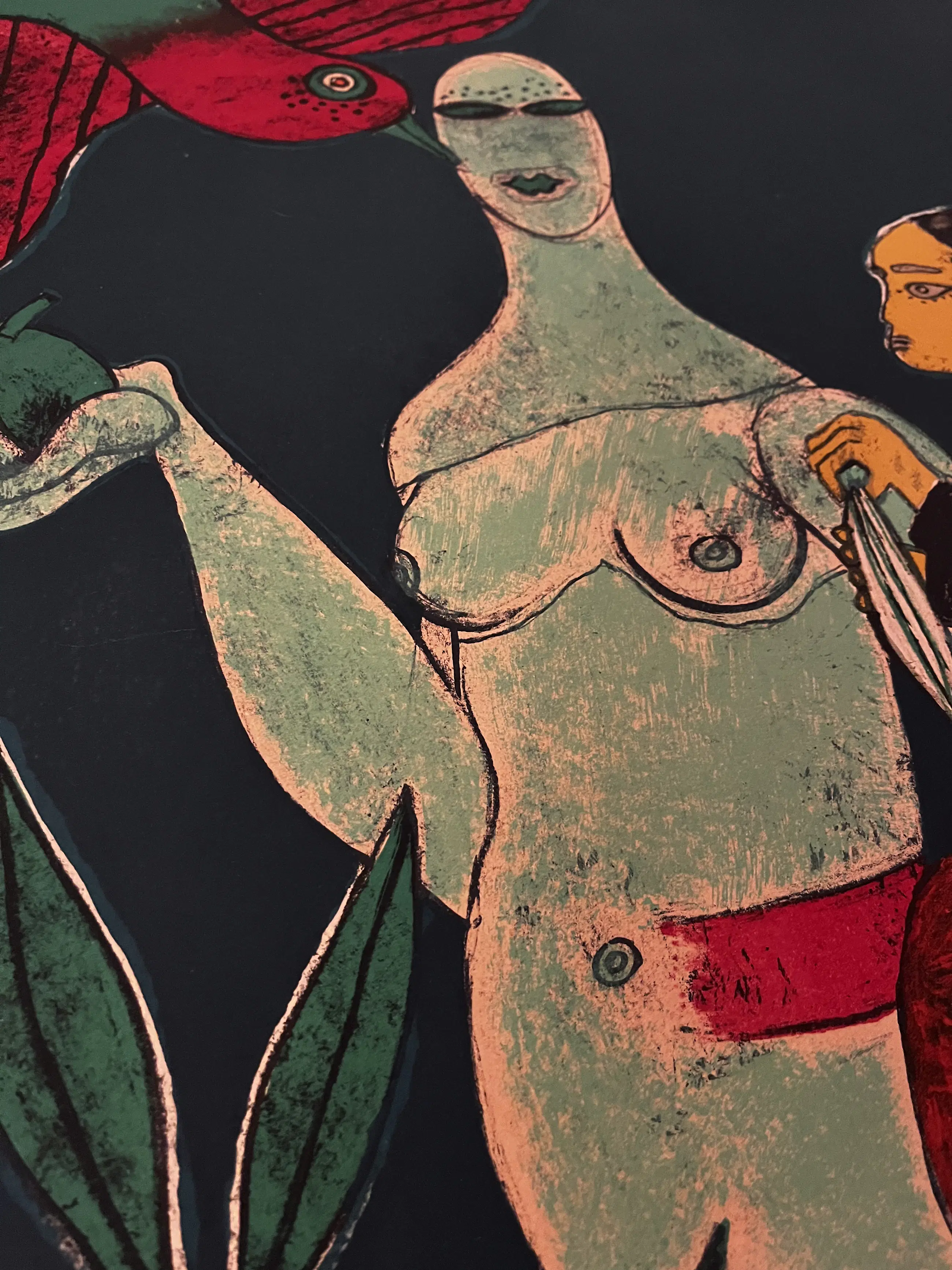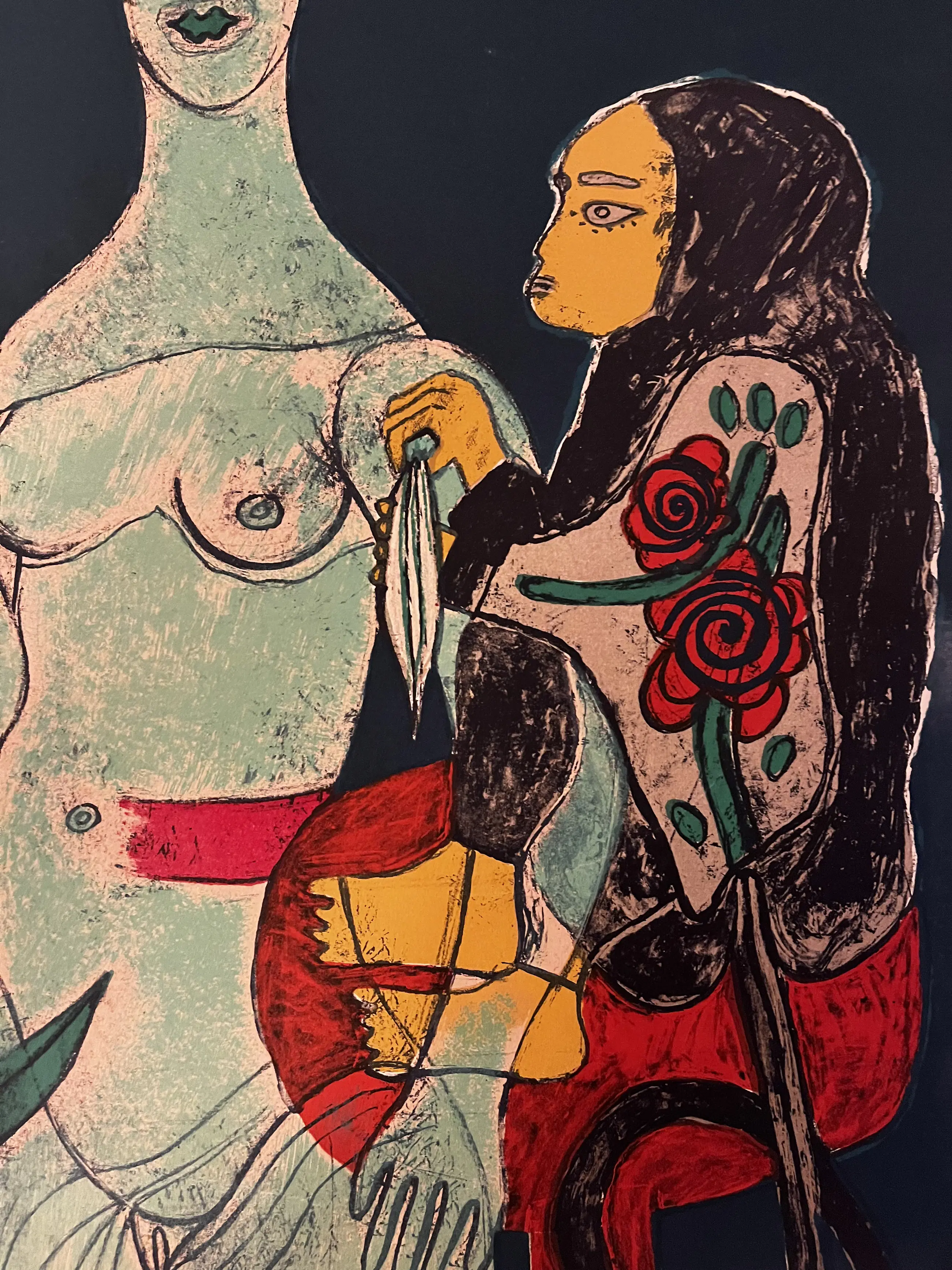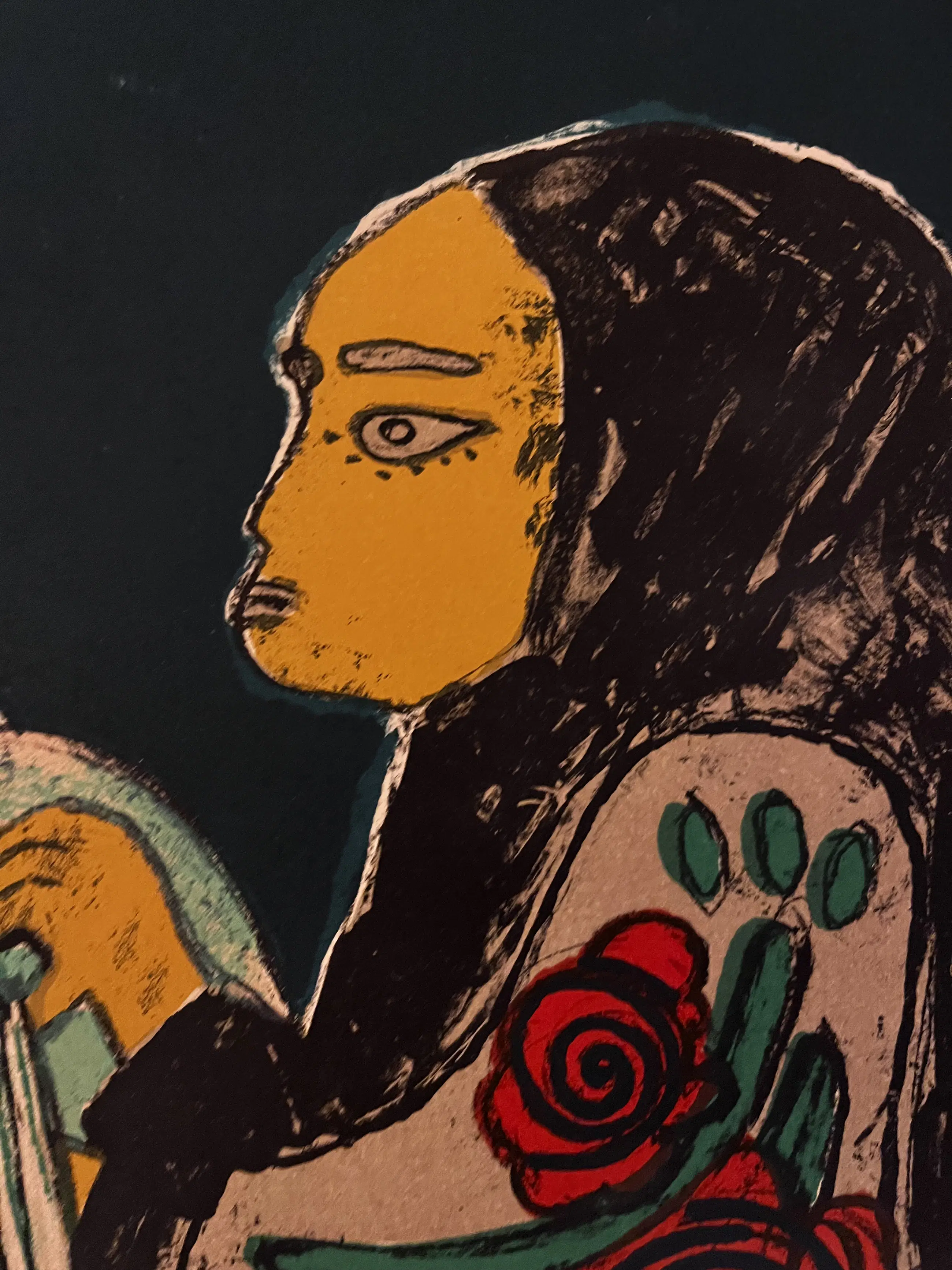 Origineel grafisch werk van Corneille, getiteld Homage to Eric Satie, uit 1976. Dit kleurrijke en speelse werk is een eerbetoon aan de Franse componist Eric Satie en toont duidelijk Corneille’s kenmerkende Cobra-stijl met expressieve vormen en levendige kleuren.