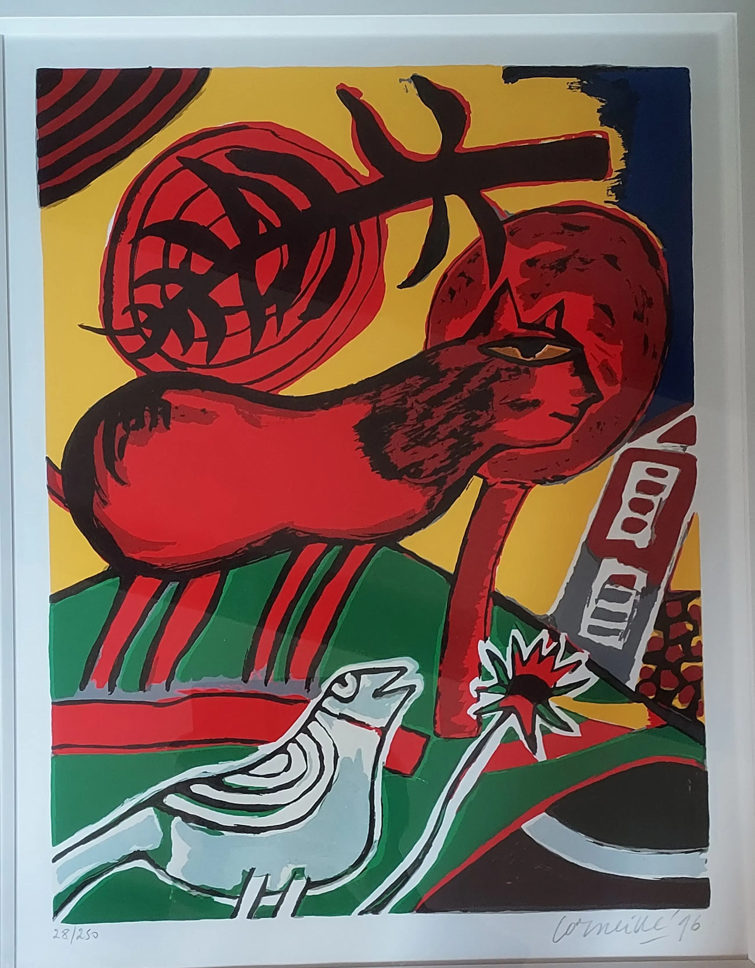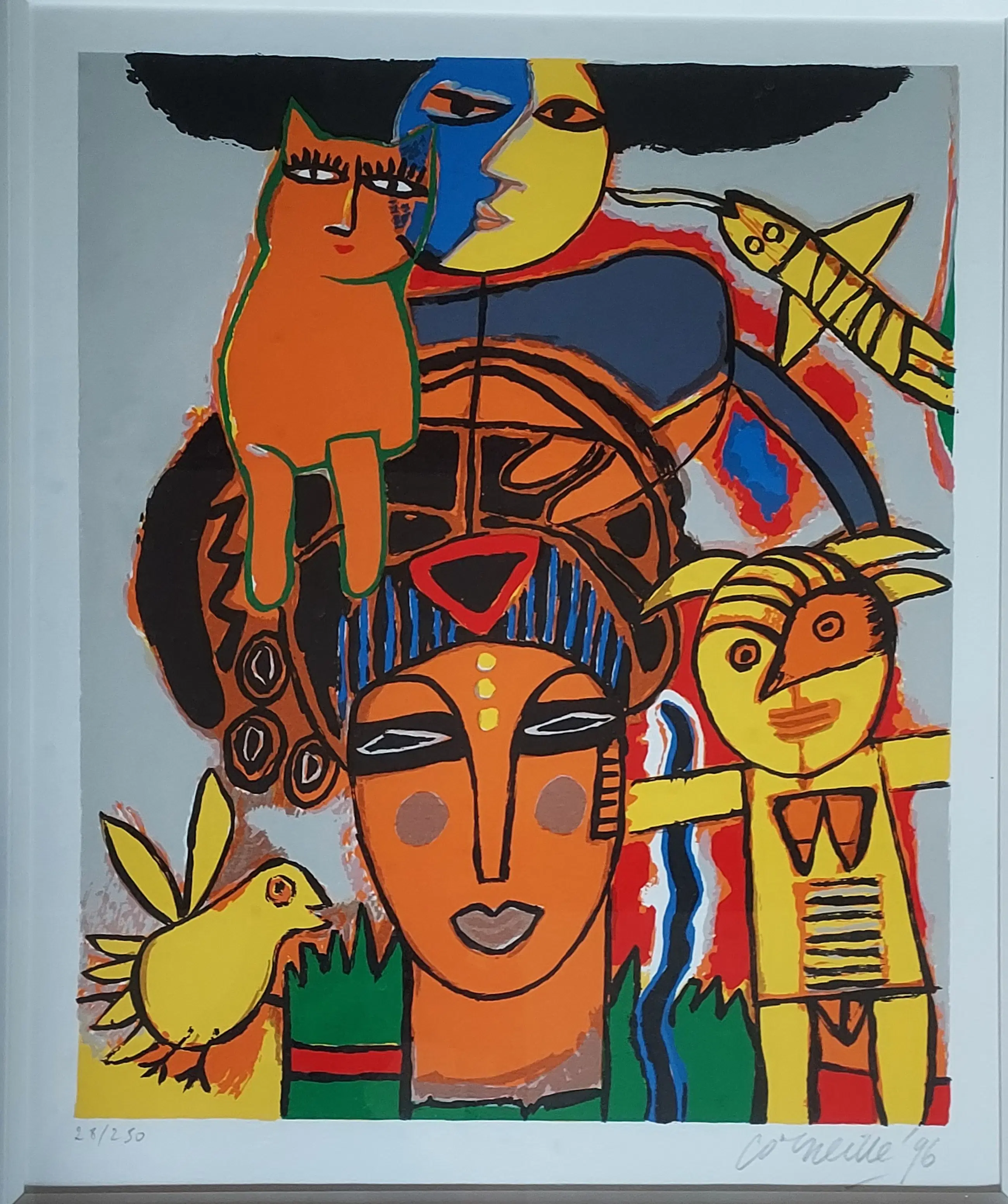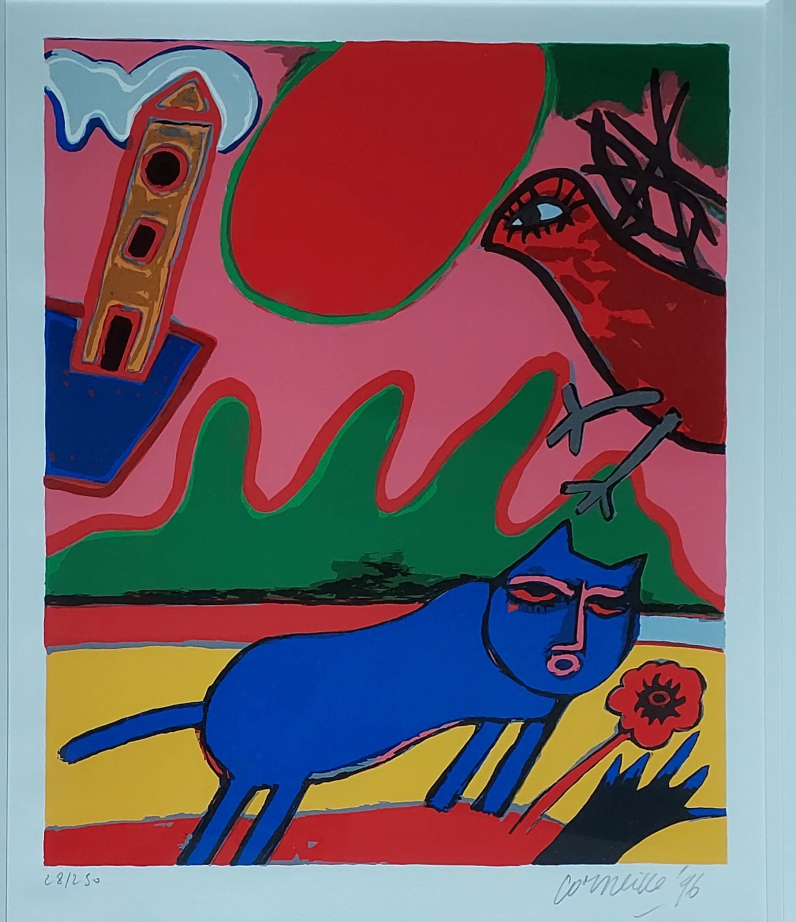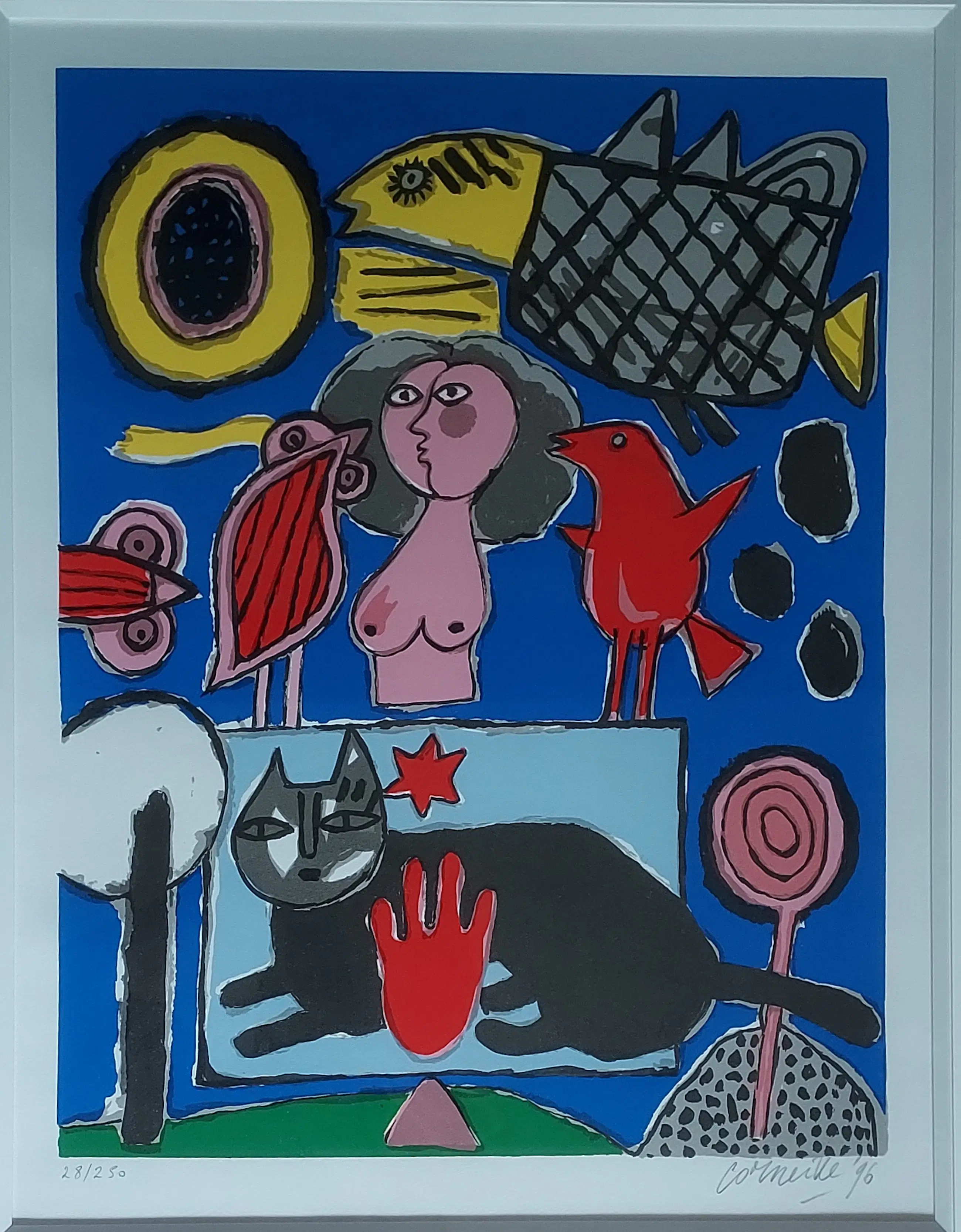 Uniek, complete serie Huit Chat (8 katten) Corneille 1996. Lithografie. Met de hand gesigneerd. Genummerd. (Alle 8) nr. 28 /250. Gekocht op de PAM in 1996. Bij Jaski art. Professioneel Ingelijst door Krützmann Amsterdam in houten lijst , mat zwart met glanzend koraalrode binnenkant. Verdiepte passe-partout. Kunststof glas (ivm gewicht) In perfecte staat. niet eerder alle 8 in één koop aangeboden. Afmetingen: Incl. Lijst 56x69cm. Afb 33x43cm Papiermaat 39x56 cm.
