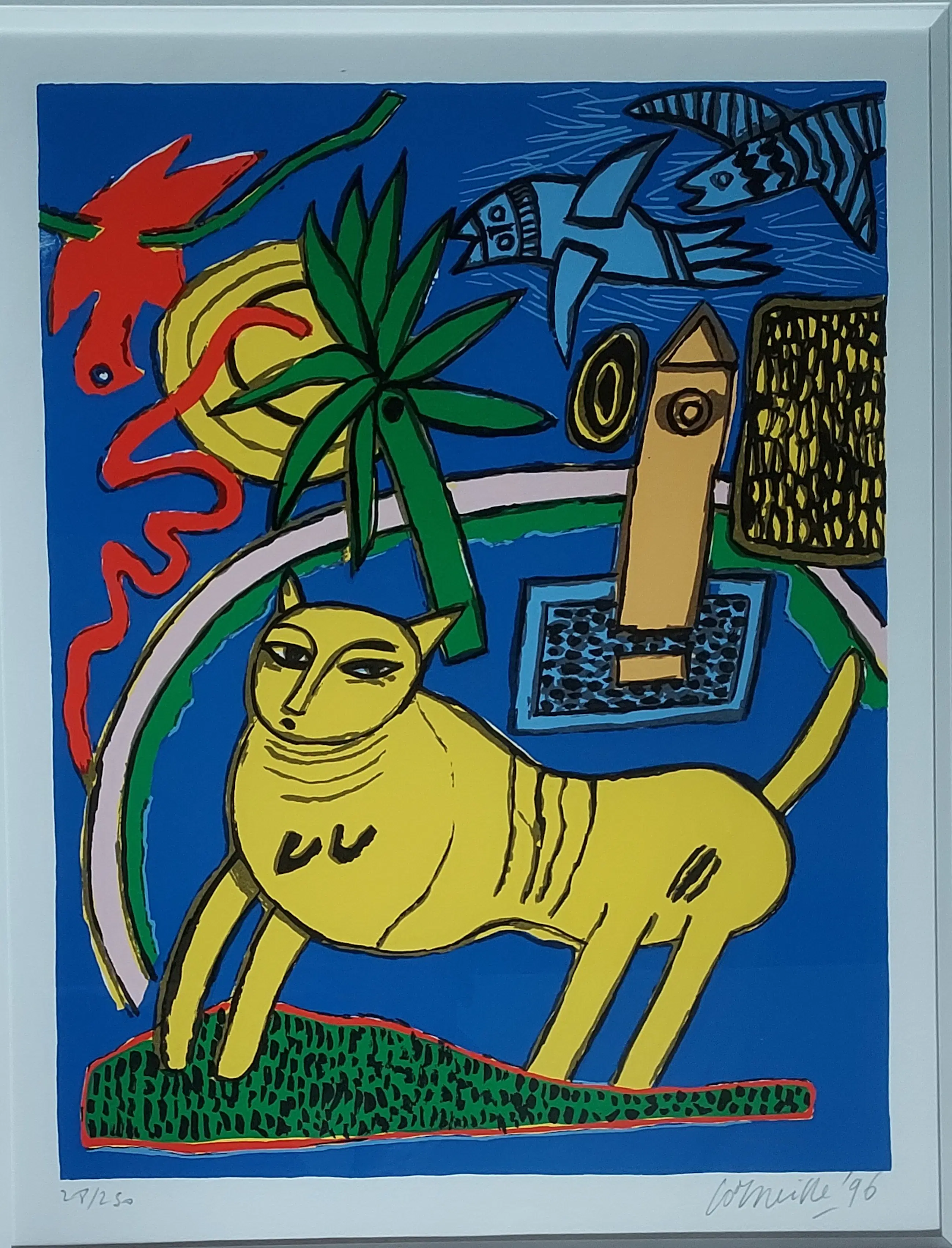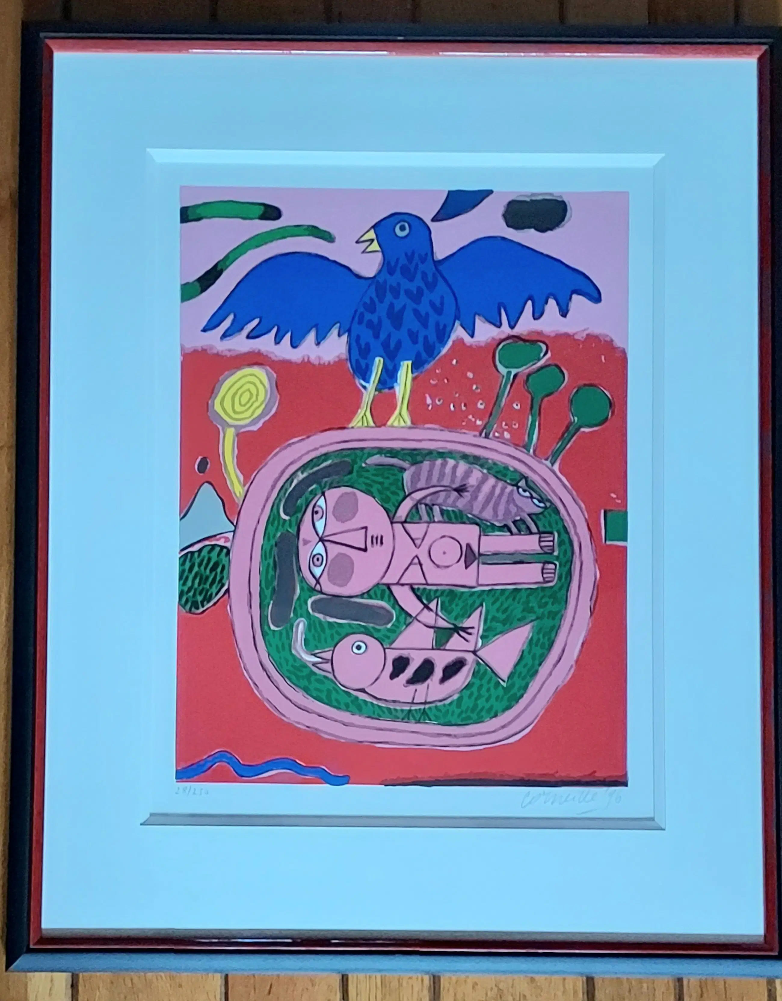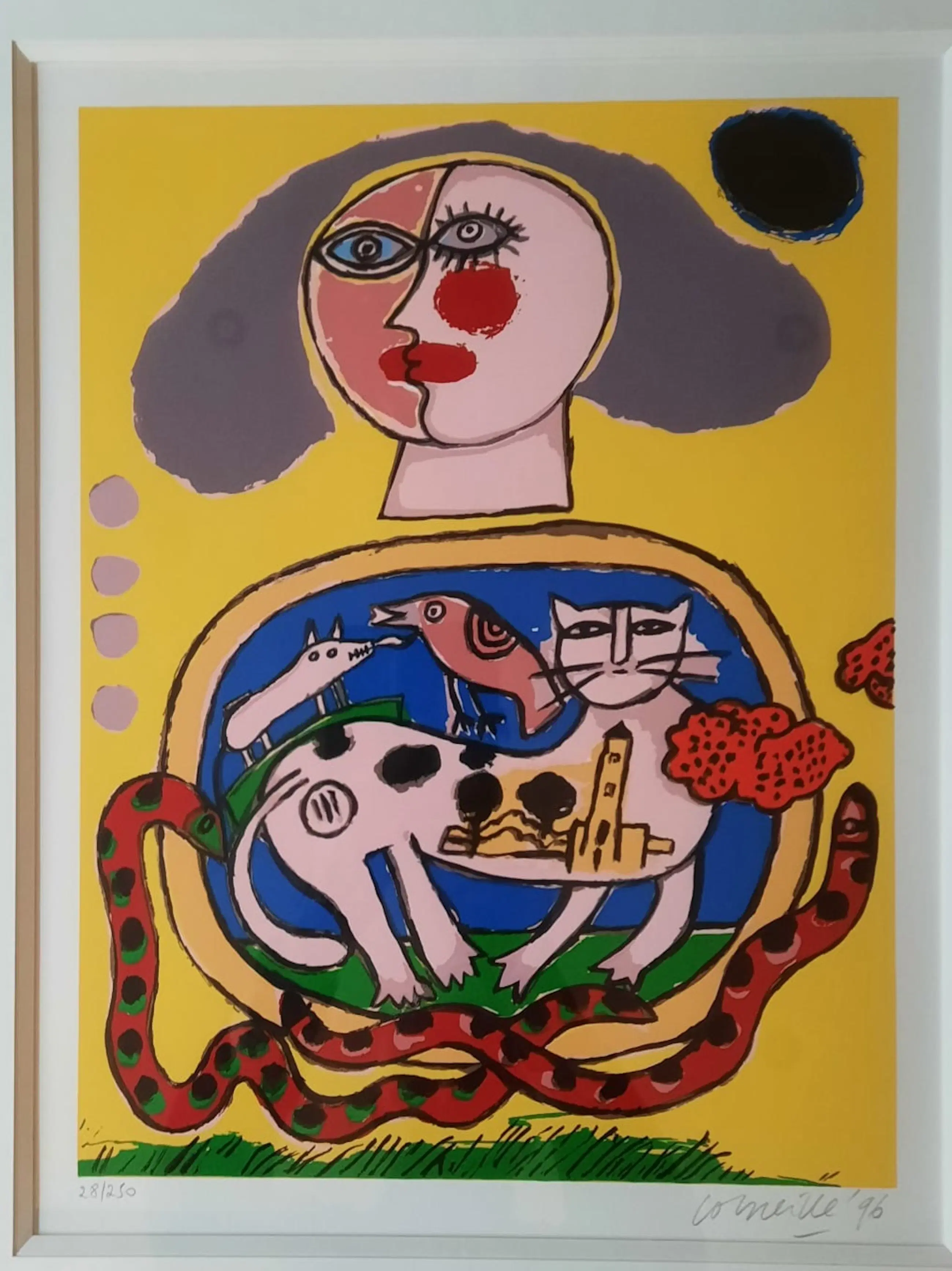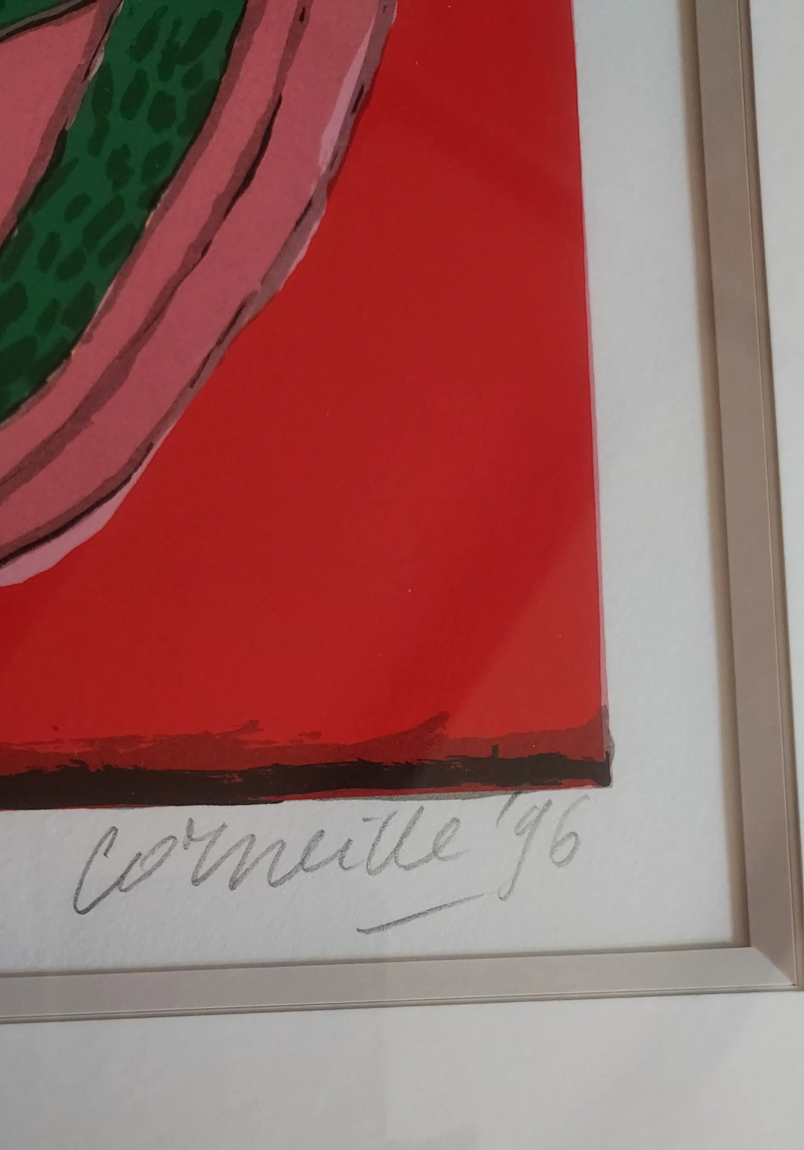 Uniek, complete serie Huit Chat (8 katten) Corneille 1996. Lithografie. Met de hand gesigneerd. Genummerd. (Alle 8) nr. 28 /250. Gekocht op de PAM in 1996. Bij Jaski art. Professioneel Ingelijst door Krützmann Amsterdam in houten lijst , mat zwart met glanzend koraalrode binnenkant. Verdiepte passe-partout. Kunststof glas (ivm gewicht) In perfecte staat. niet eerder alle 8 in één koop aangeboden. Afmetingen: Incl. Lijst 56x69cm. Afb 33x43cm Papiermaat 39x56 cm.
