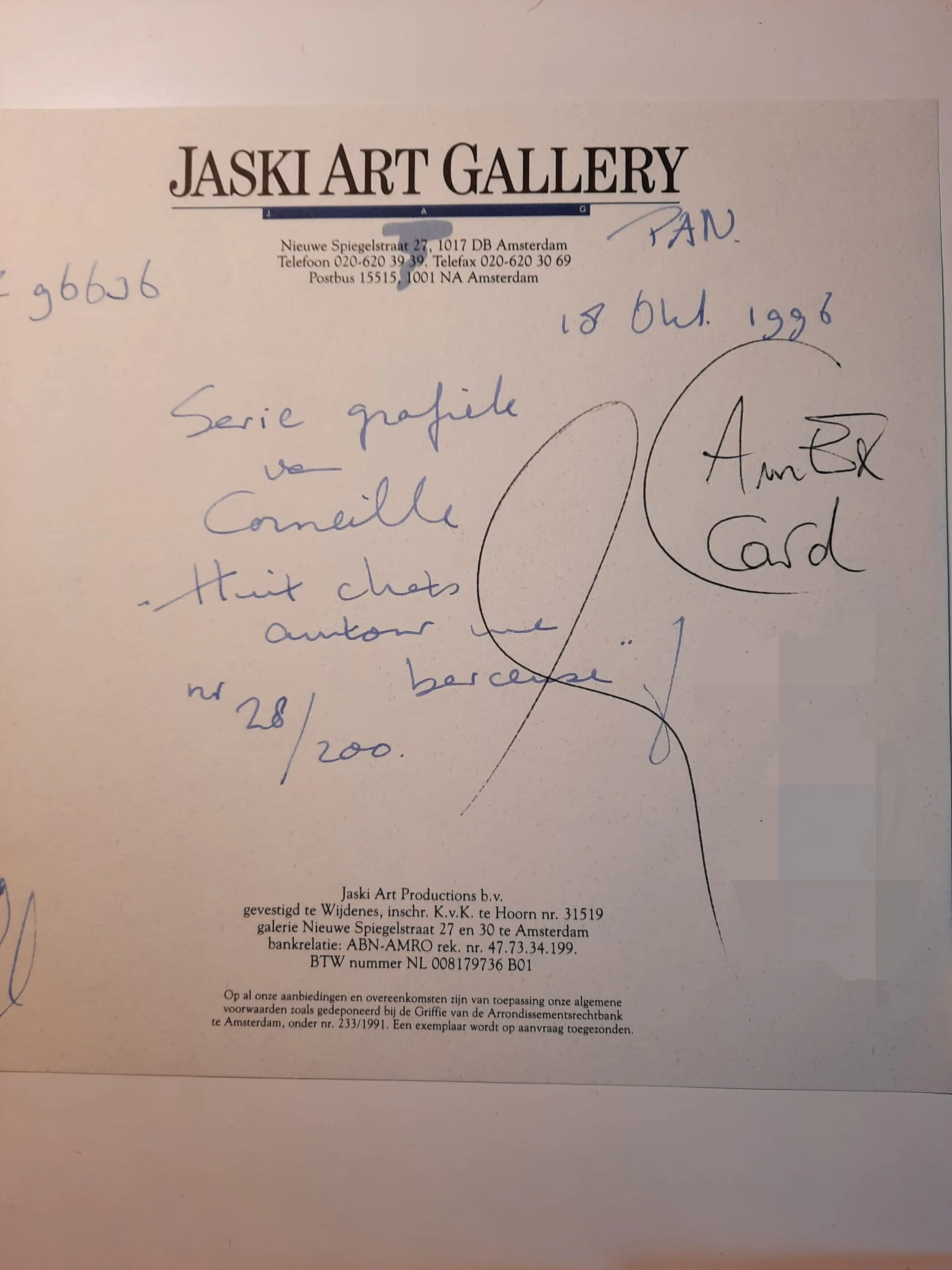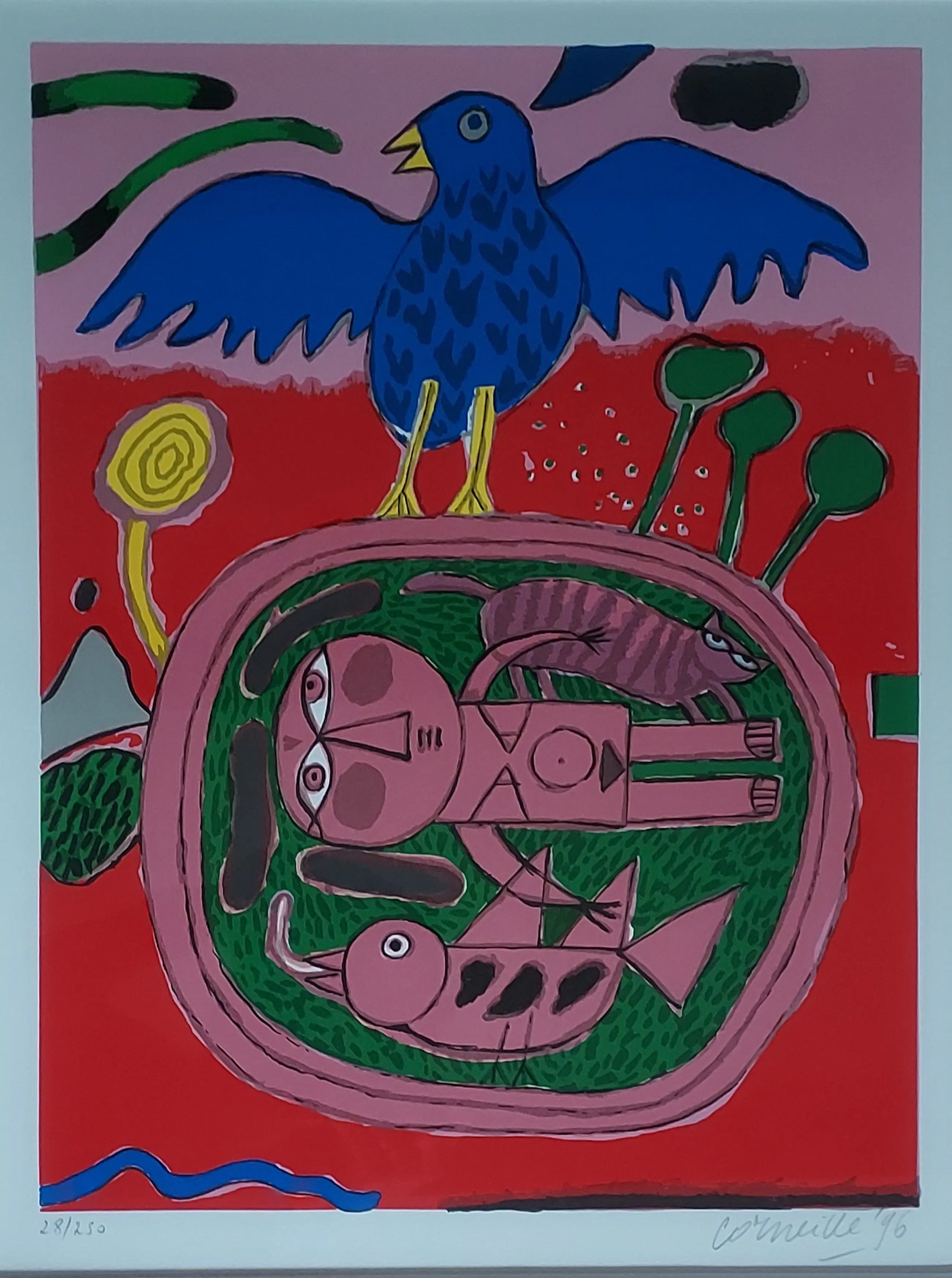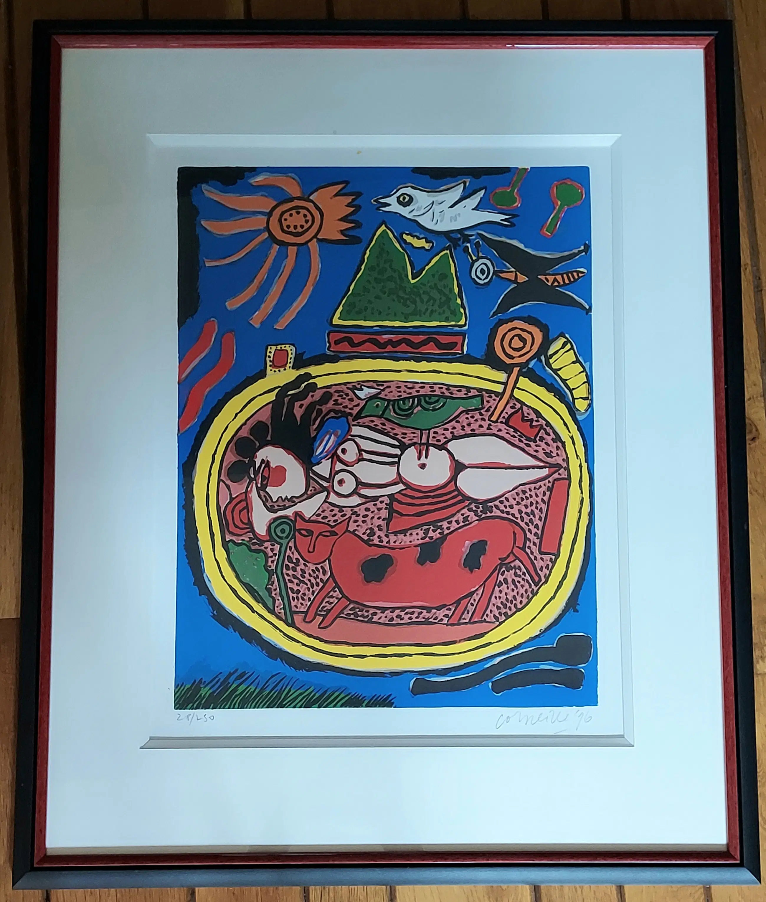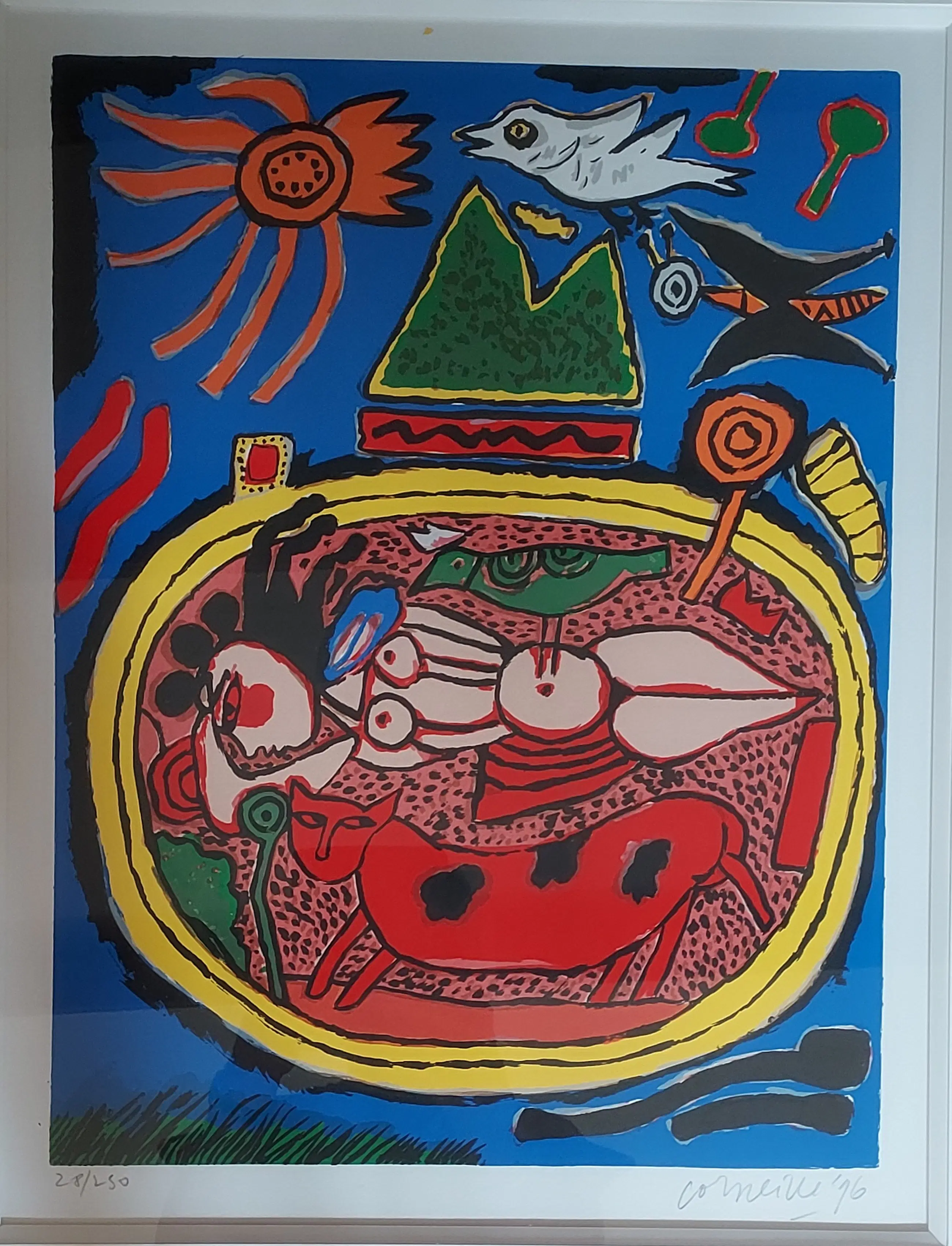 Uniek, complete serie Huit Chat (8 katten) Corneille 1996. Lithografie. Met de hand gesigneerd. Genummerd. (Alle 8) nr. 28 /250. Gekocht op de PAM in 1996. Bij Jaski art. Professioneel Ingelijst door Krützmann Amsterdam in houten lijst , mat zwart met glanzend koraalrode binnenkant. Verdiepte passe-partout. Kunststof glas (ivm gewicht) In perfecte staat. niet eerder alle 8 in één koop aangeboden. Afmetingen: Incl. Lijst 56x69cm. Afb 33x43cm Papiermaat 39x56 cm.