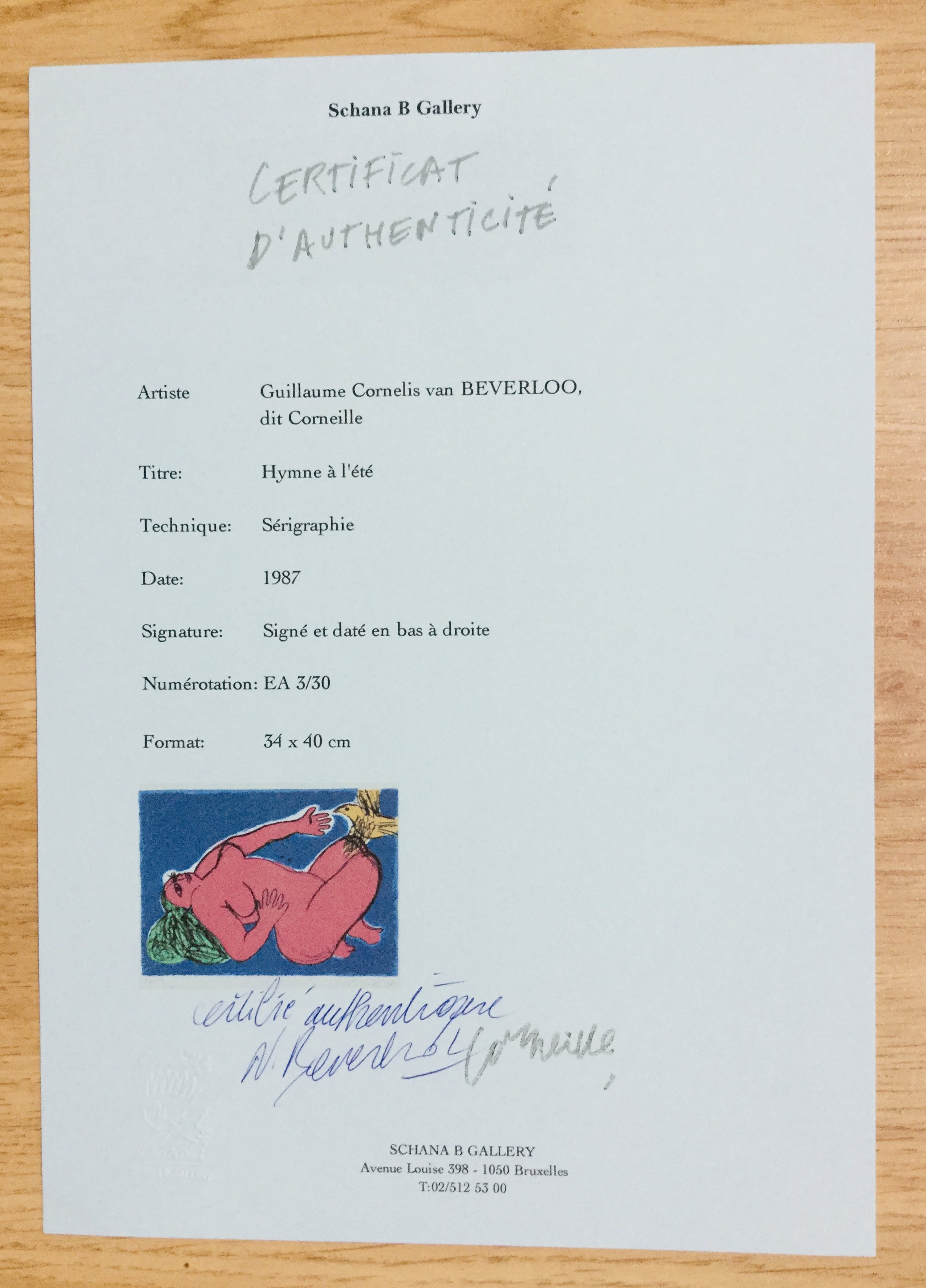 COA: Certificaat van echtheid wordt erbij geleverd getekend door Natacha van Beverloo, weduwe van Corneille.