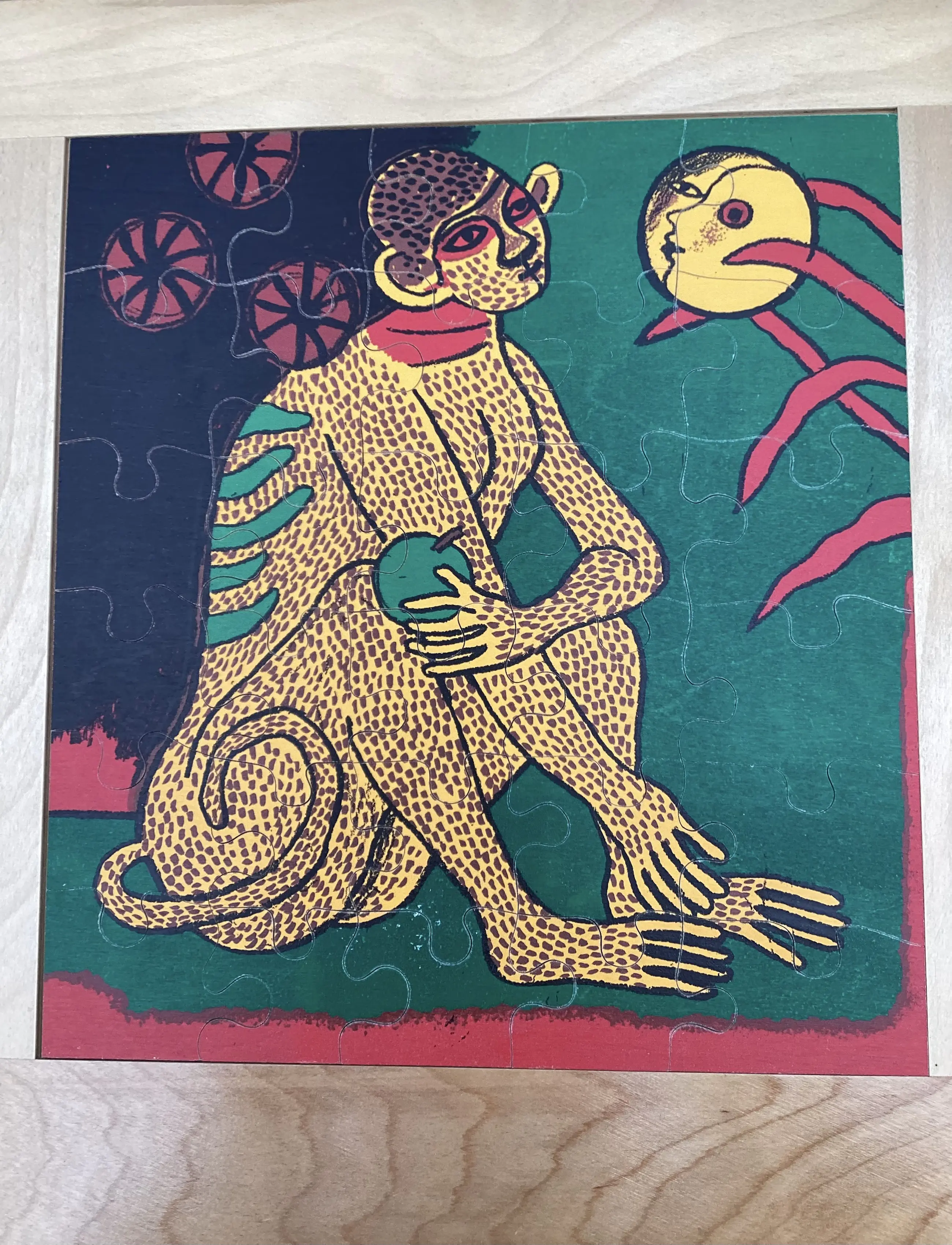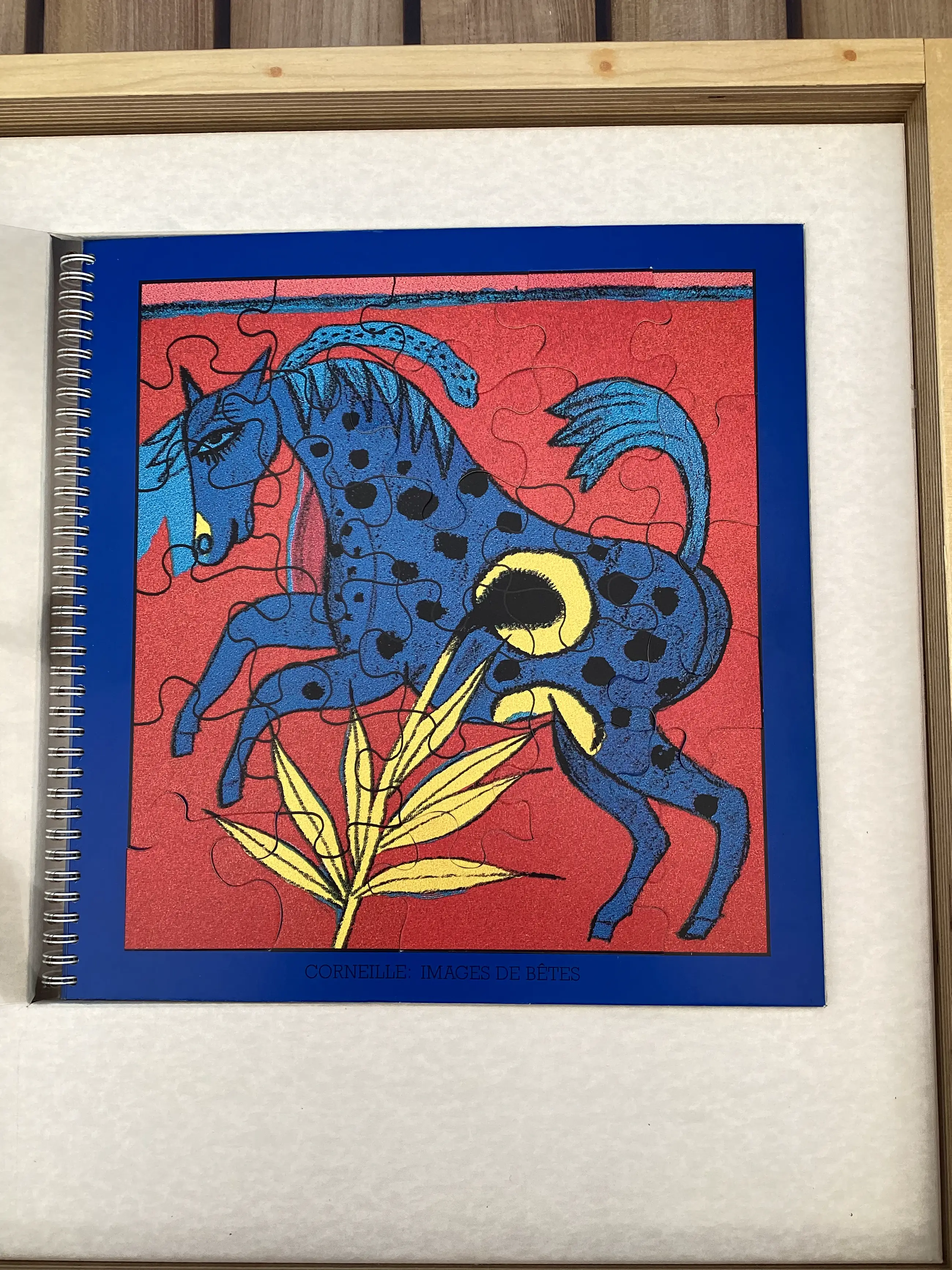 Houten box h. 51 x b.45 in zeer goede staat. Inhoud . 1 puzzel Aap h. 33 X b. 30 cm zit in houten kader h.47 x b.41. 1 Puzzel Paard h.32 x b. 31 boek 1 litho Paard h.33 x b. 30 cm. Vermoedelijk waren er meer litho's… Ik heb de kist zo gekocht in 1989.