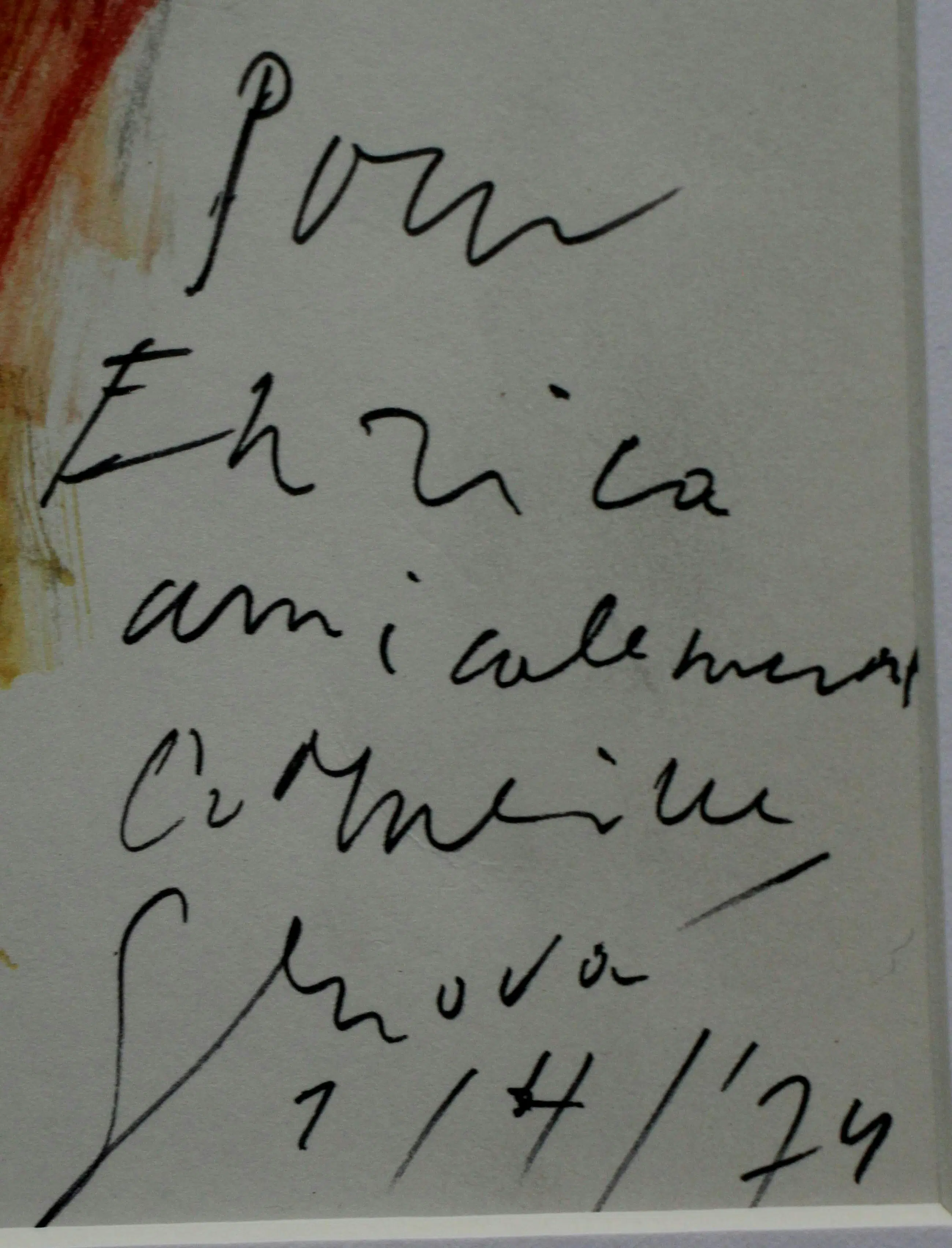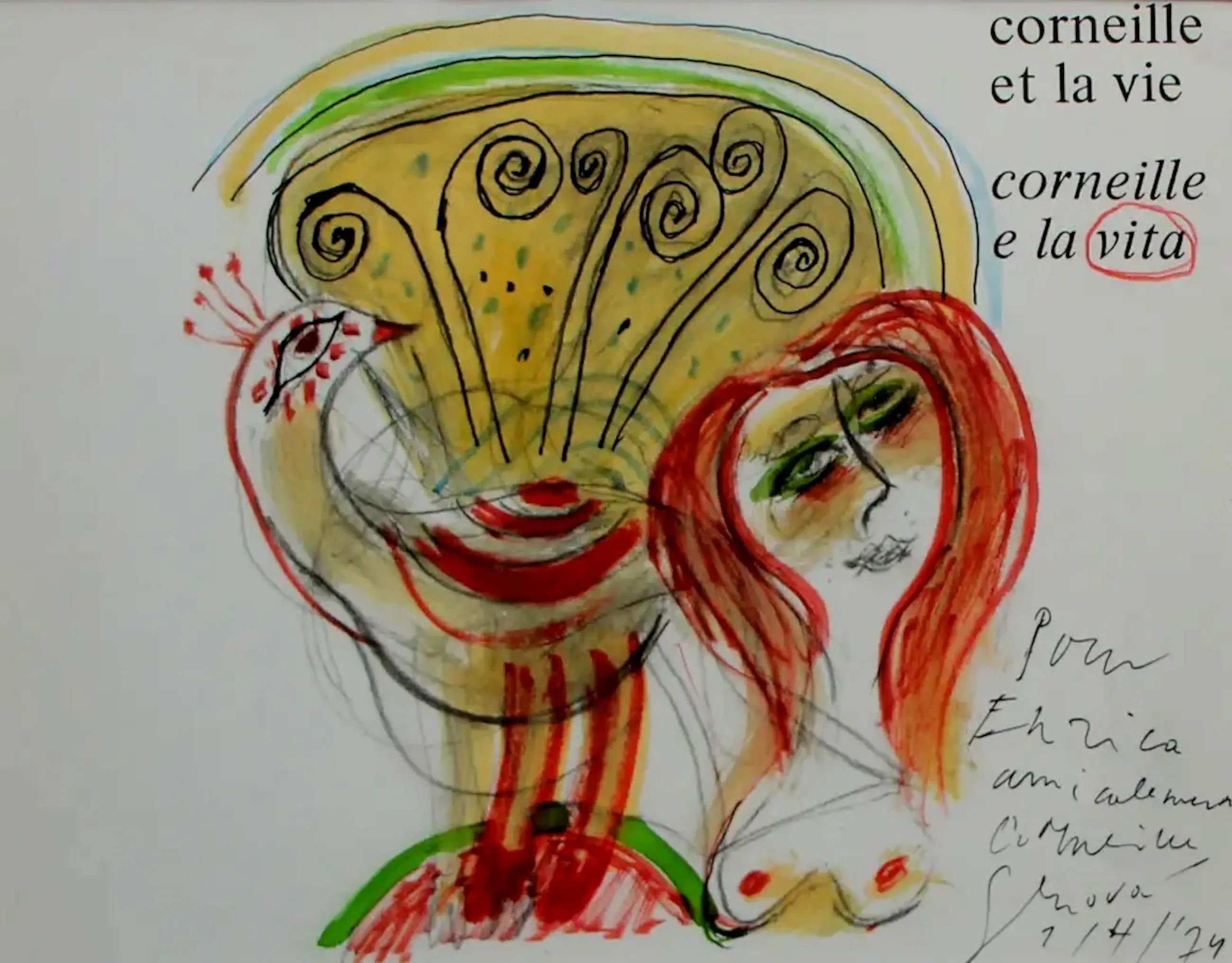 Ingelijste zeefdruk van Corneille. Titel: Et la vie, e la vita. Jaar: 1974. In opdracht: voor Ehrica, mijn vriendin. Afmetingen incl lijst: H40 x b45cm. Afmetingen voorstelling: H23 x b29.5cm. Het werk is rechtsonder gesigneerd door de kunstenaar. De authenticiteit van het aangeboden werk wordt volledig gegarandeerd. Een certificaat van echtheid kan, op aanvraag, worden gemaild.