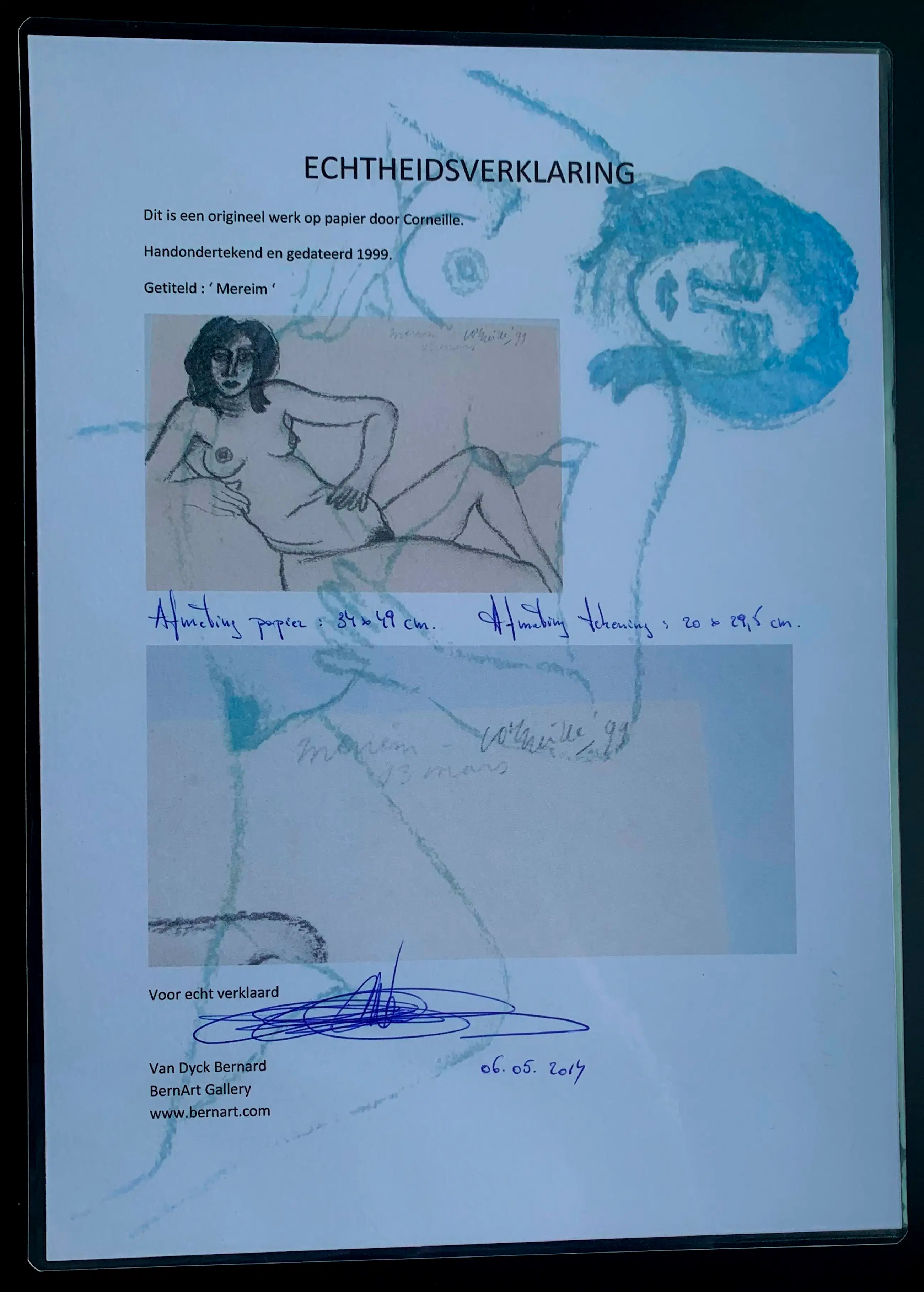 Ingelijste gemengde techniek, op mooi dik papier, van Corneille. Titel: Mereim. Jaar: 1999. Afmetingen incl lijst: H34 x b49cm. Afmetingen voorstelling: H20.5 x b29.5cm. Het werk is, rechts bovenaan, gesigneerd en gedateerd door de kunstenaar. Inclusief echtheidsverklaring van BernArt Gallery.