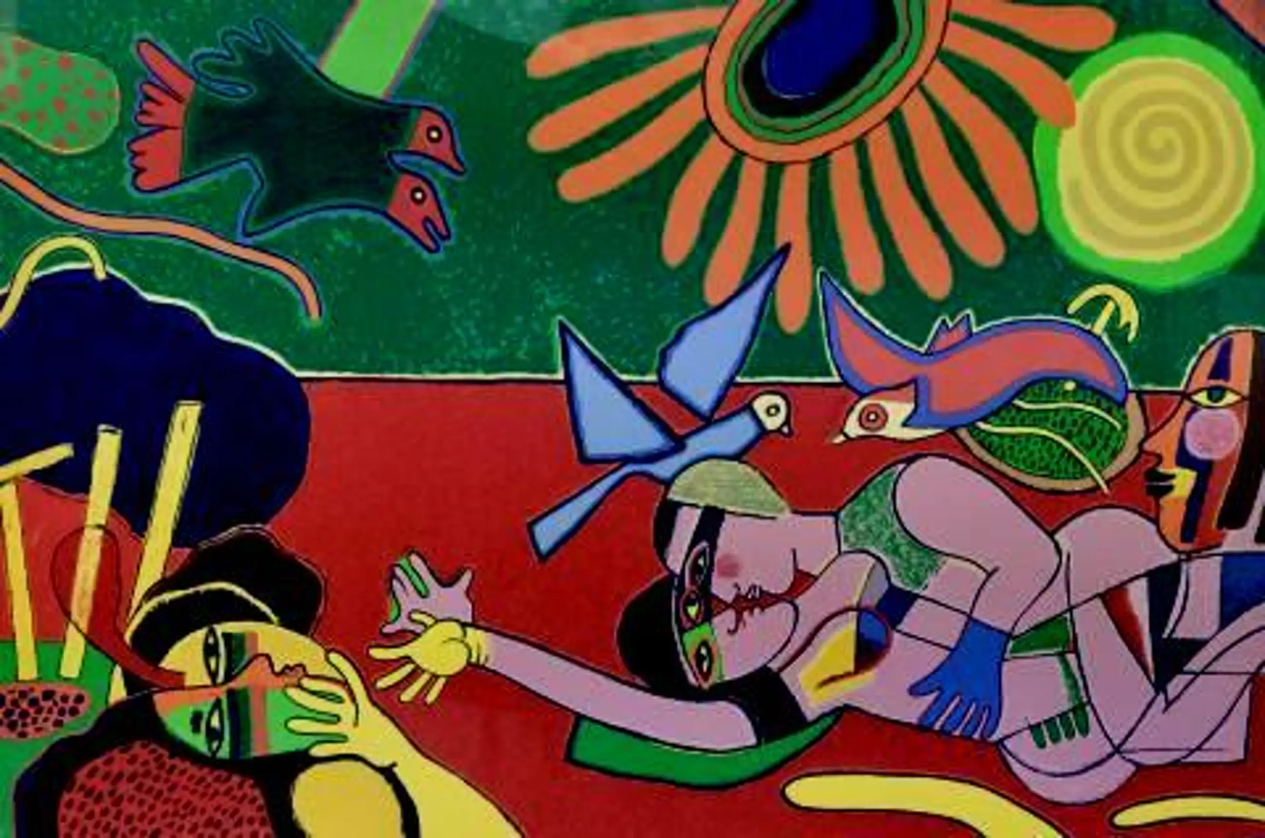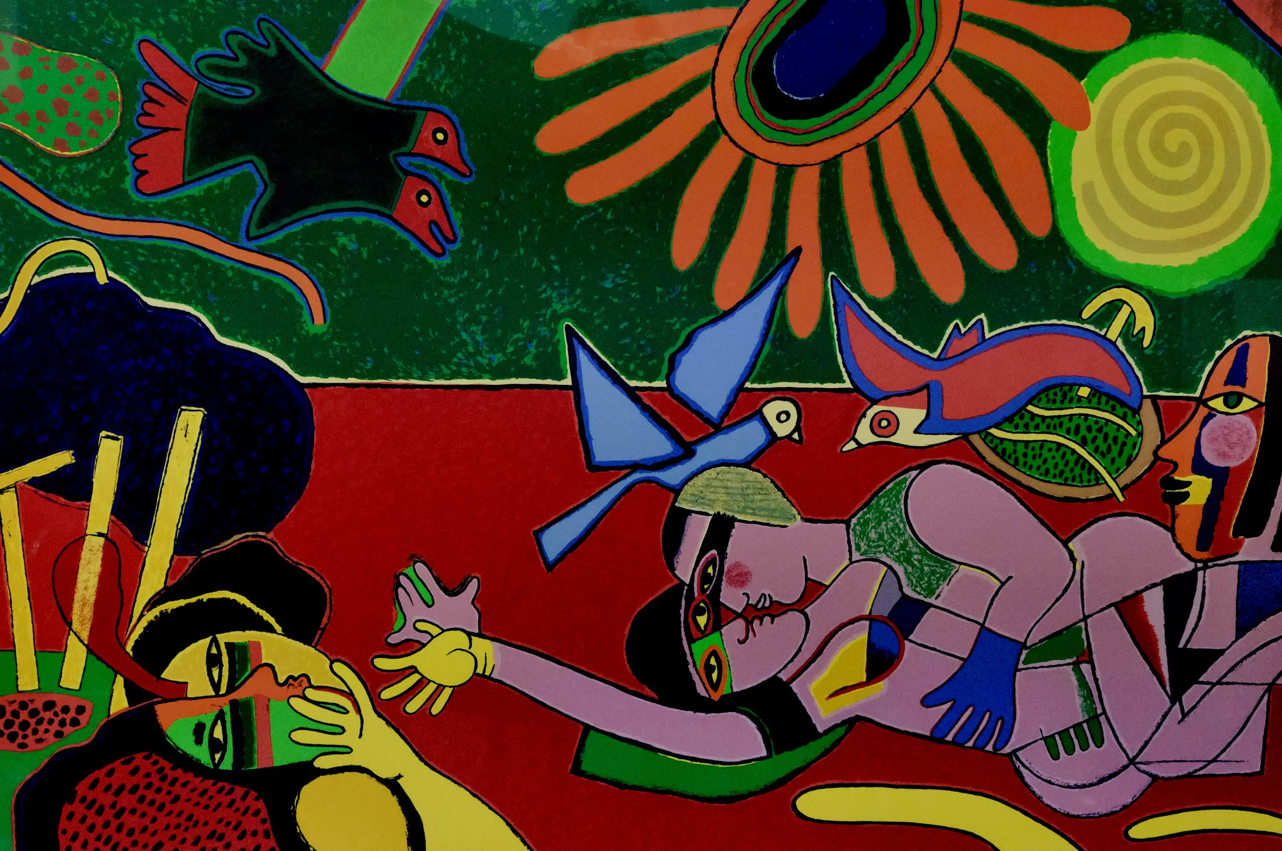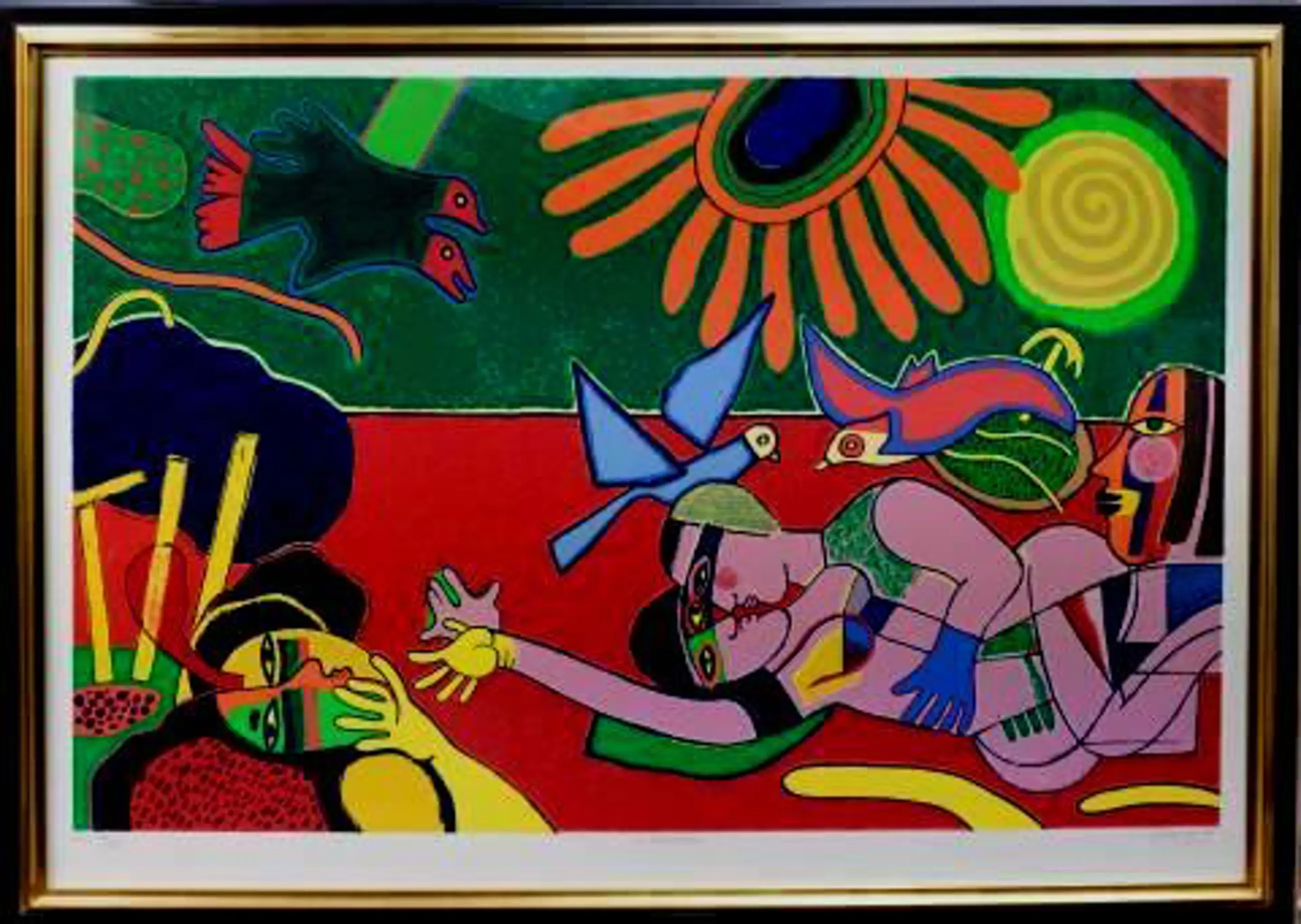 Ingelijste kleurenzeefdruk van Corneille. Titel: Les amoureux. Jaar: 1993. Oplage: EA, 24/25.