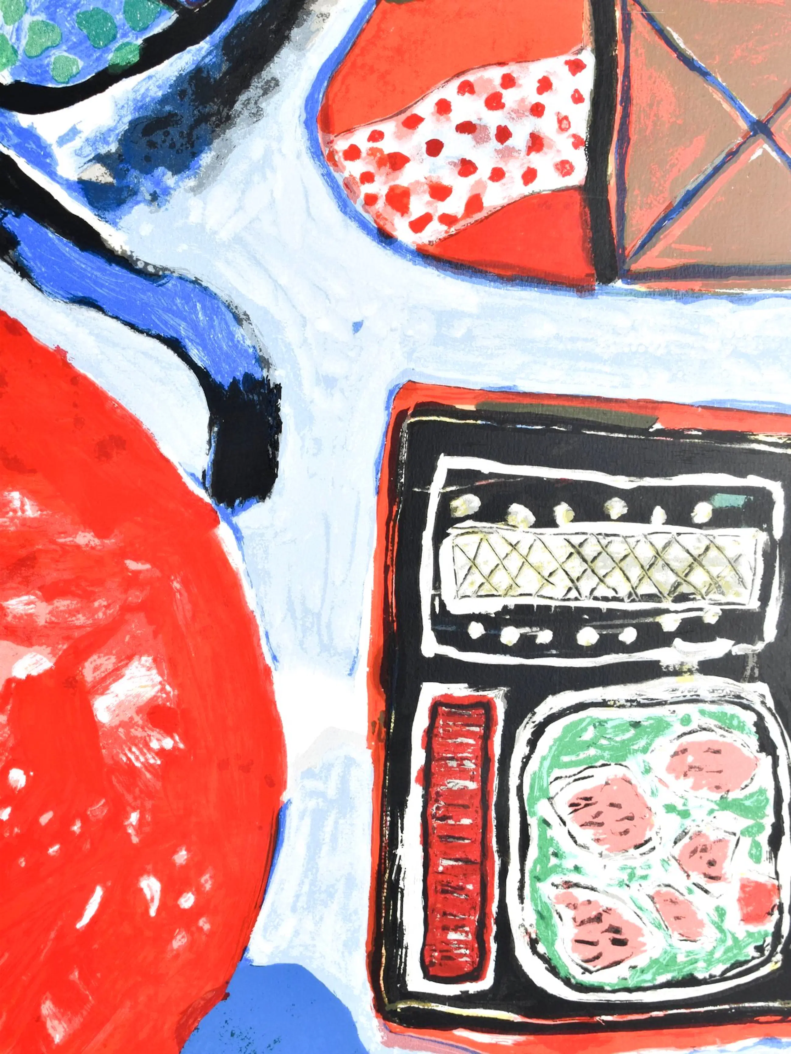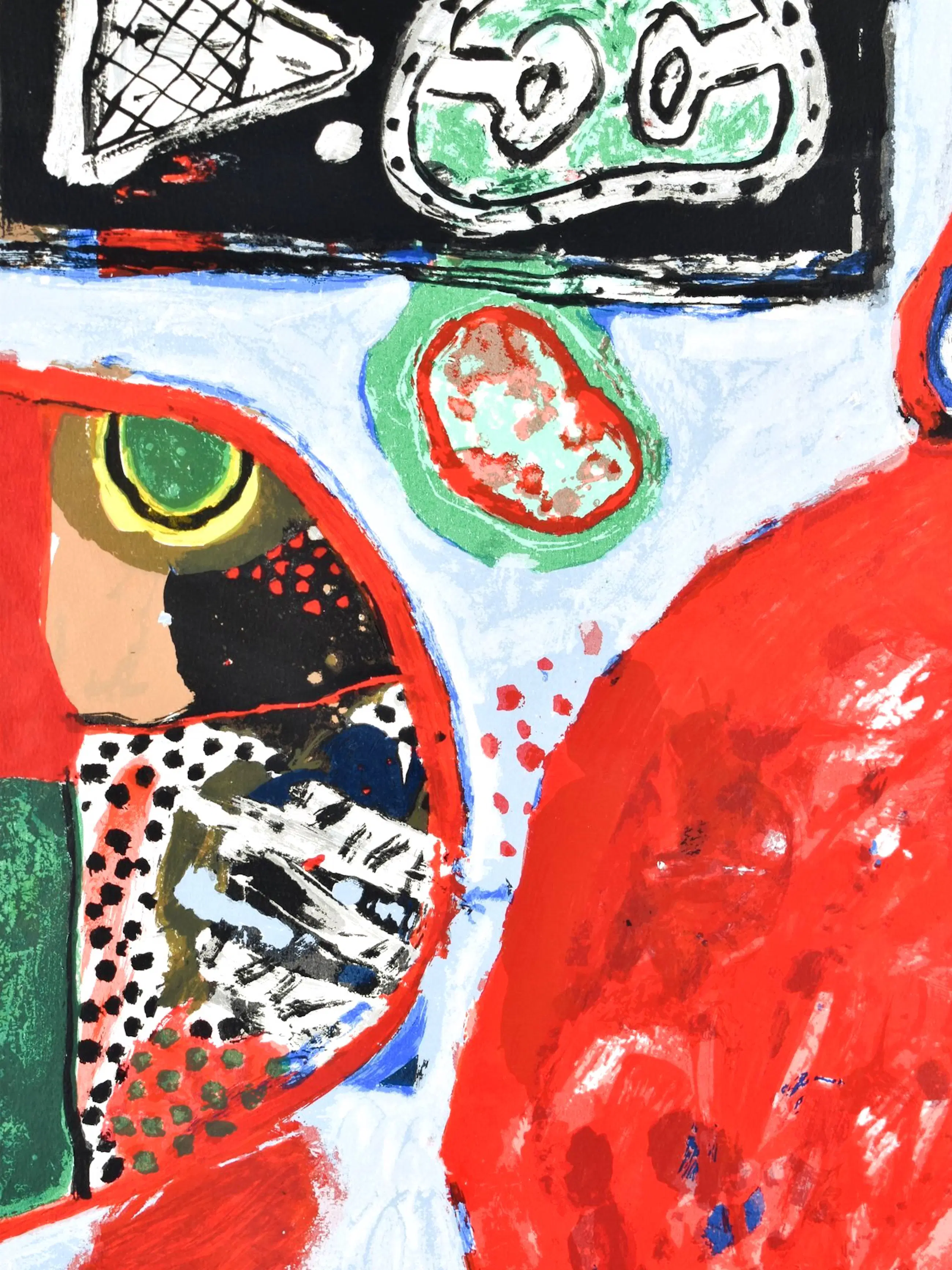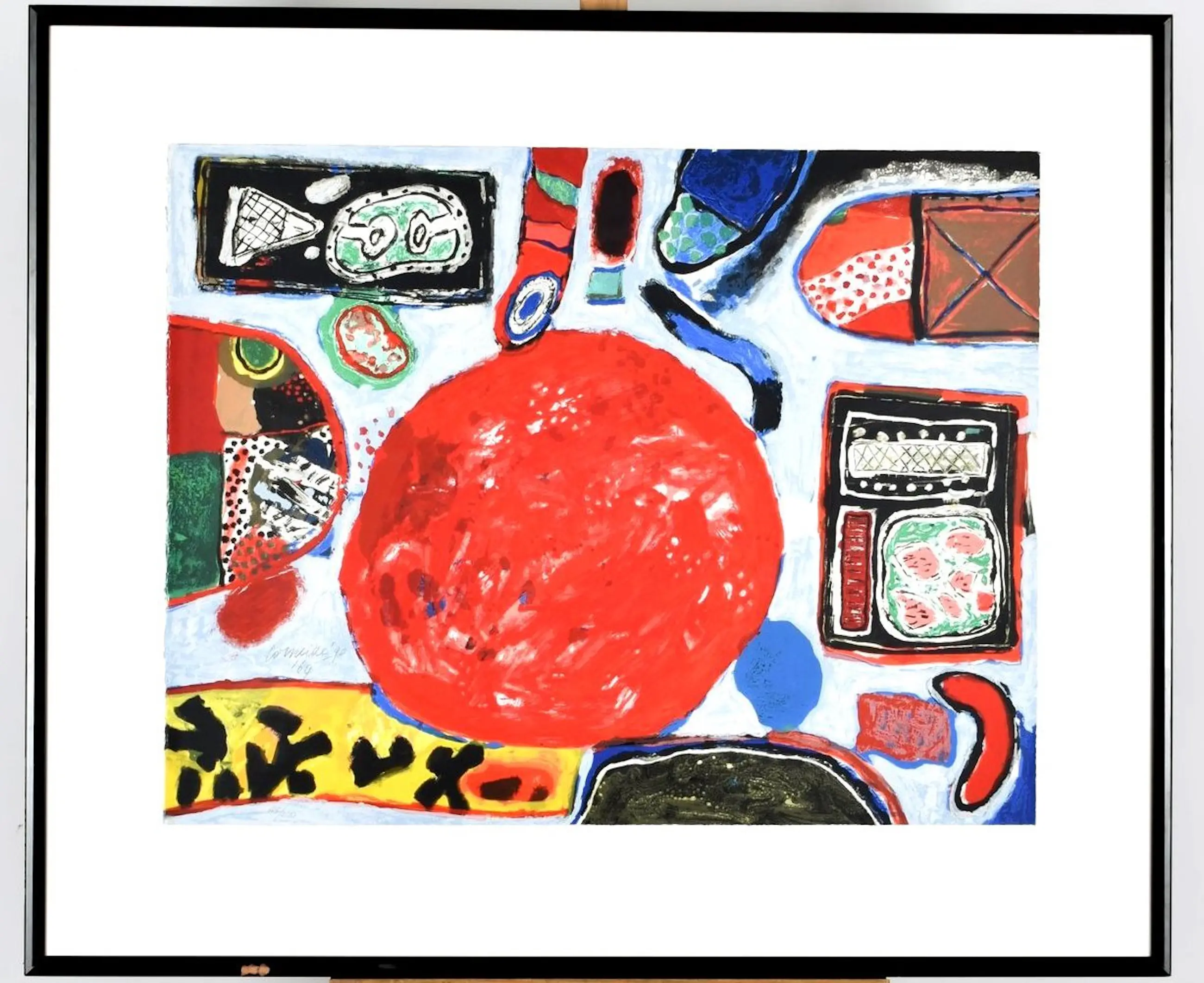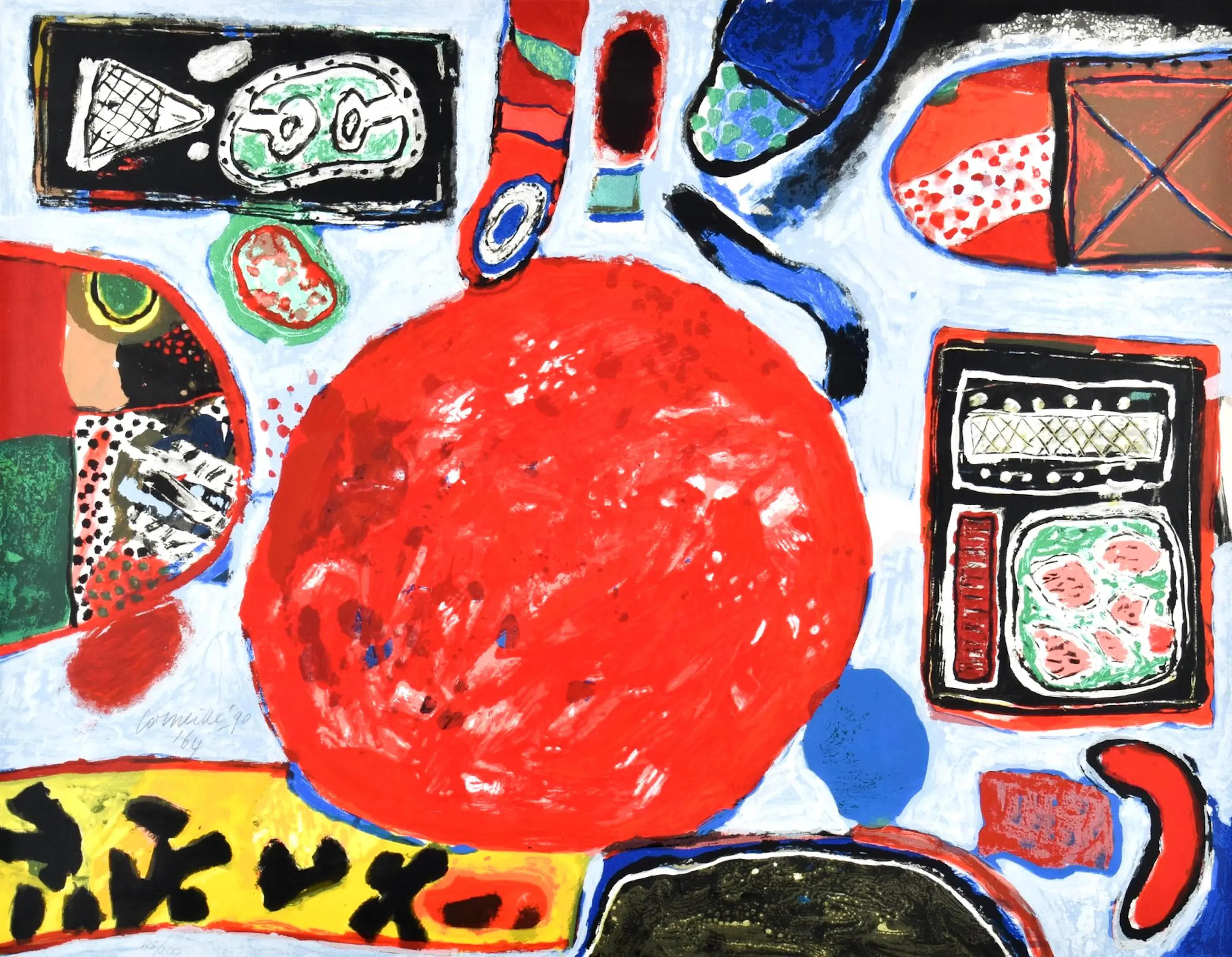 Ingelijste litho van Corneille uit 1990. Nummer: 45/200. De litho is gemaakt naar een schilderij uit 1964. Het werk is aan de linkerzijde, in het blauwe gedeelte, gesigneerd door de kunstenaar.