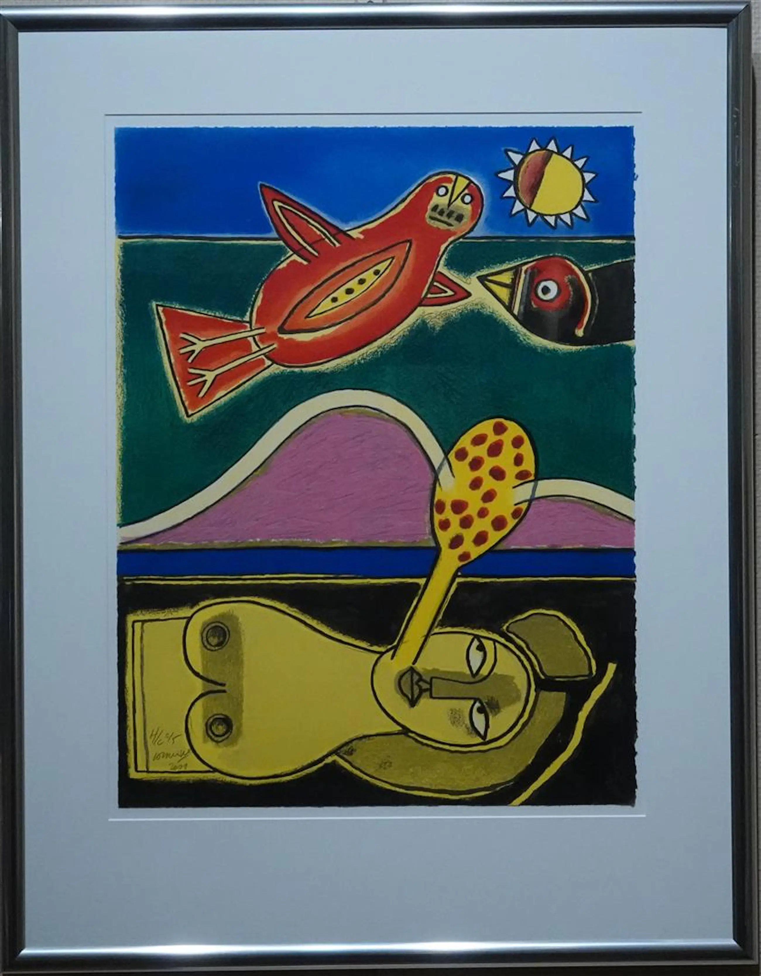 Ingelijste litho van Corneille uit 2001. Titel: L 'oiseau rouge et femme nude. Jaar: 2001. Nummer: HC 2/5. Afmetingen voorstelling: H65,5 x b 50 cm. Afmetingen incl.lijst: H94 x b74 cm. Het werk is linksonder gesigneerd door de kunstenaar. De authenticiteit van het aangeboden werk wordt volledig gegarandeerd. Een certificaat van echtheid kan, op aanvraag, worden gemaild.