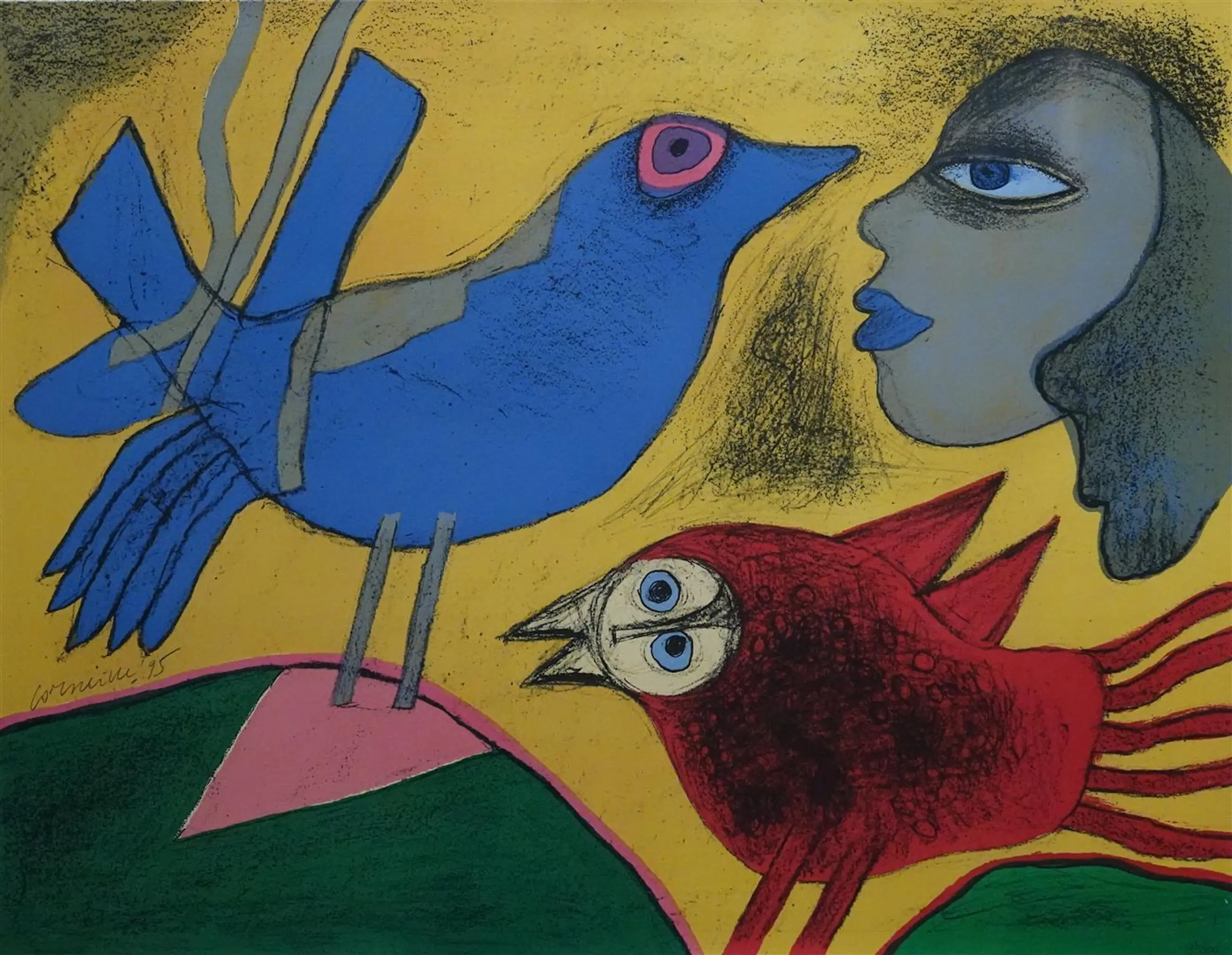 Mooi ingelijste litho van Corneille uit 1995. Titel: Oiseau bleu et rouge avec femme. Jaar: 1995. Nummer: 196/200. Afmetingen voorstelling: H52 x b 67 cm. Afmetingen incl.lijst: H67 x b81 cm. De authenticiteit van het aangeboden werk wordt volledig gegarandeerd. Een certificaat van echtheid kan, op aanvraag, worden gemaild.
