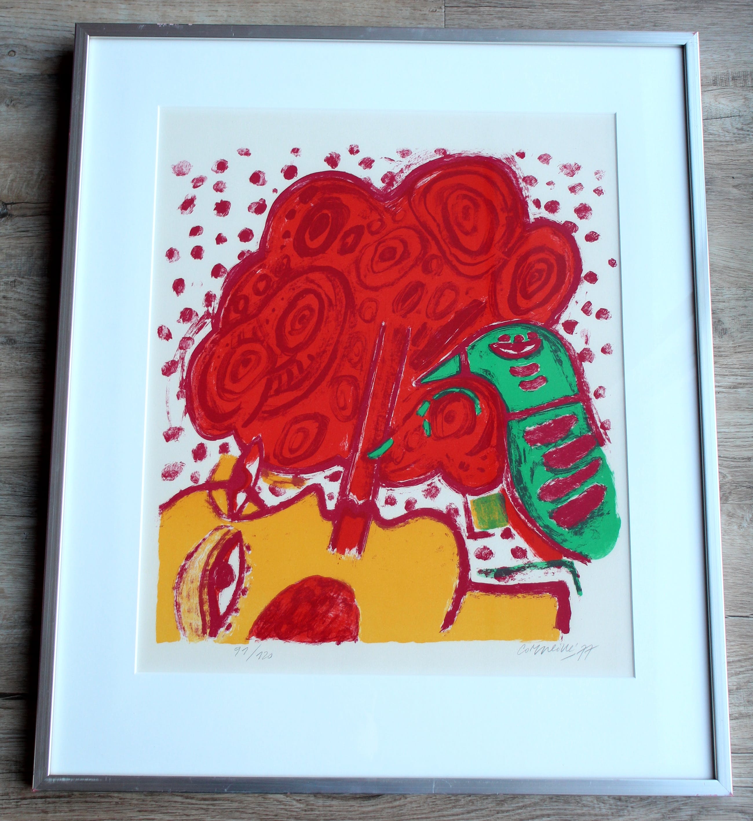 Ingelijste zeefdruk van Corneille uit 1977. Titel: Profil a l 'oiseau. De authenticiteit van het aangeboden werk wordt volledig gegarandeerd. Een certificaat van echtheid kan, op aanvraag worden gemaild.