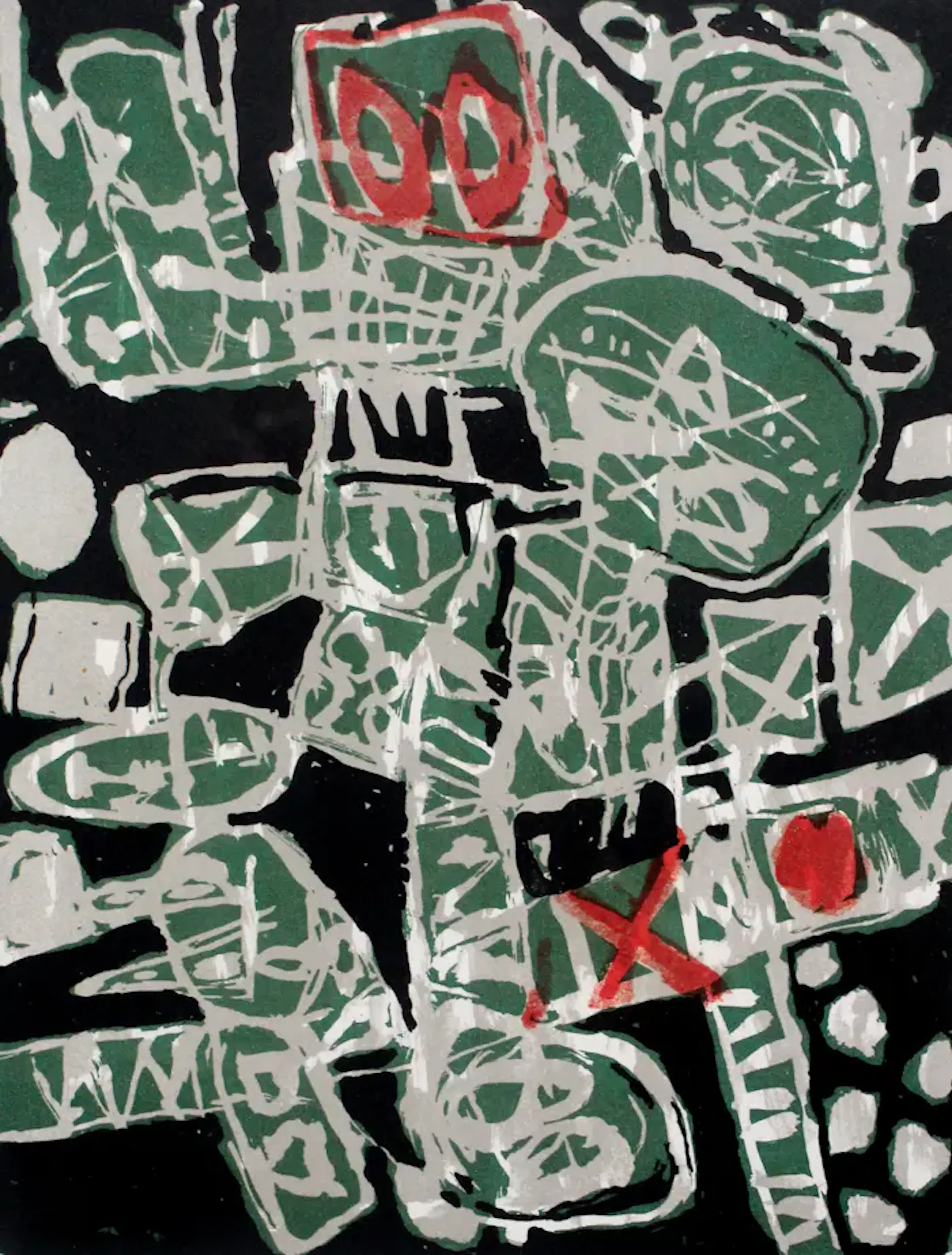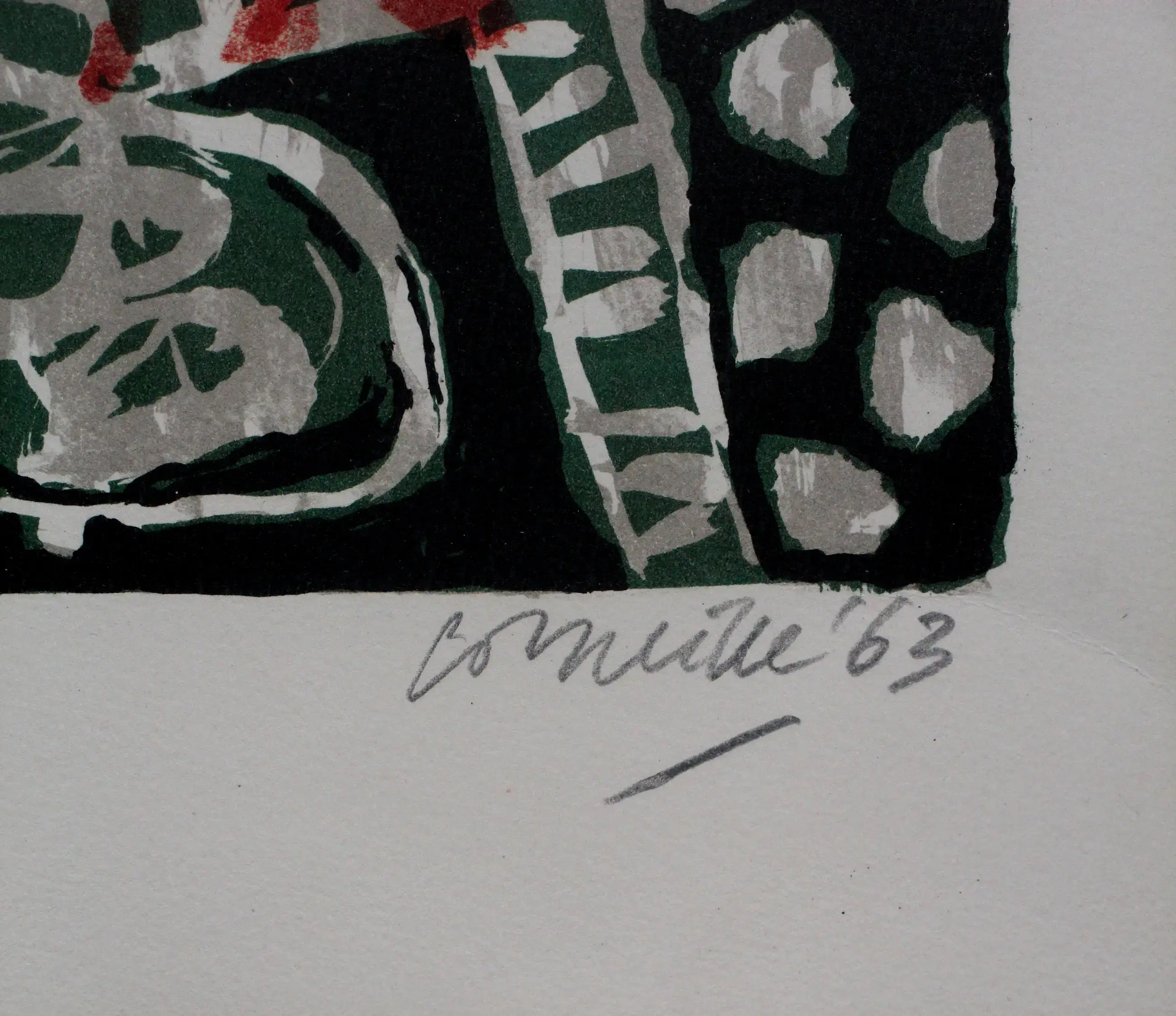 Prachtige litho van Corneille uit 1963. Het werk is ingelijst. Afmetingen voorstelling: H27,5 x b 21,5 cm. Nummer: E.A. Het werk is rechtsonder gesigneerd en gedateerd door de kunstenaar.