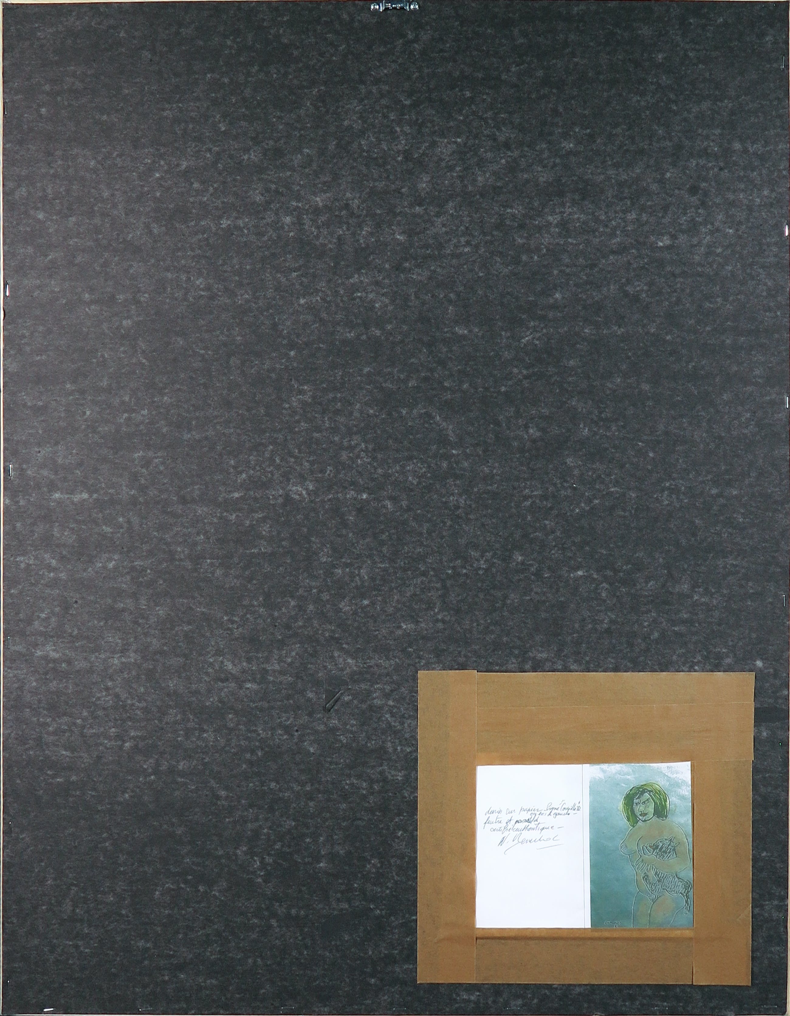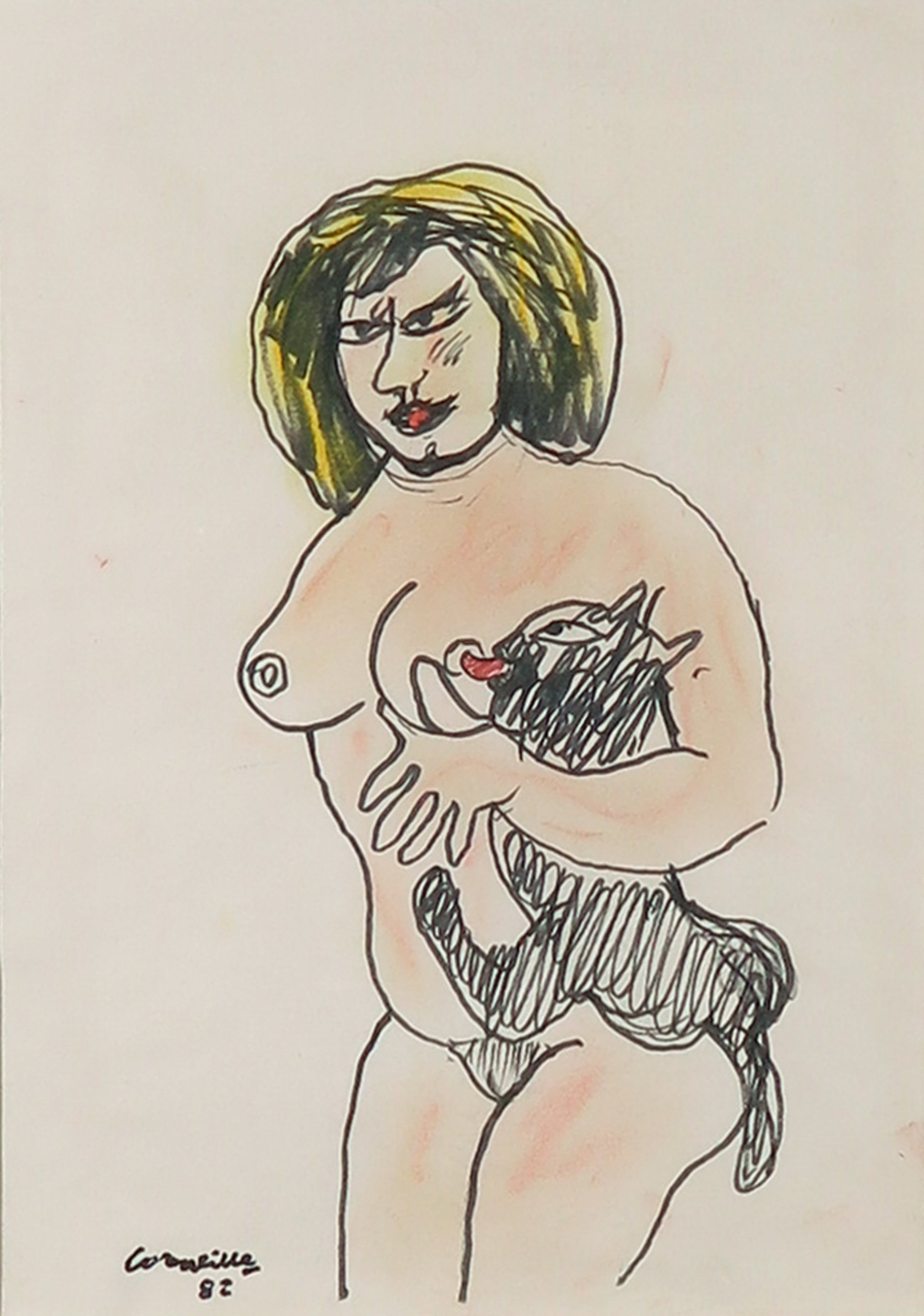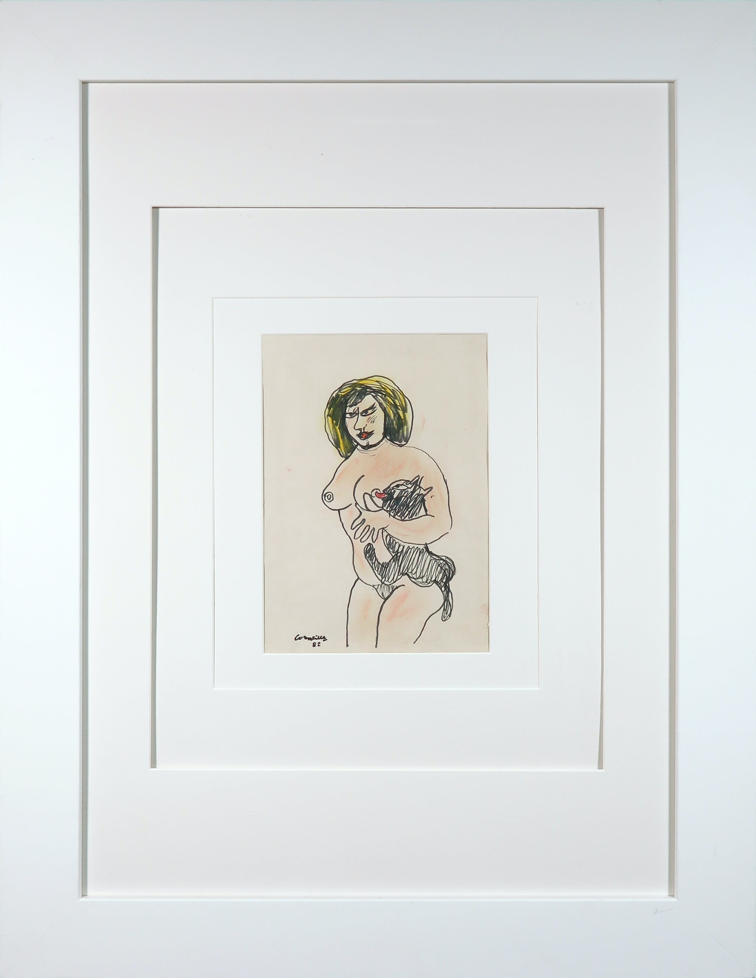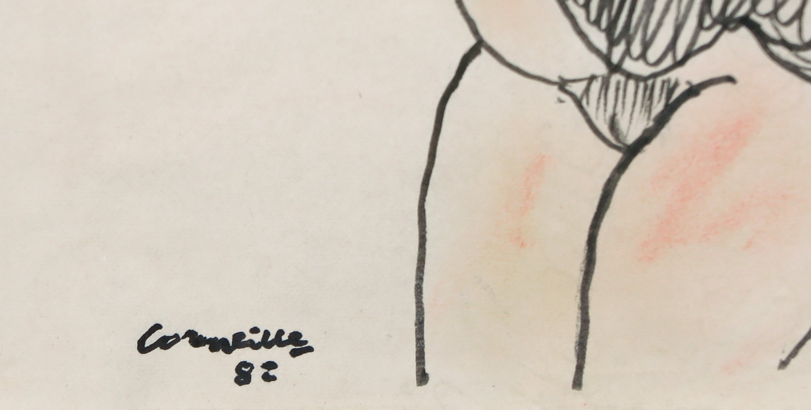 Tekening (viltstift en pastel) op zeer dun papier door Corneille uit 1982. Aan de achterzijde van de lijst zit een kopie van het fotocertificaat bevestigd.