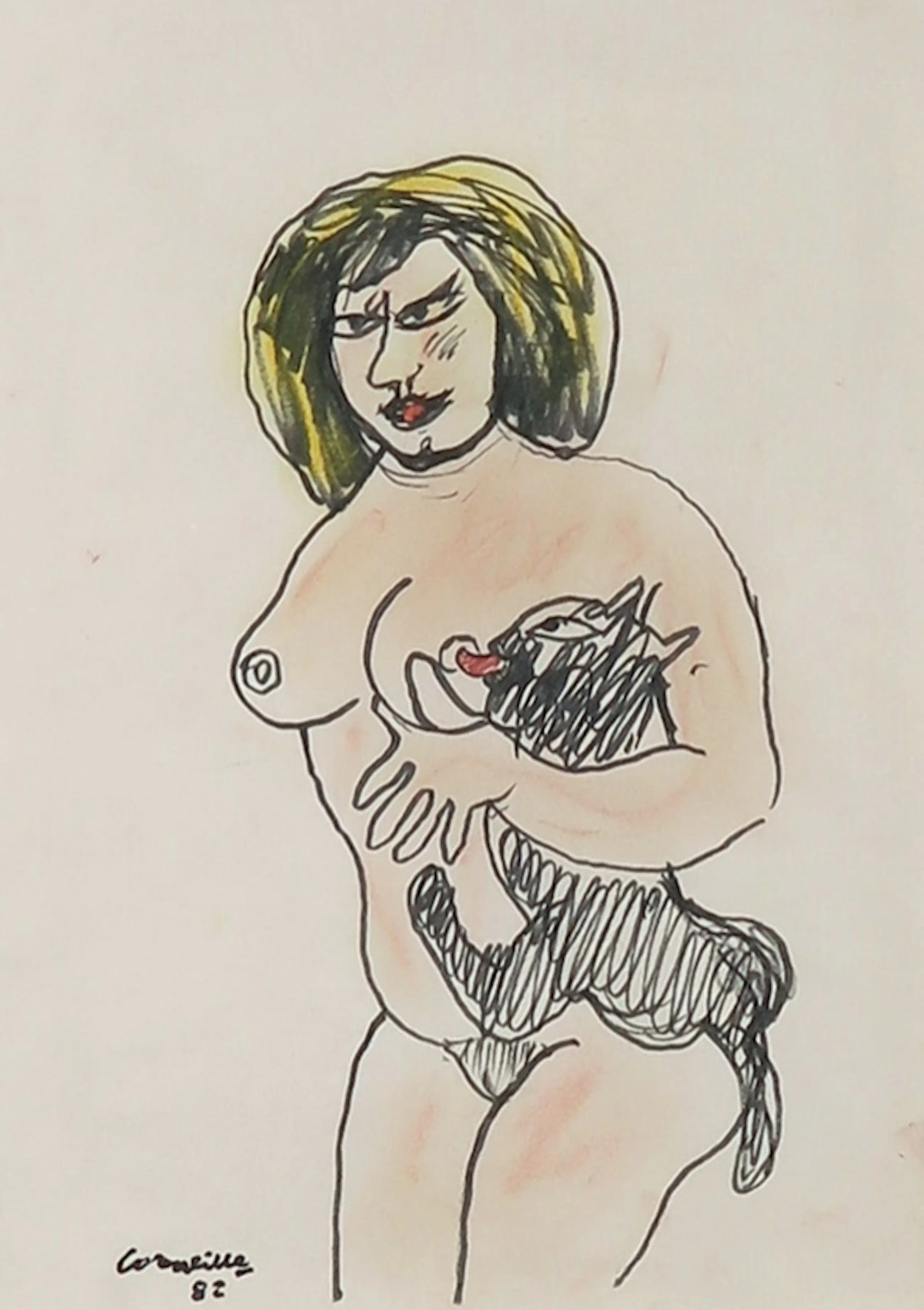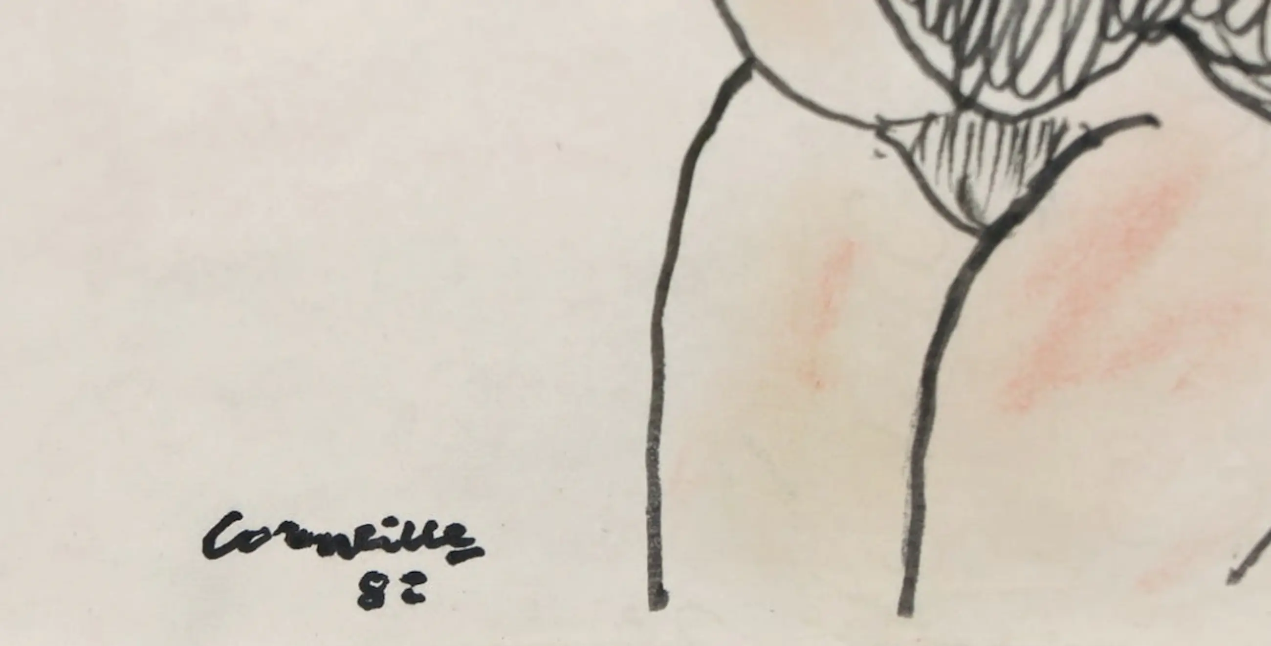 Tekening (viltstift en pastel) op zeer dun papier door Corneille uit 1982. Aan de achterzijde van de lijst zit een kopie van het fotocertificaat bevestigd.