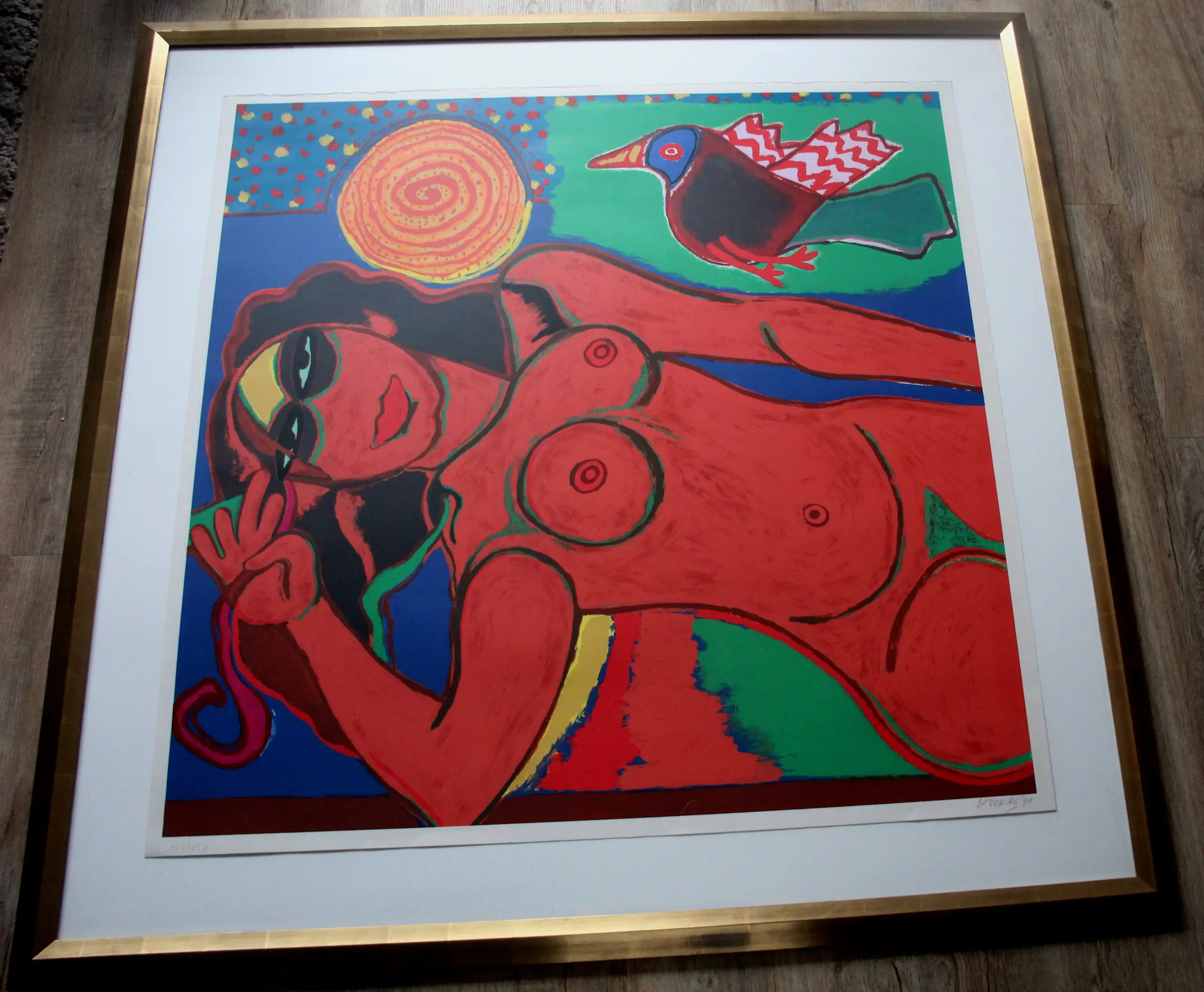 Ingelijste zeefdruk van Corneille. Jaar: 1994. Oplage: 103/150. Afmetingen incl lijst: H151 x b150cm. Afmetingen voorstelling: H115 x b115cm. Het werk is rechts onderaan, met potlood, gesigneerd door de kunstenaar. De authenticiteit van het aangeboden werk wordt volledig gegarandeerd. Een certificaat van echtheid kan, op aanvraag, worden gemaild.