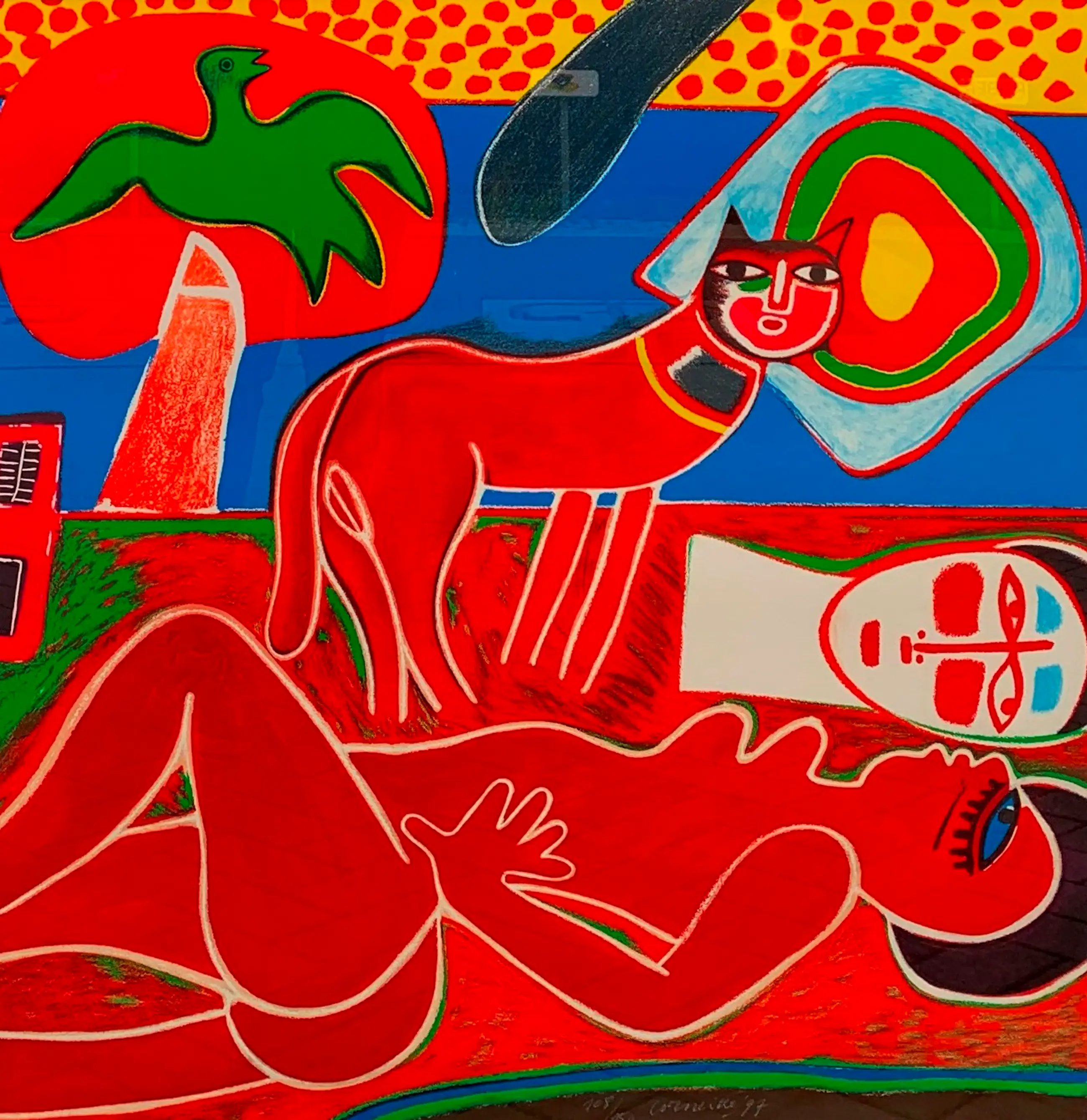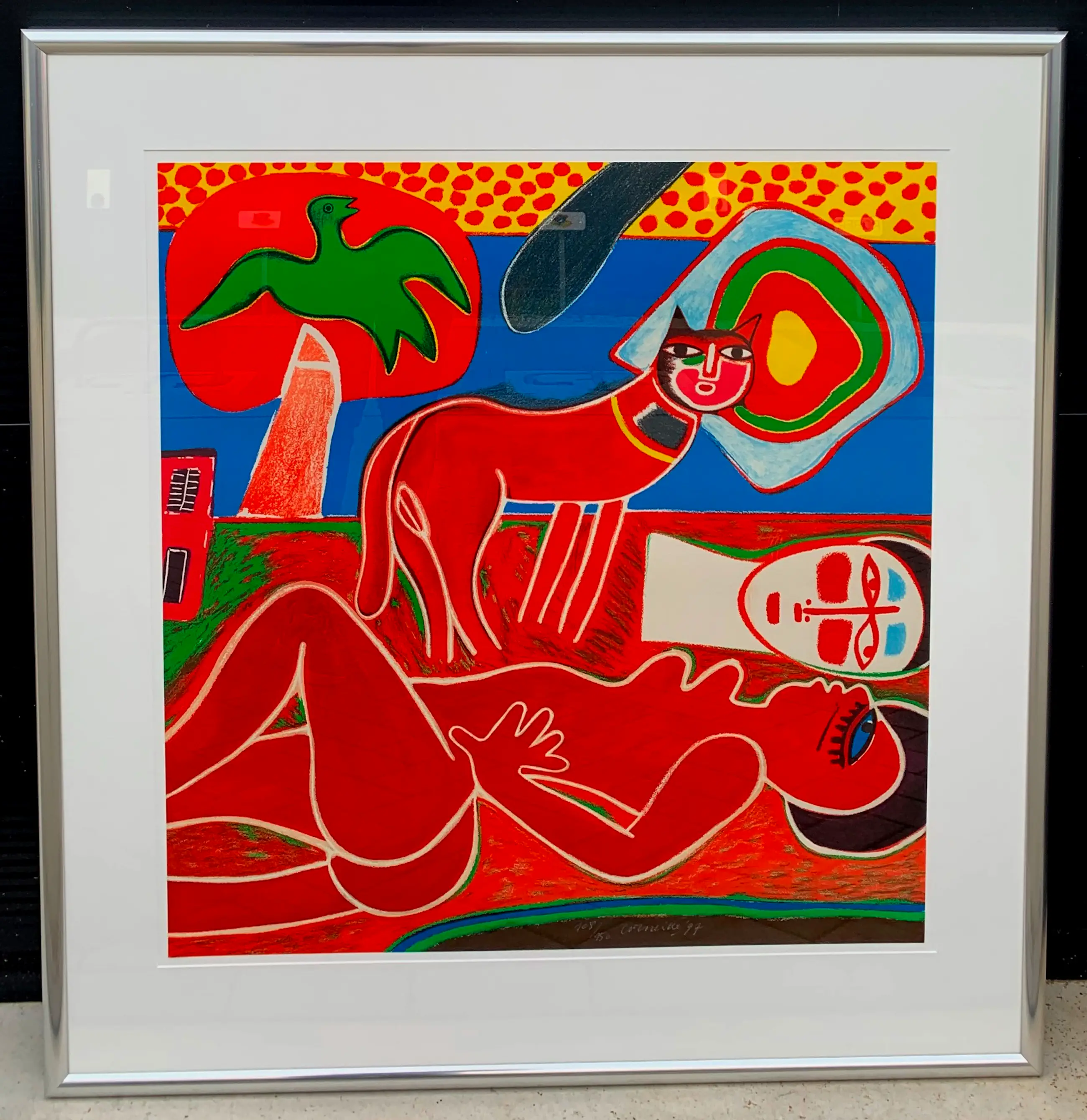 Ingelijste zeefdruk van Corneille. Titel: le chat rouge. Oplage: 108/150. Jaar: 1997. Afmetingen incl lijst: H103 x b109cm. Afmetingen voorstelling: H77 x B81cm.