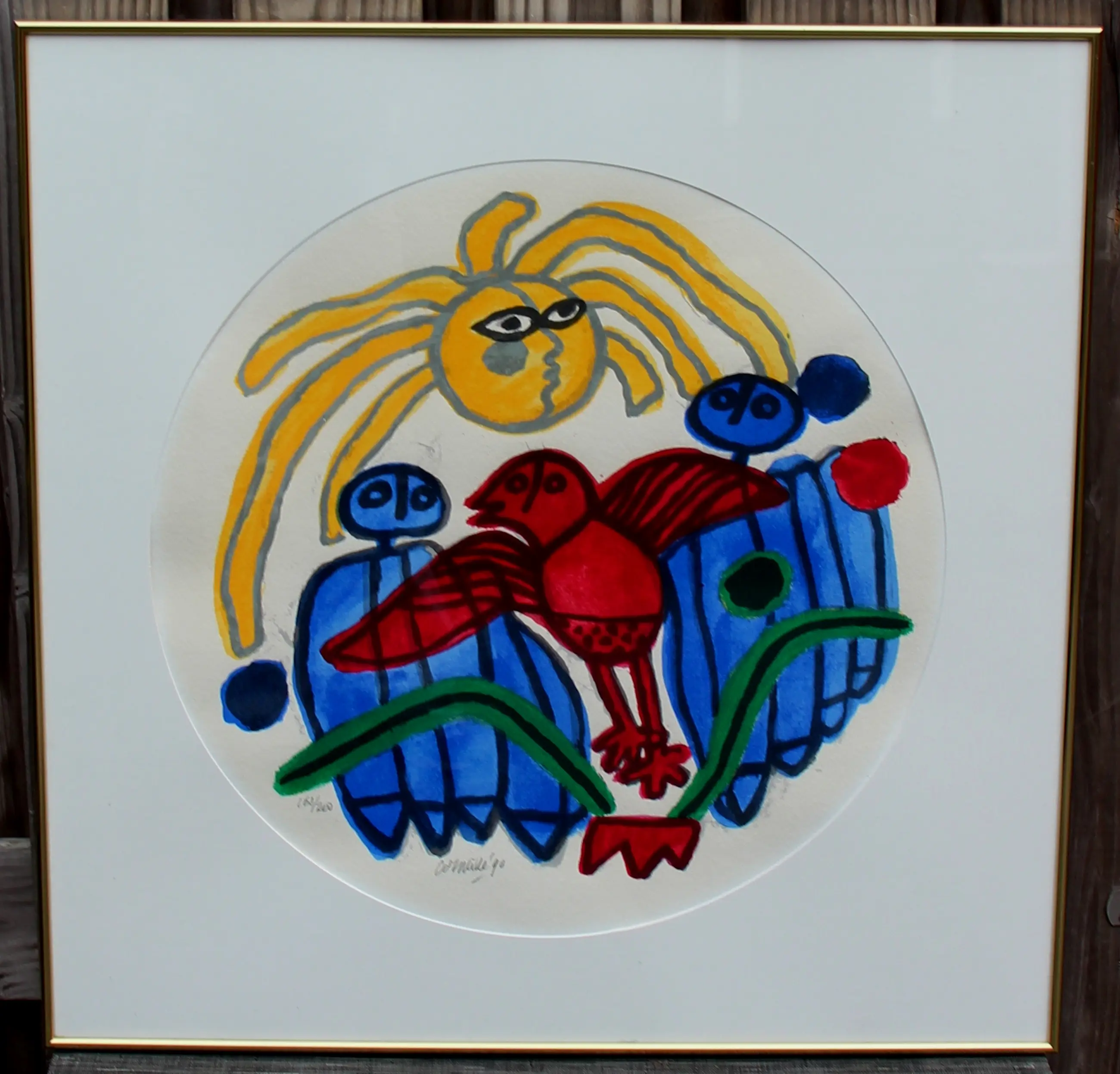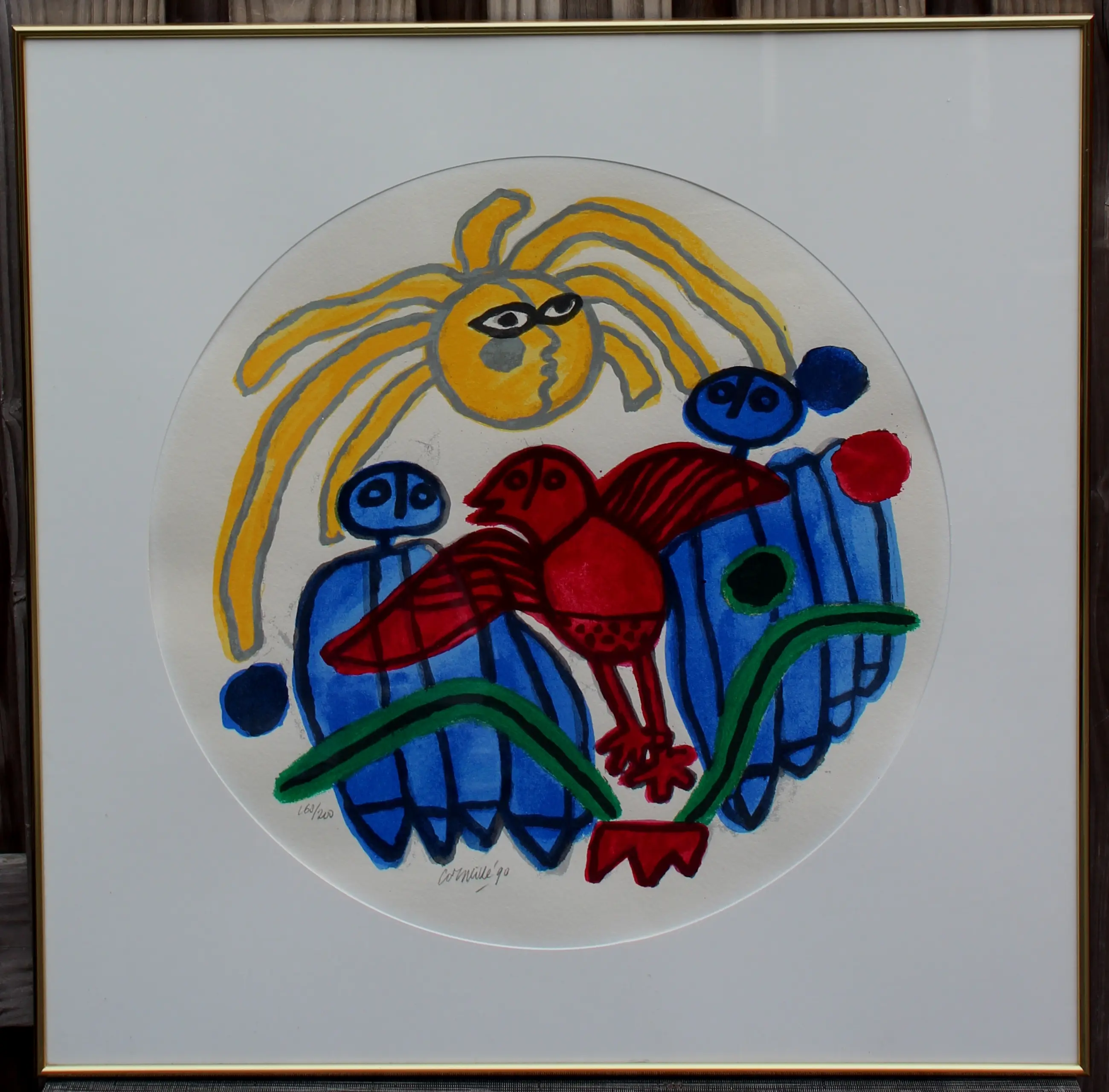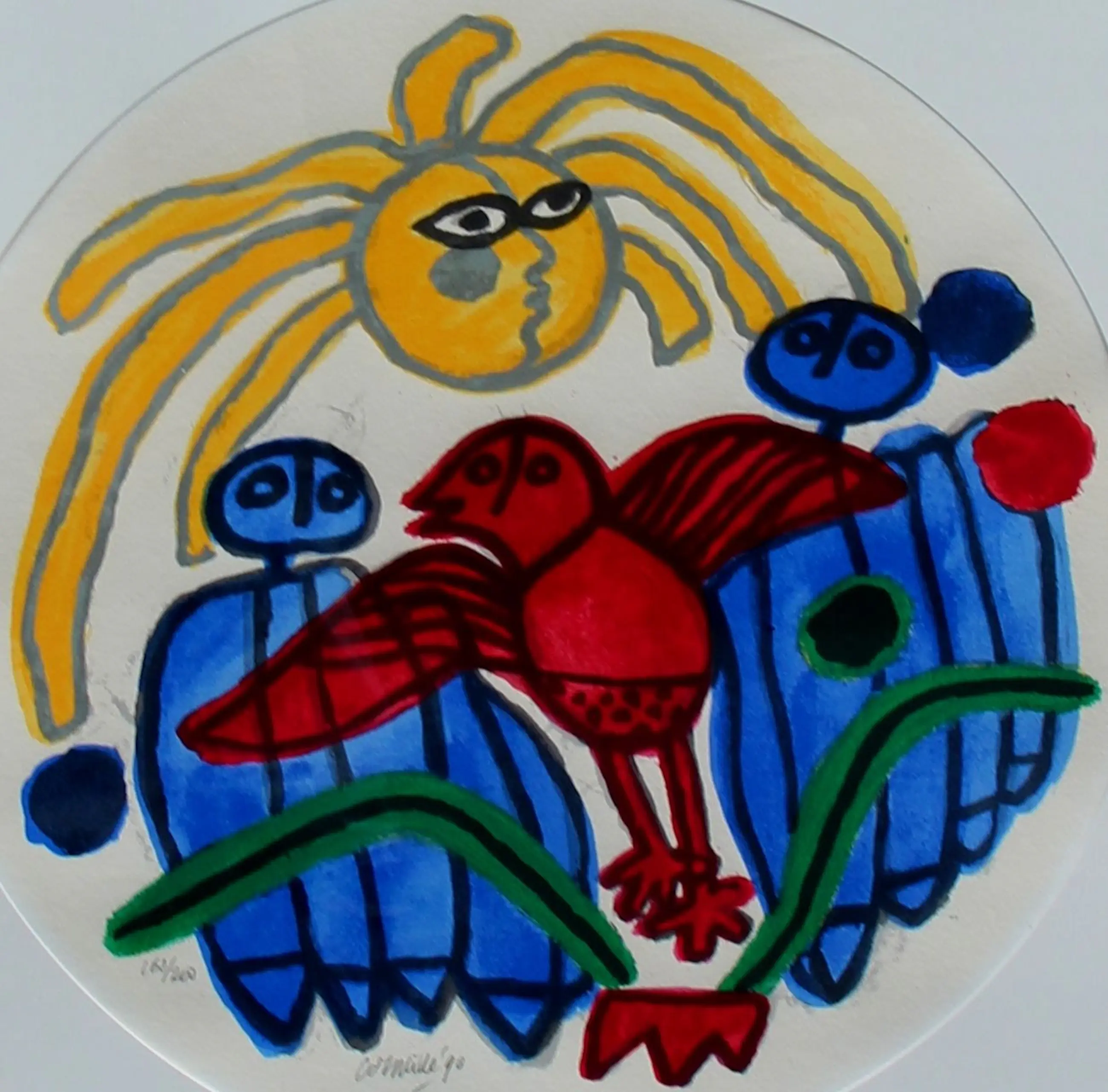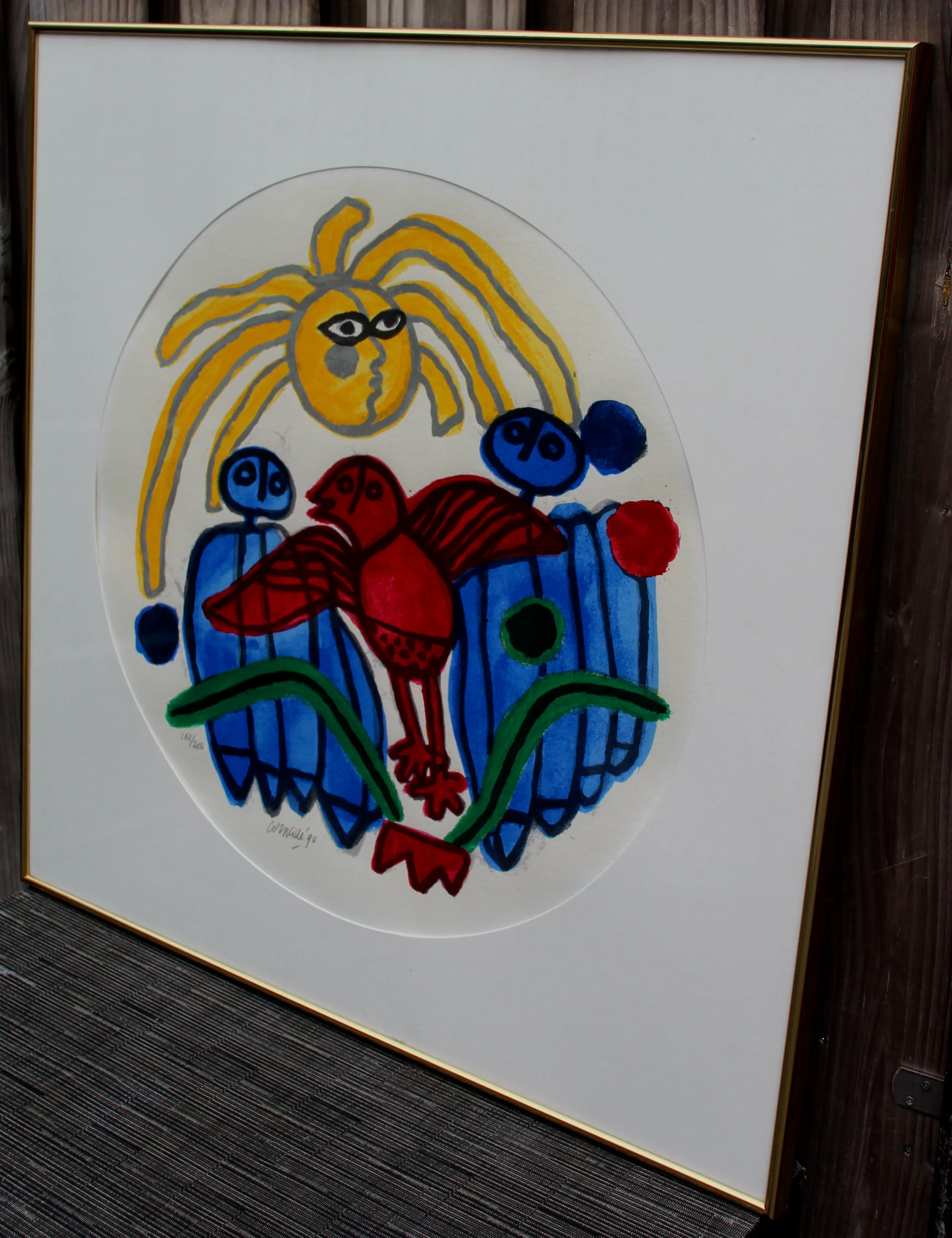 Corneille - Ingelijste zeefdruk: l'Oiseau rouge et soleil- 1990(groot werk!)