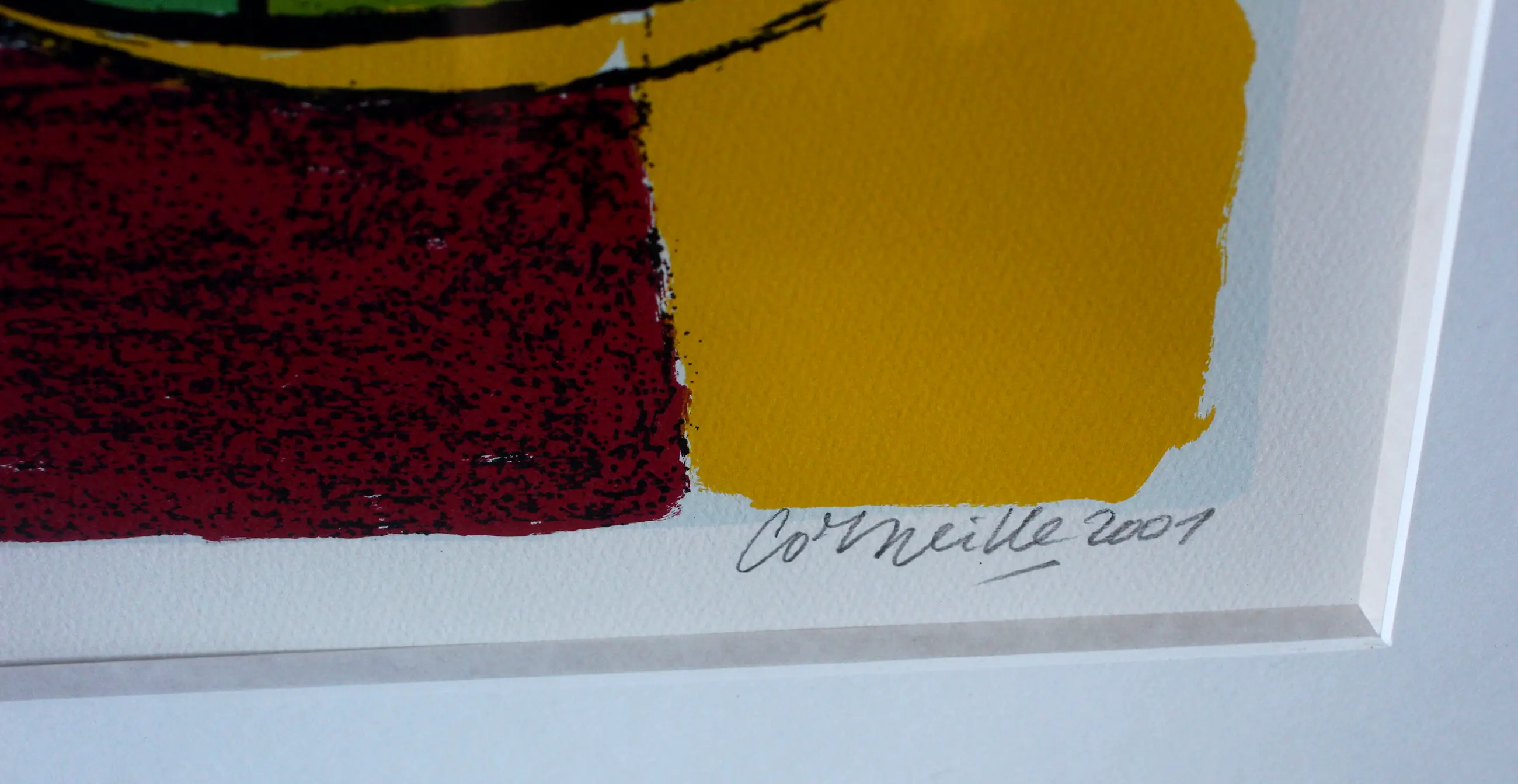 Prachtige zeer grote zeefdruk van Corneille uit 2001. Titel: Sérénité (rust). Dit stuk behoort tot de grootste zeefdrukken die Corneille ooit heeft gemaakt. Het werk is met fraaie dikke drukgangen vervaardigd en uitzonderlijk mooi van kleur en figuratie. Ingelijst met verhoogd passe-partout waardoor er diepte ontstaat. Hierdoor komt het werk nog mooier uit.