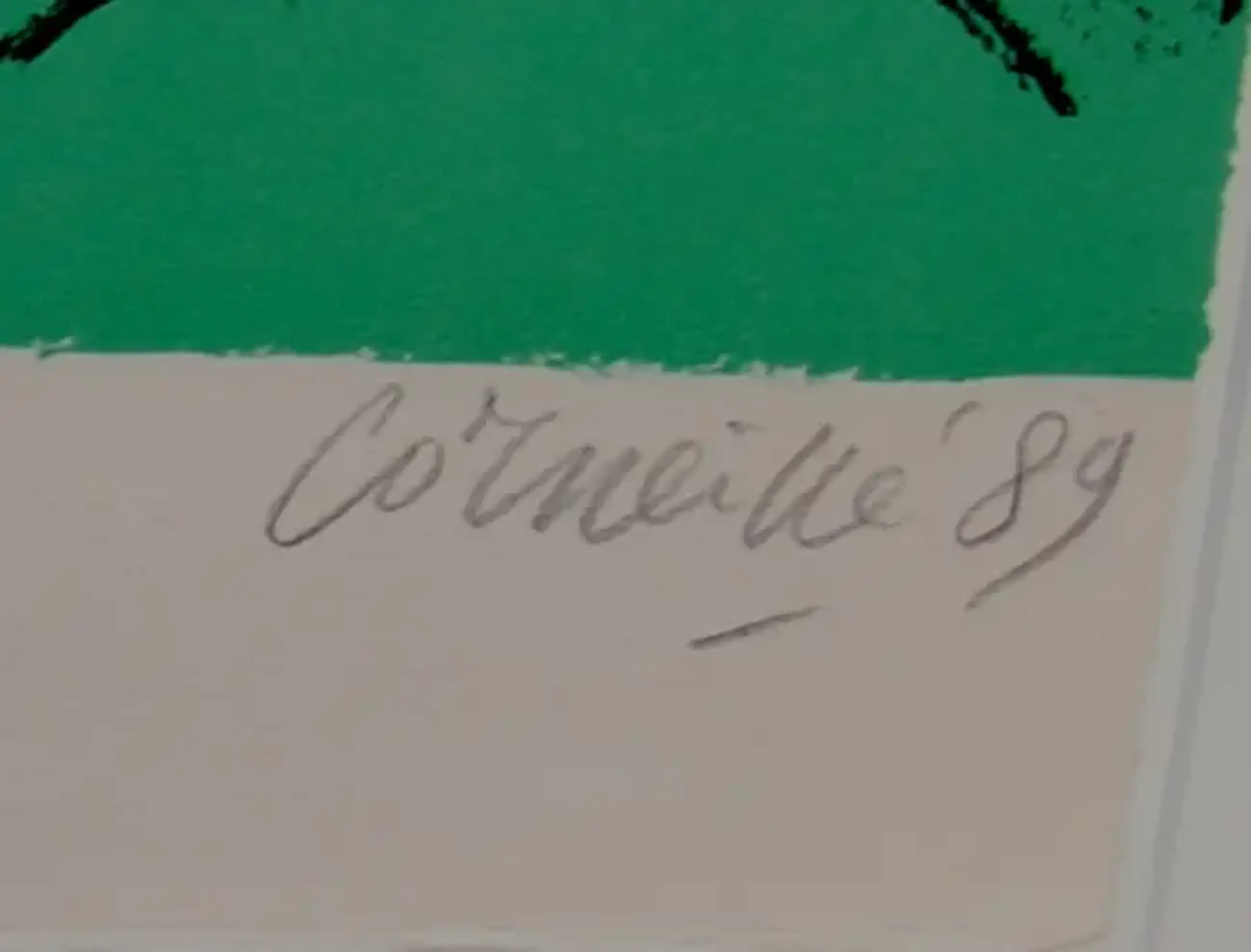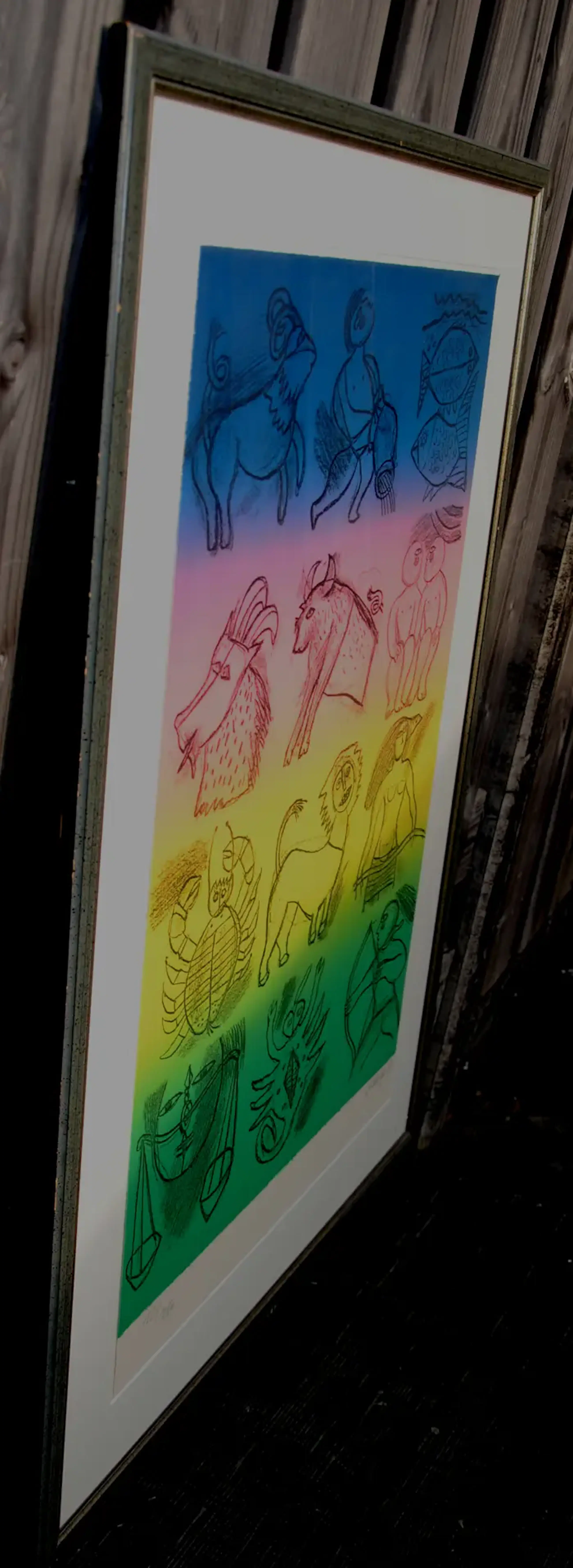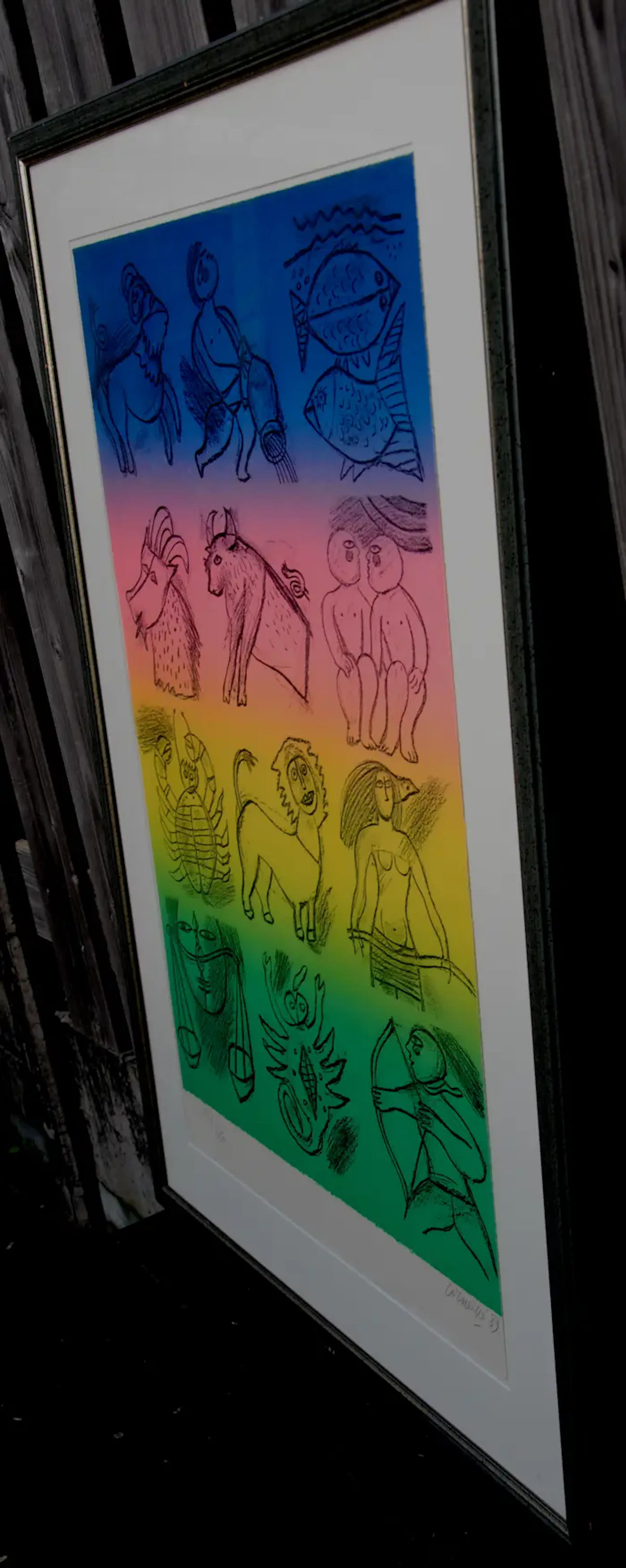 Ingelijste zeefdruk van Corneille uit 1989 Titel: Sterrenbeelden. Oplage: 124/250. Het werk is rechtsonder gesigneerd en gedateerd door de kunstenaar. De authenticiteit van het aangeboden werk wordt volledig gegarandeerd. Een certificaat van echtheid kan, op aanvraag, worden gemaild. Er is spiegeling zichtbaar op de foto's.