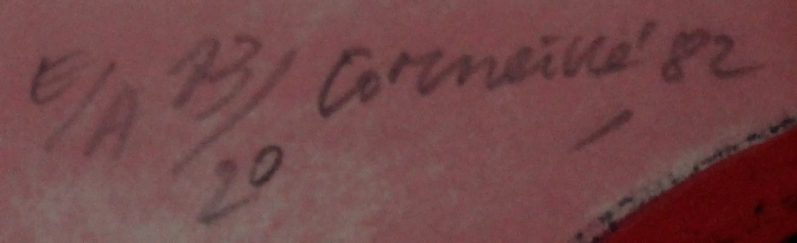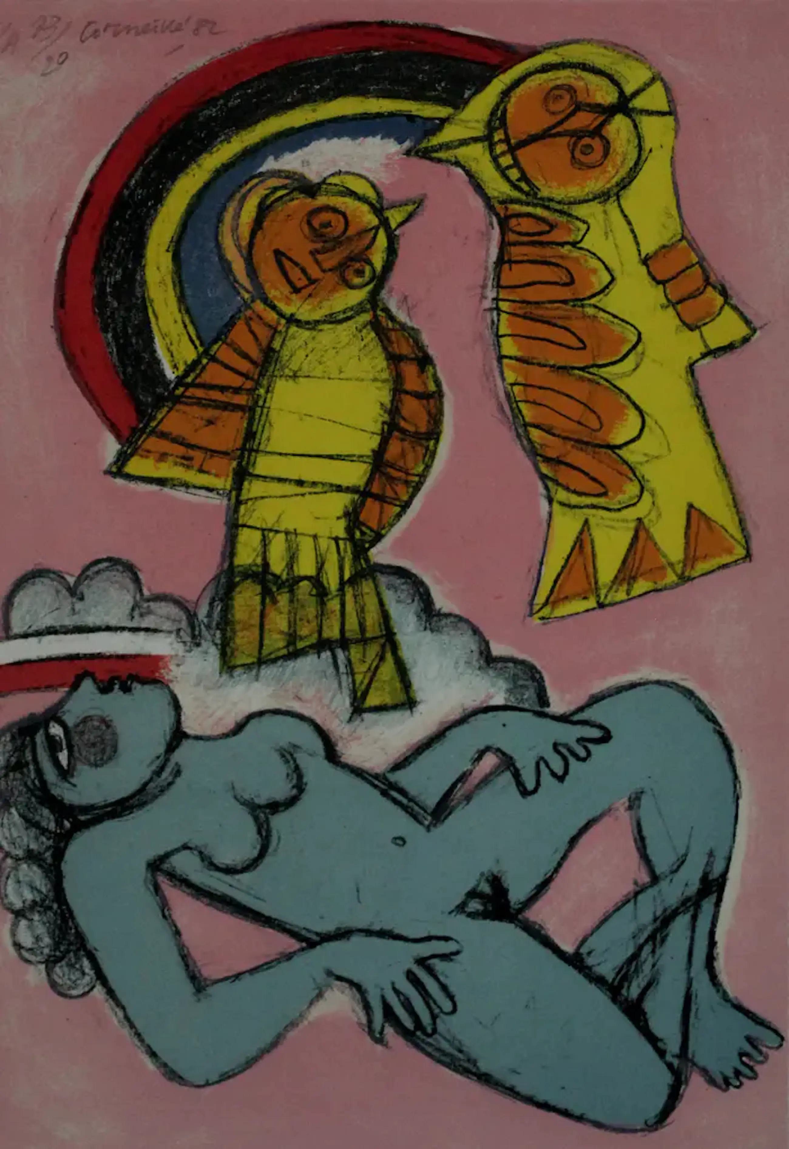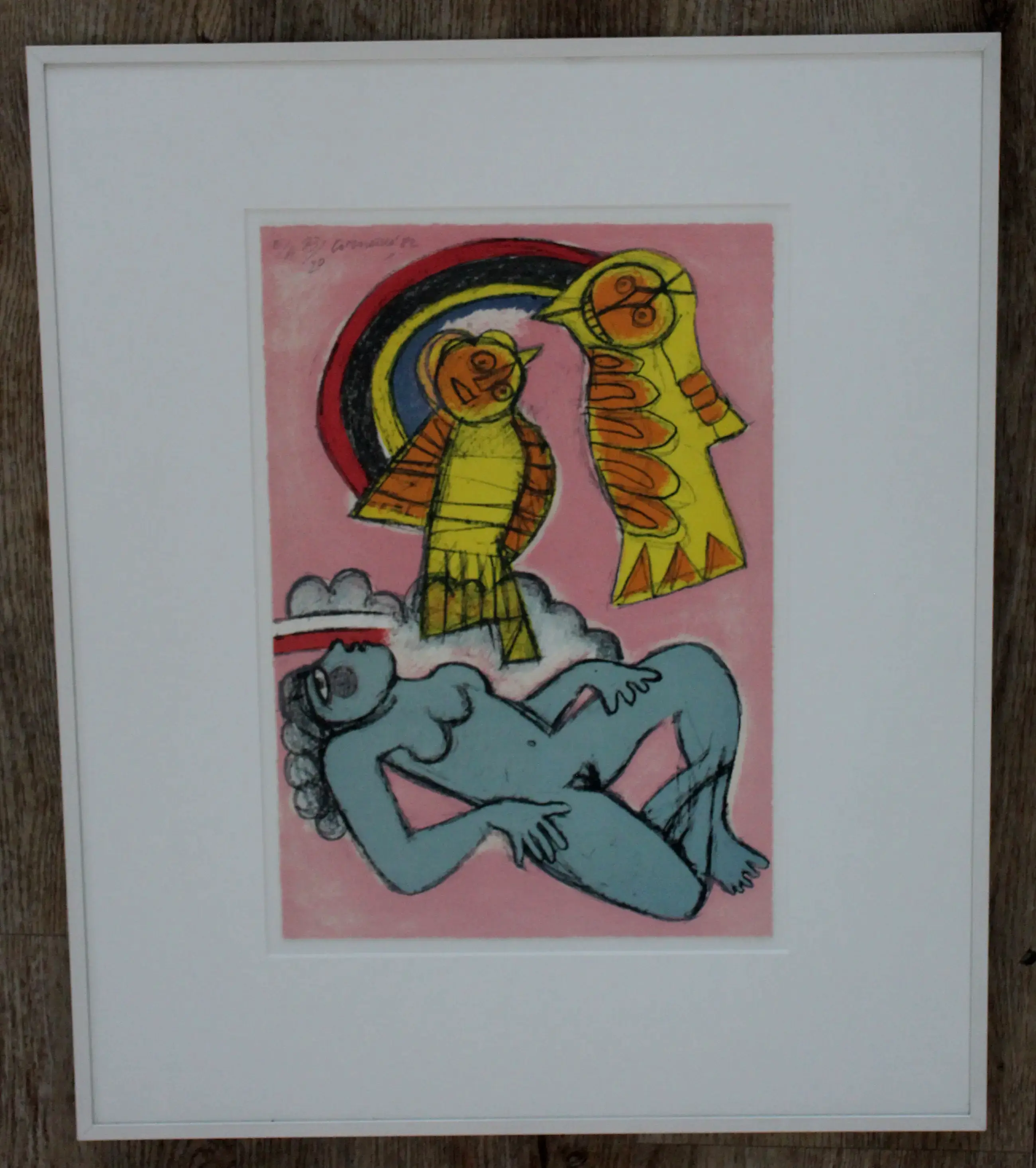Ingelijste litho van Corneille. Titel: Vrouw en vogels. Jaar: 1982. Nummer: E.A, 13/20