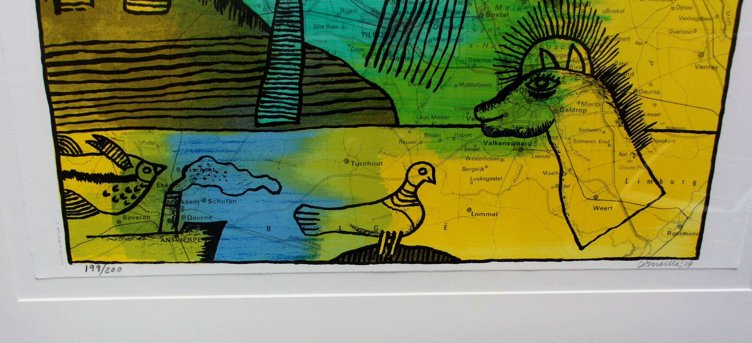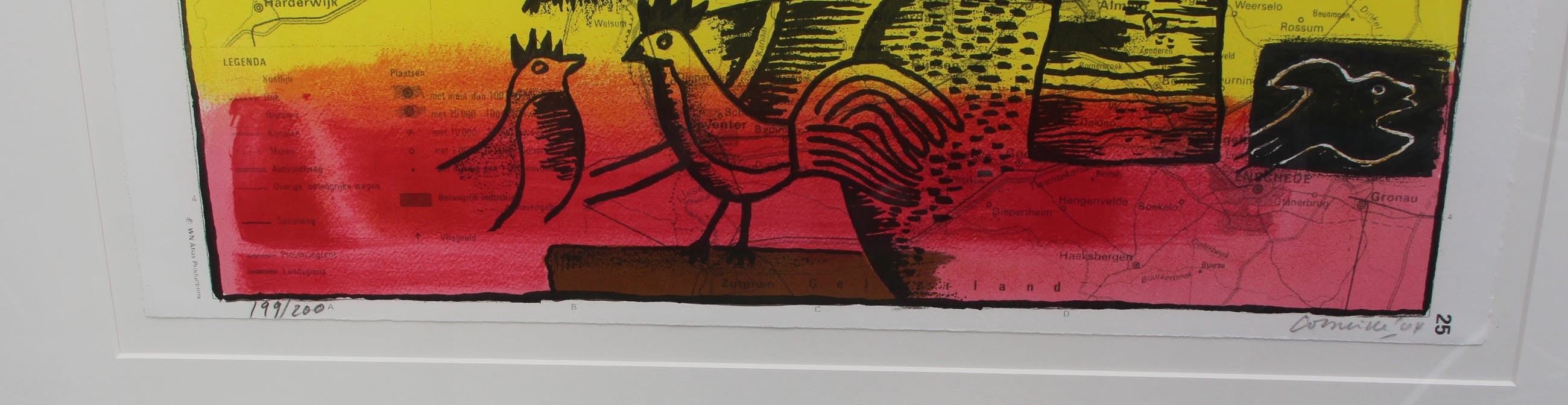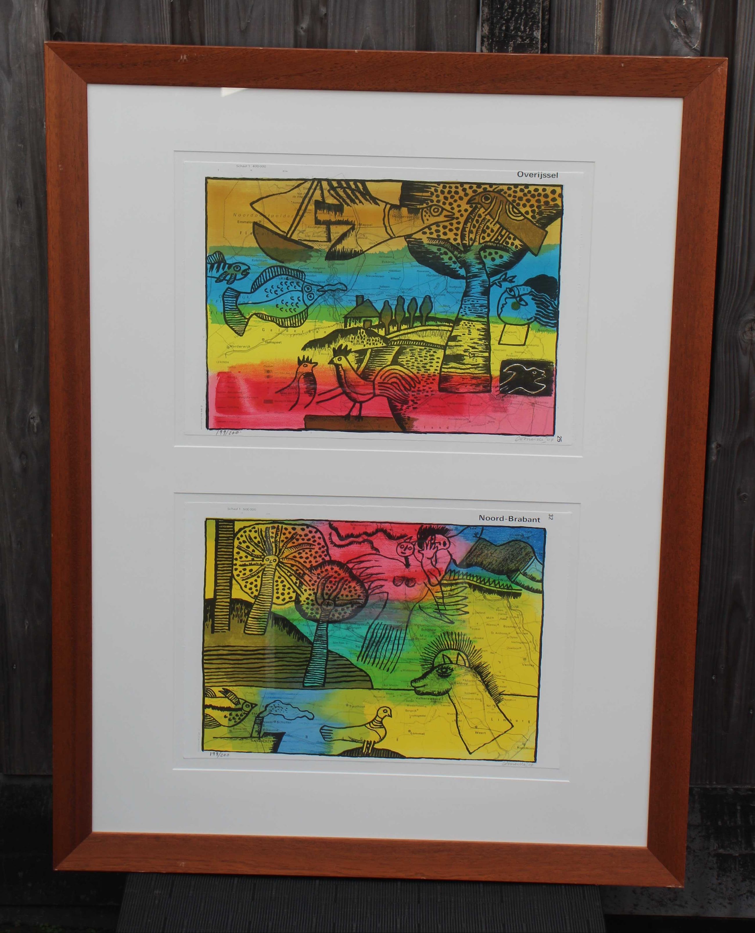 Twee ingelijste zeefdrukken in een lijst, van Corneille. Titel: Noord - Brabant en Overijssel. Jaar: 2009. Deze zeefdrukken komen uit een bijzondere serie van 12 zeefdrukken met al onze 12 provincies.