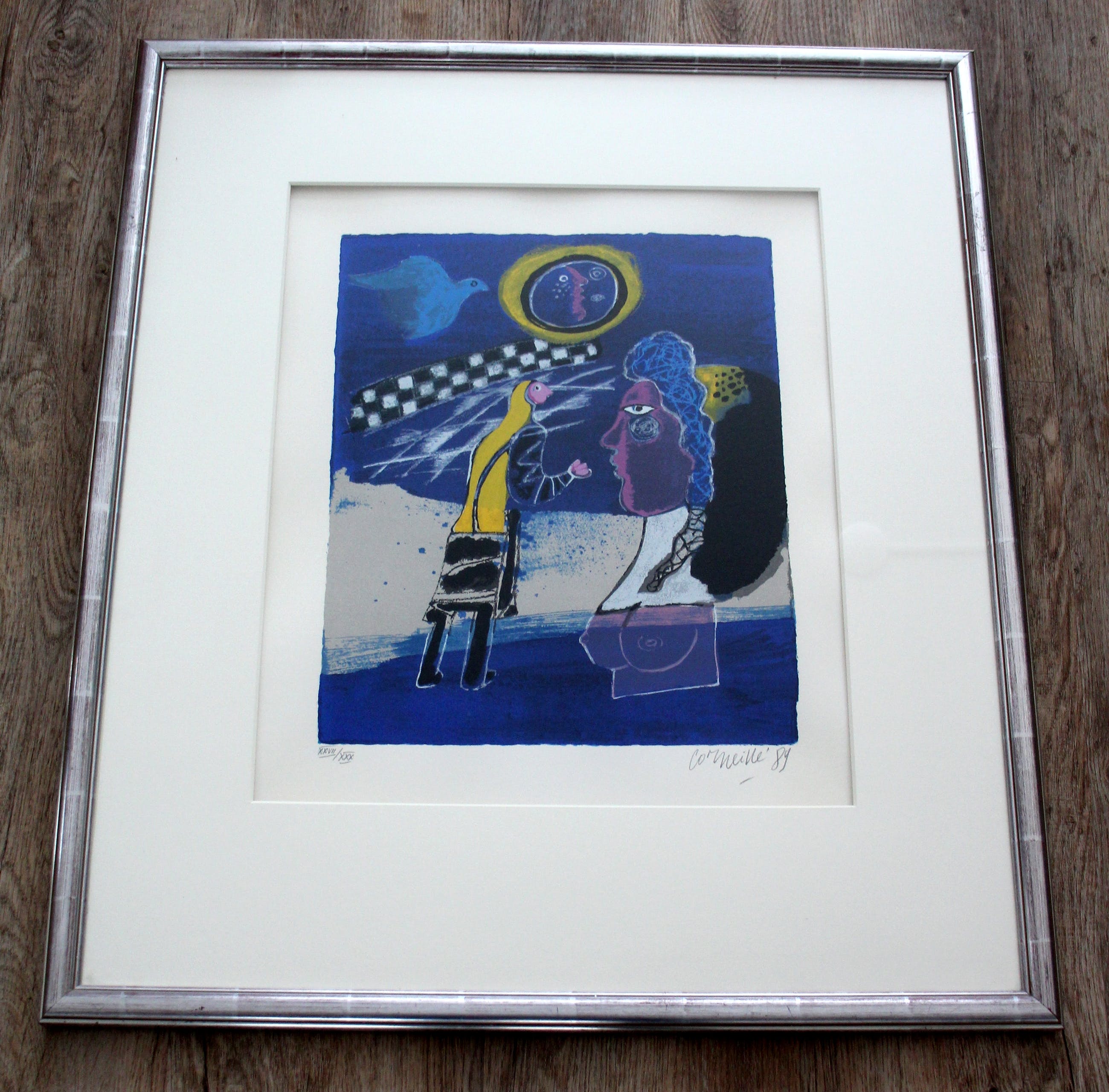 Ingelijste litho van Corneille. Titel: Six reives peints. Jaar: 1989. Nummer: XXVII/XXX Afmetingen incl lijst: H85 x b73cm. Afmetingen voorstelling: H44 x b36,5cm. Het werk is rechtsonder gesigneerd door de kunstenaar. De authenticiteit van dit werk wordt volledig gegarandeerd. Een certificaat van echtheid kan, op aanvraag, worden gemaild.