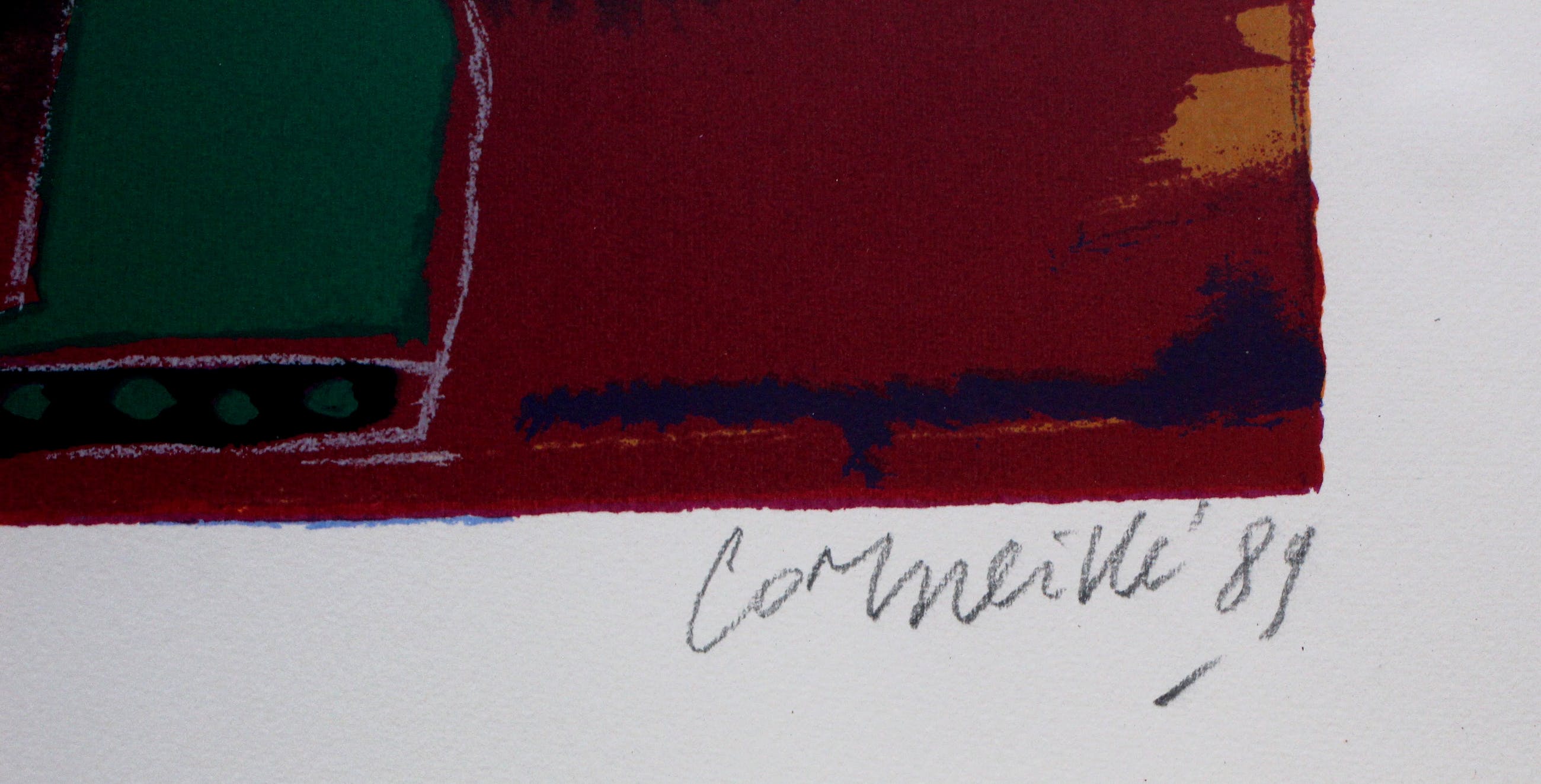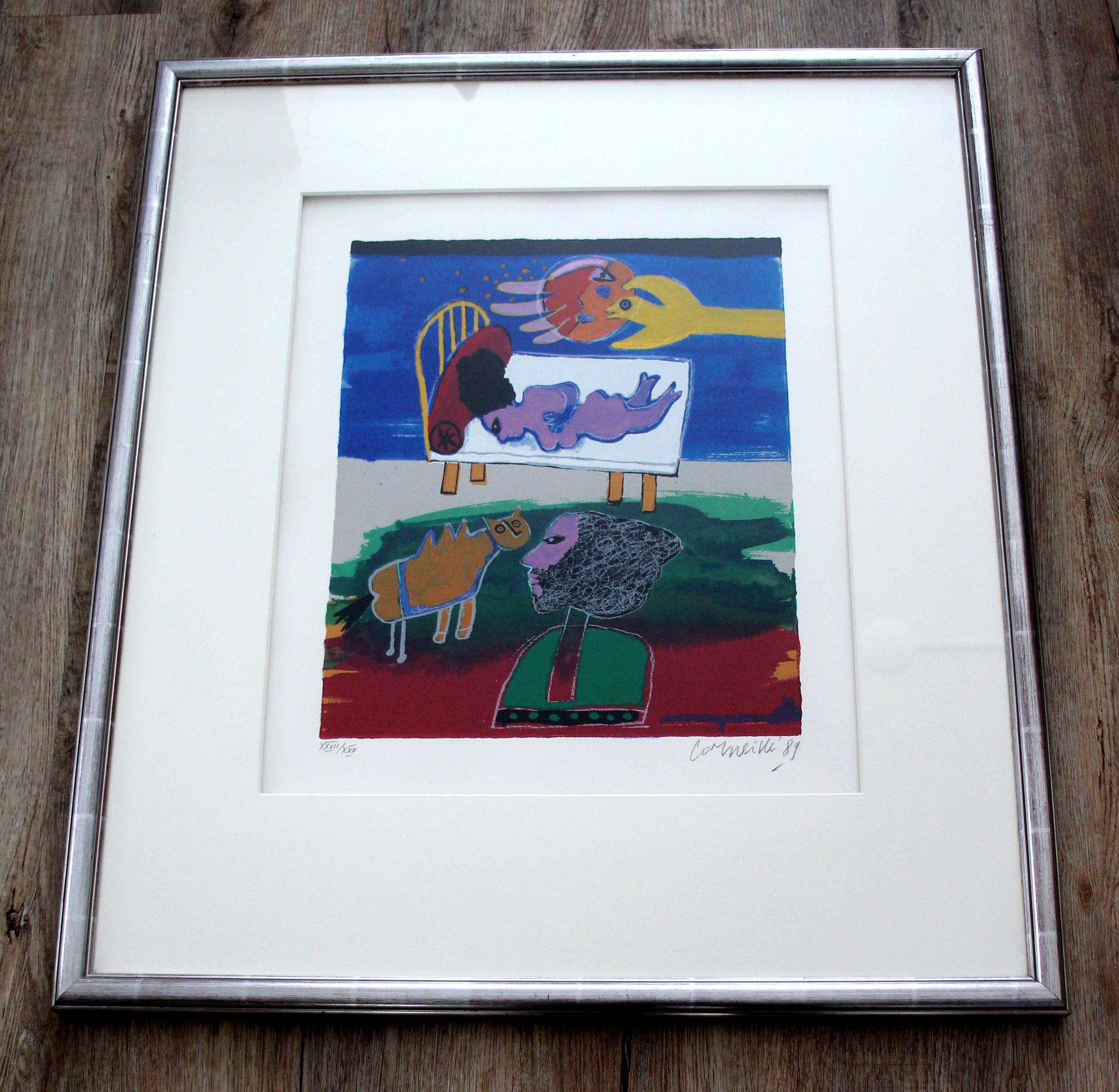 Ingelijste litho van Corneille. Titel: Six reives peints. Jaar: 1989. Nummer: XXVII/XXX  Afmetingen incl lijst: H85 x b73cm. Afmetingen voorstelling: H44 x b36,5cm. Het werk is rechtsonder gesigneerd door de kunstenaar. De authenticiteit van dit werk wordt volledig gegarandeerd. Een certificaat van echtheid kan, op aanvraag, worden gemaild.