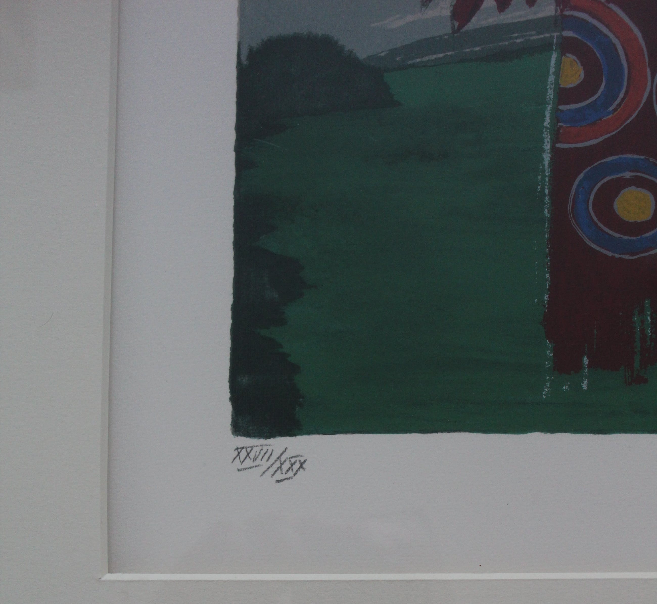 Ingelijste litho van Corneille. Titel: Six reives peints. Jaar: 1989. Nummer: XXVII/XXX Afmetingen incl lijst: H85 x b73cm. Afmetingen voorstelling: H44 x b36,5cm. Het werk is rechtsonder gesigneerd door de kunstenaar. De authenticiteit van dit werk wordt volledig gegarandeerd. Een certificaat van echtheid kan, op aanvraag, worden gemaild.