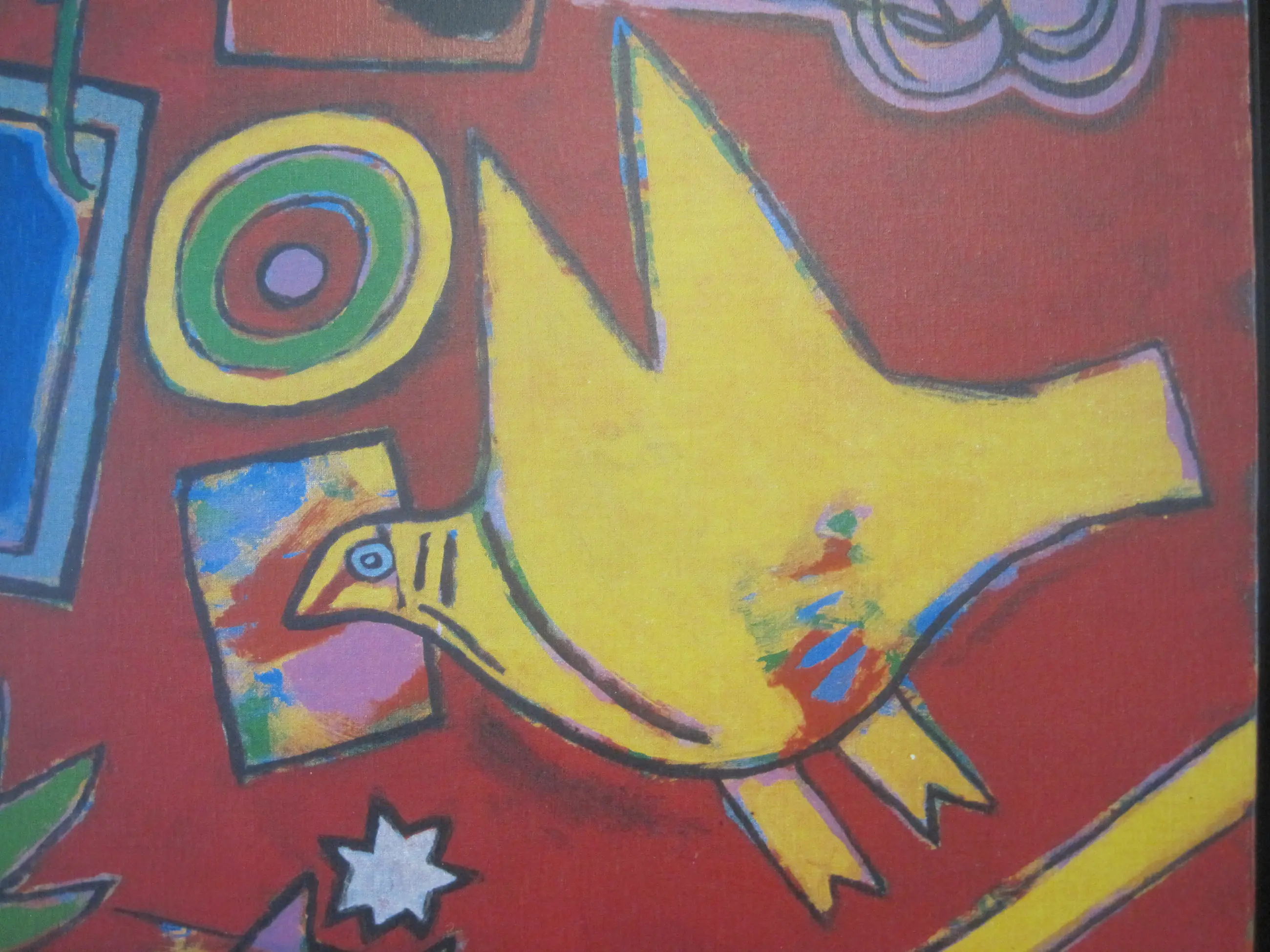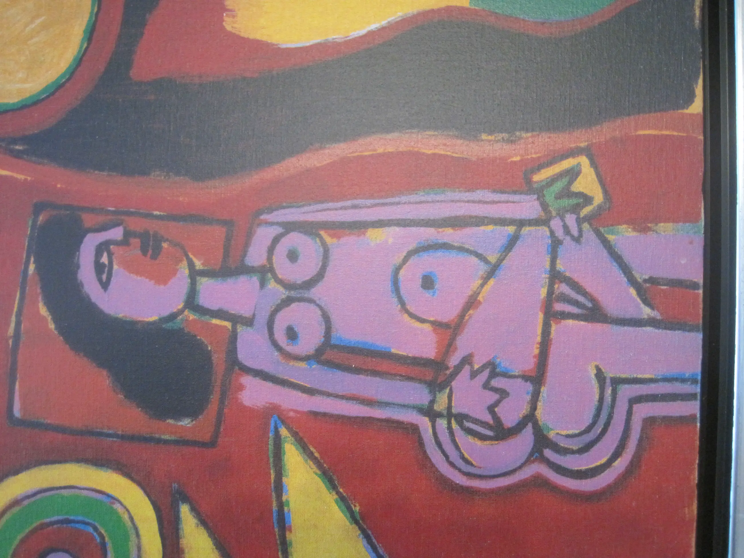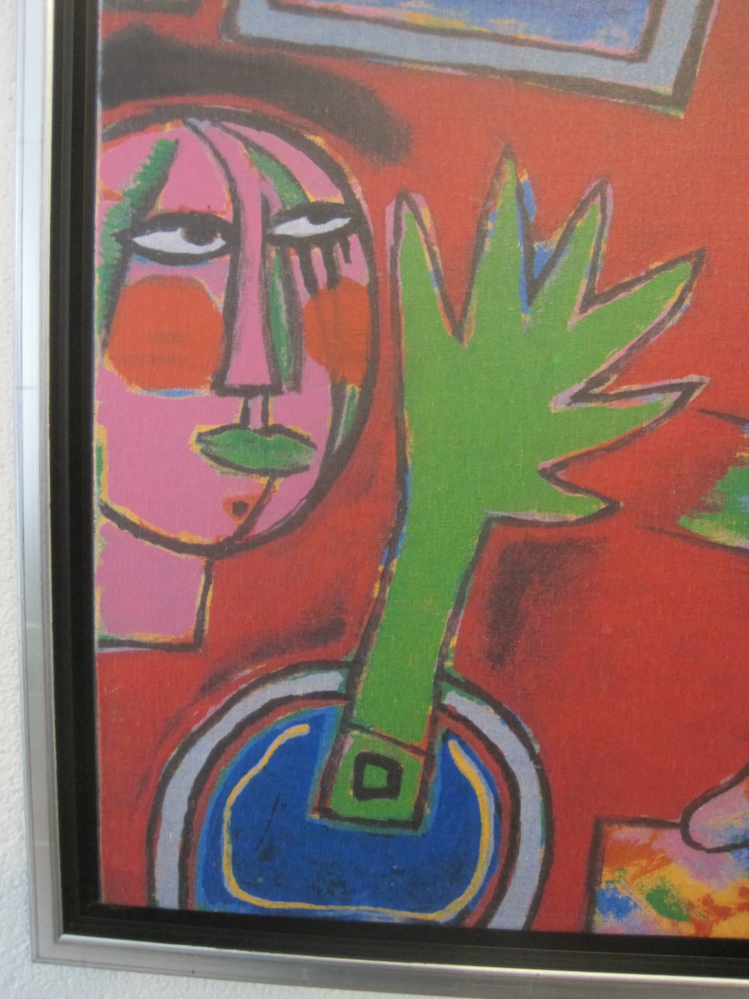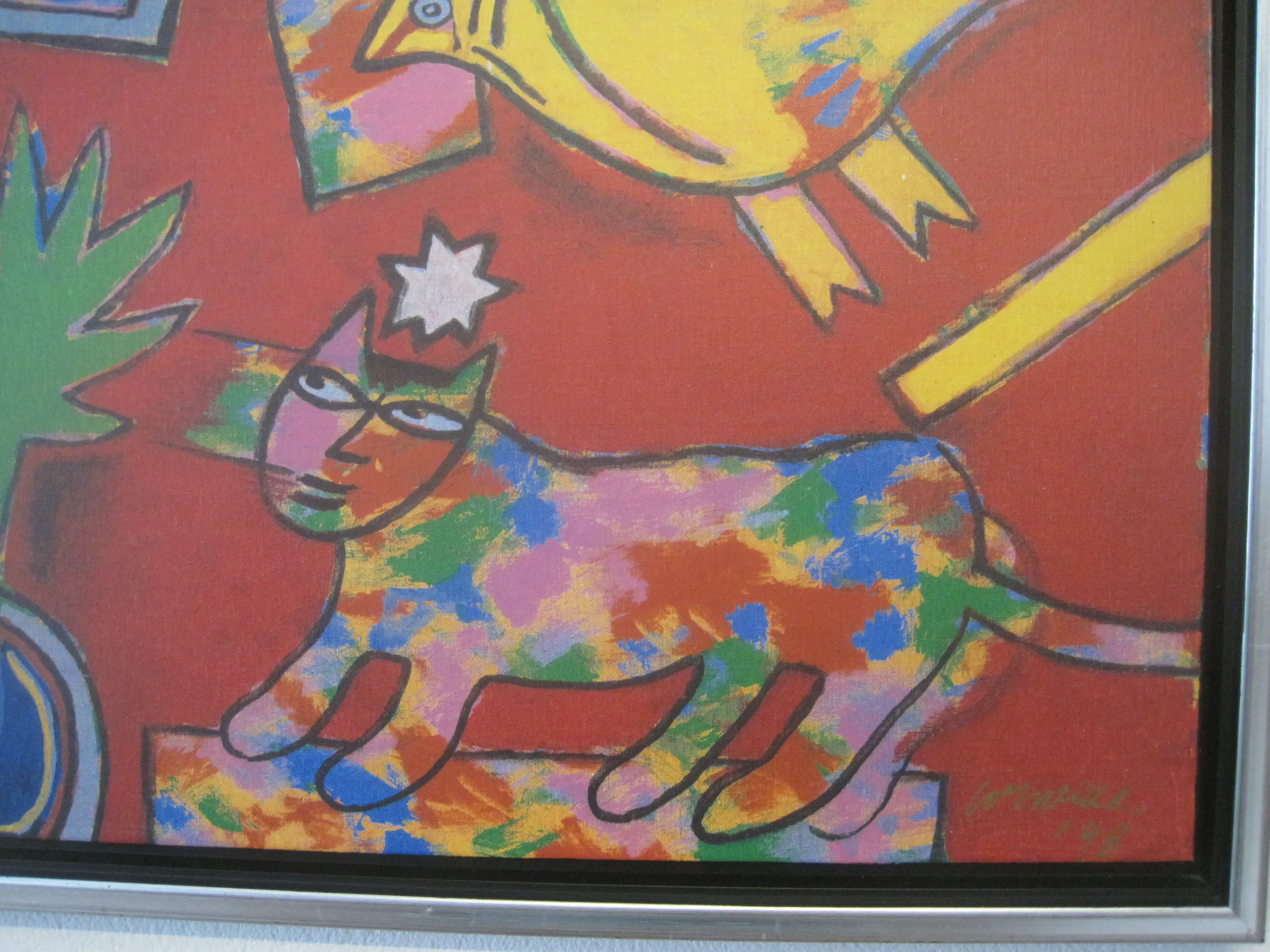 Kleurrijke zeefdruk op linnen door Corneille (Cornelis Guillaume van Beverloo-1922-2010 ). Lid van de kunstgroep Cobra. Deze zeefdruk kan alleen worden opgehaald in Veldhoven ivm de kwetsbaarheid. In overleg is brengen ook mogelijk.