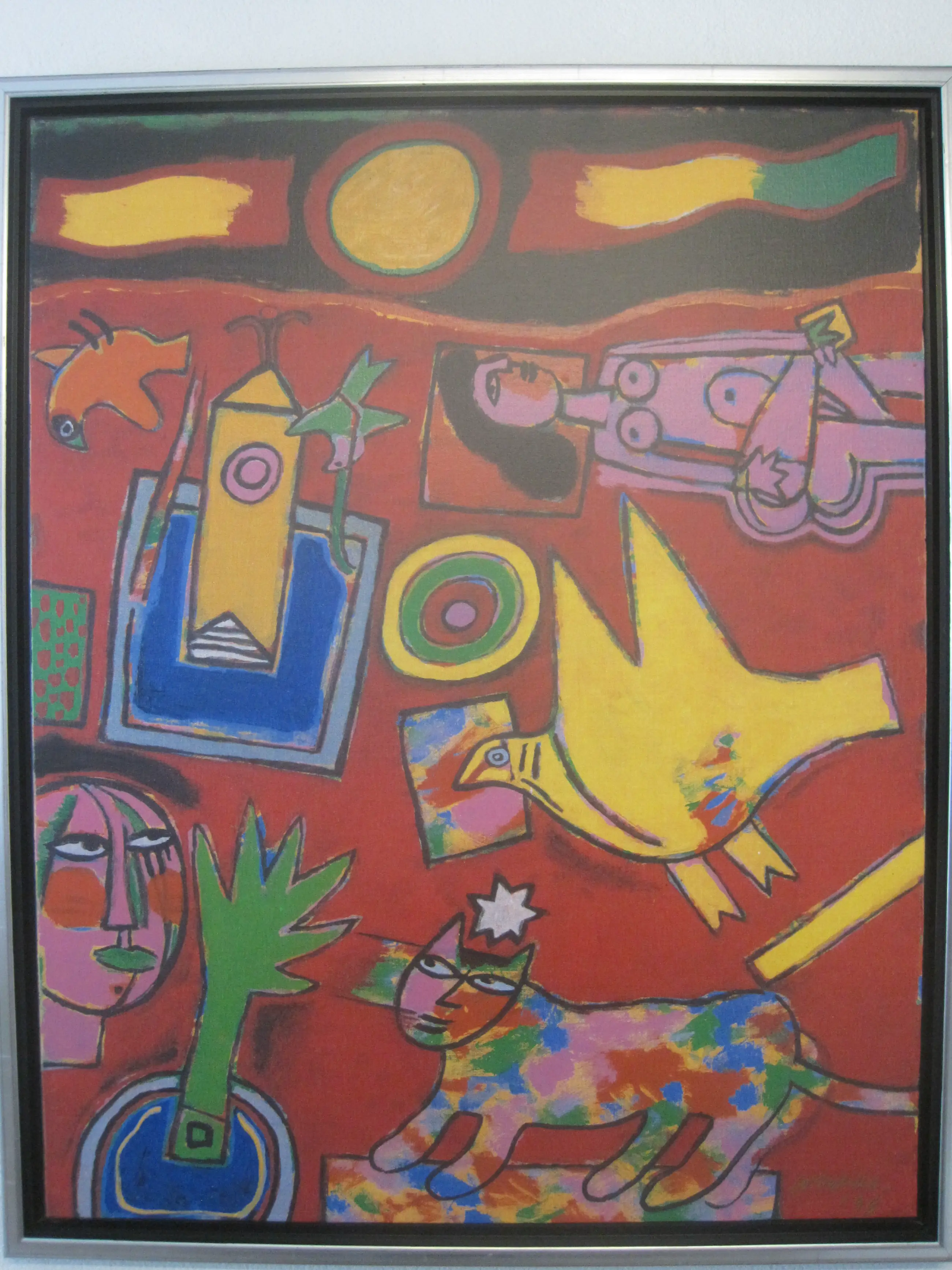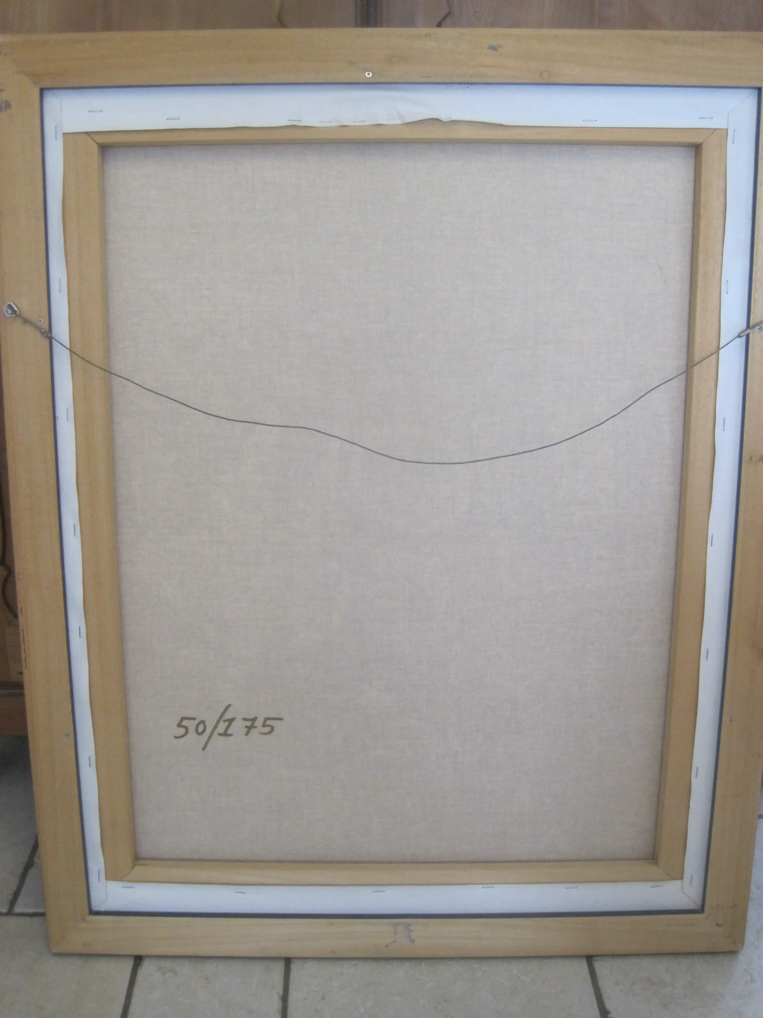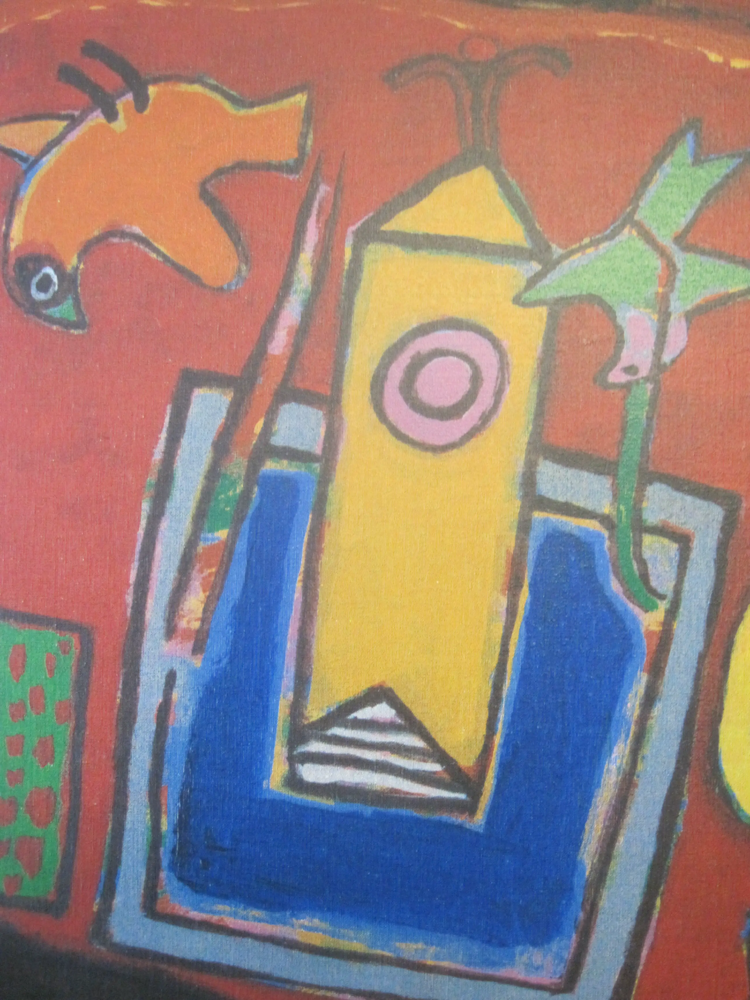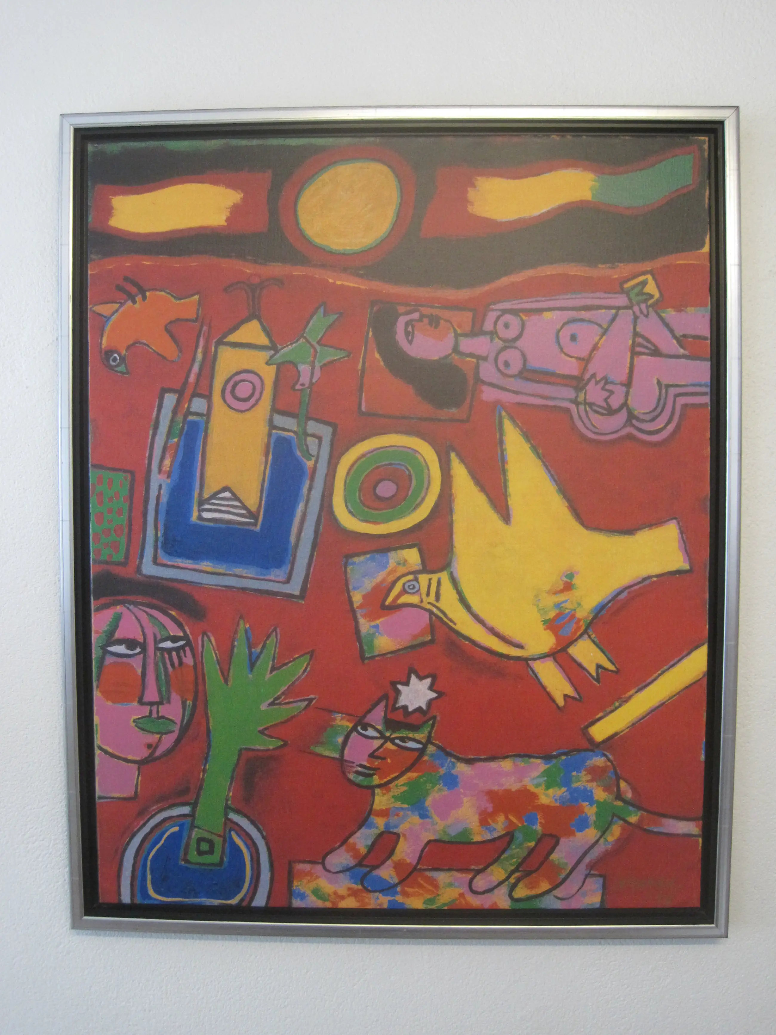 Kleurrijke zeefdruk op linnen door Corneille (Cornelis Guillaume van Beverloo-1922-2010 ). Lid van de kunstgroep Cobra. Deze zeefdruk kan alleen worden opgehaald in Veldhoven ivm de kwetsbaarheid. In overleg is brengen ook mogelijk.